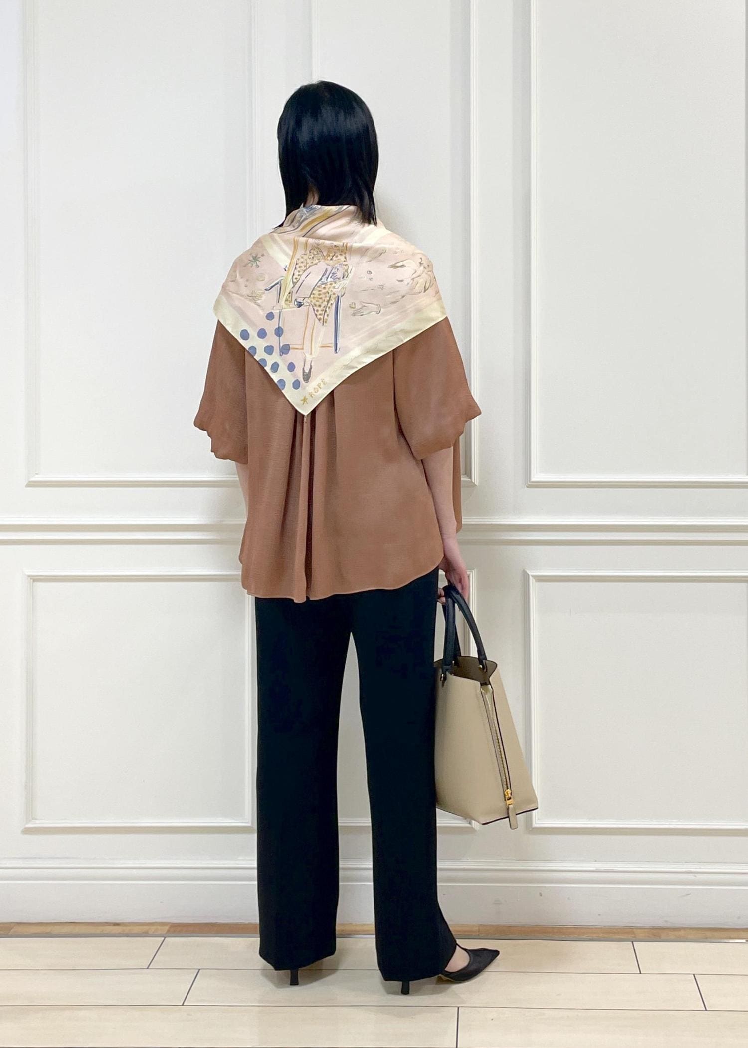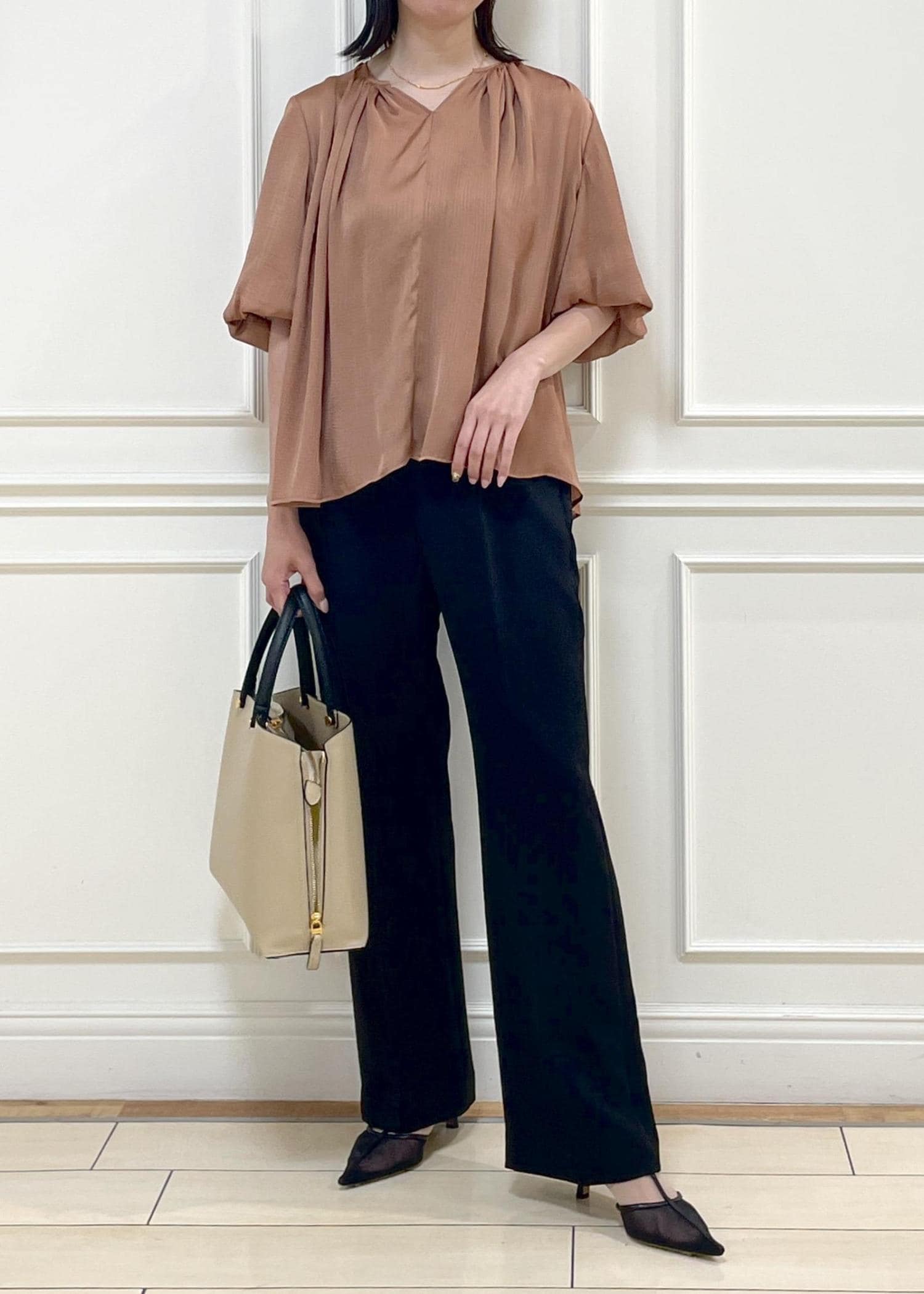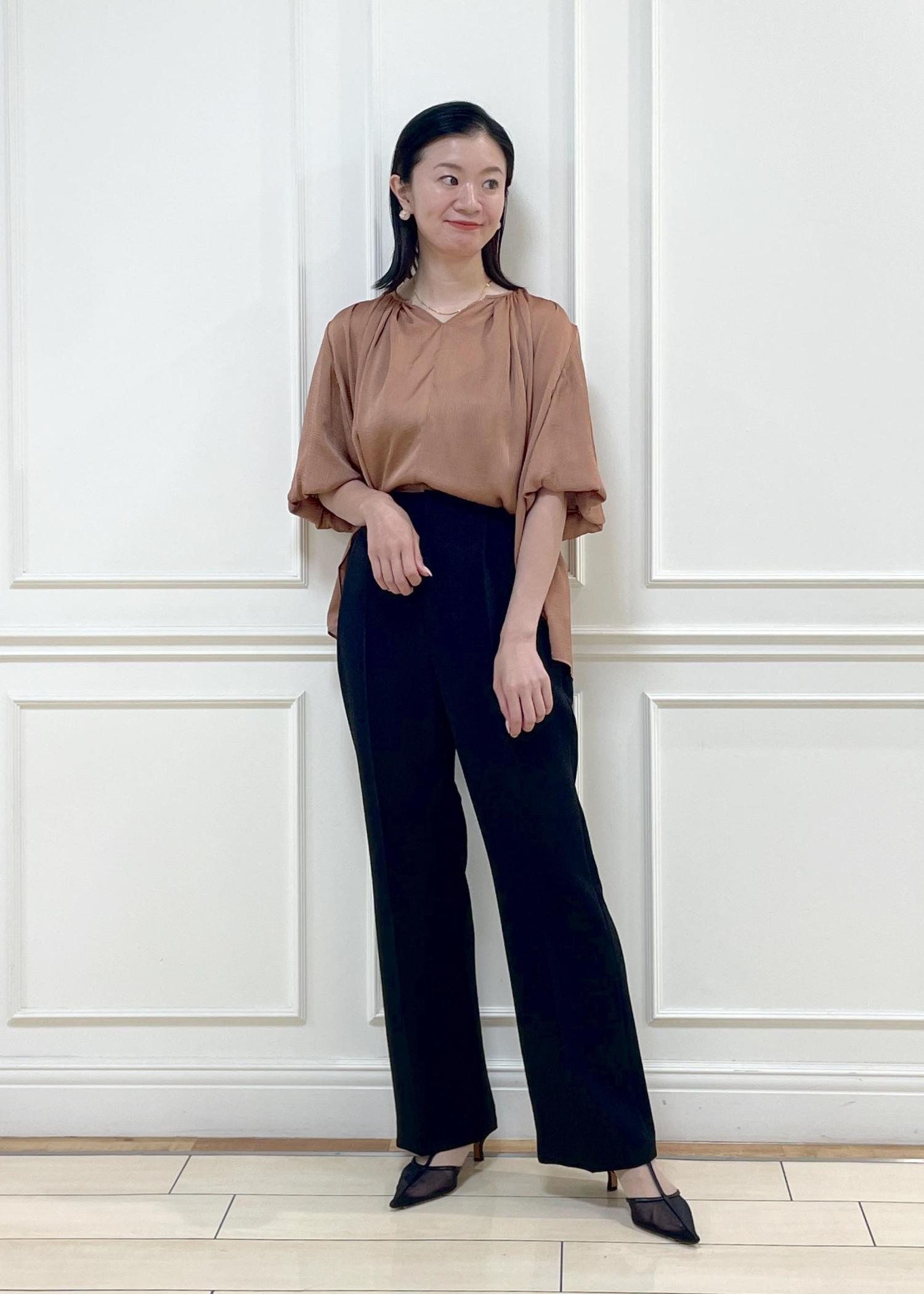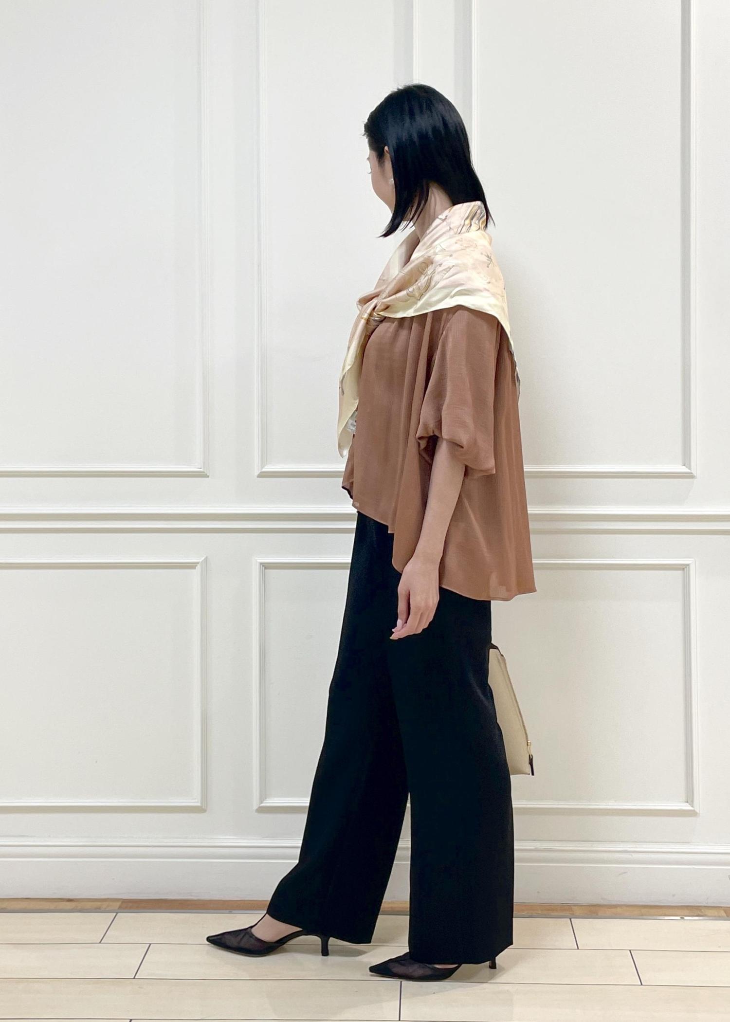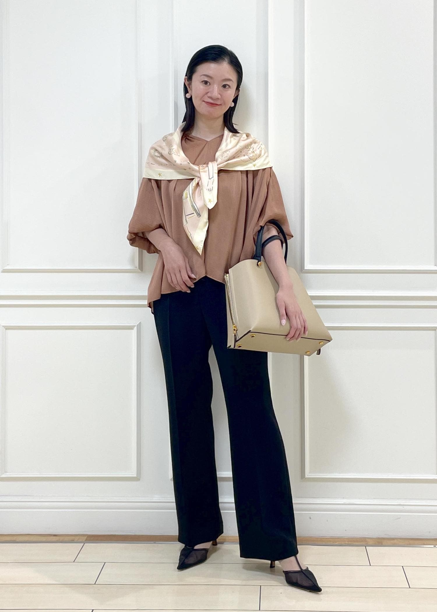 ゆったりとしたシルエットが魅力の楊柳ブラウスに、スッキリとしたシルエットのボトムスを合わせたコーディネート。