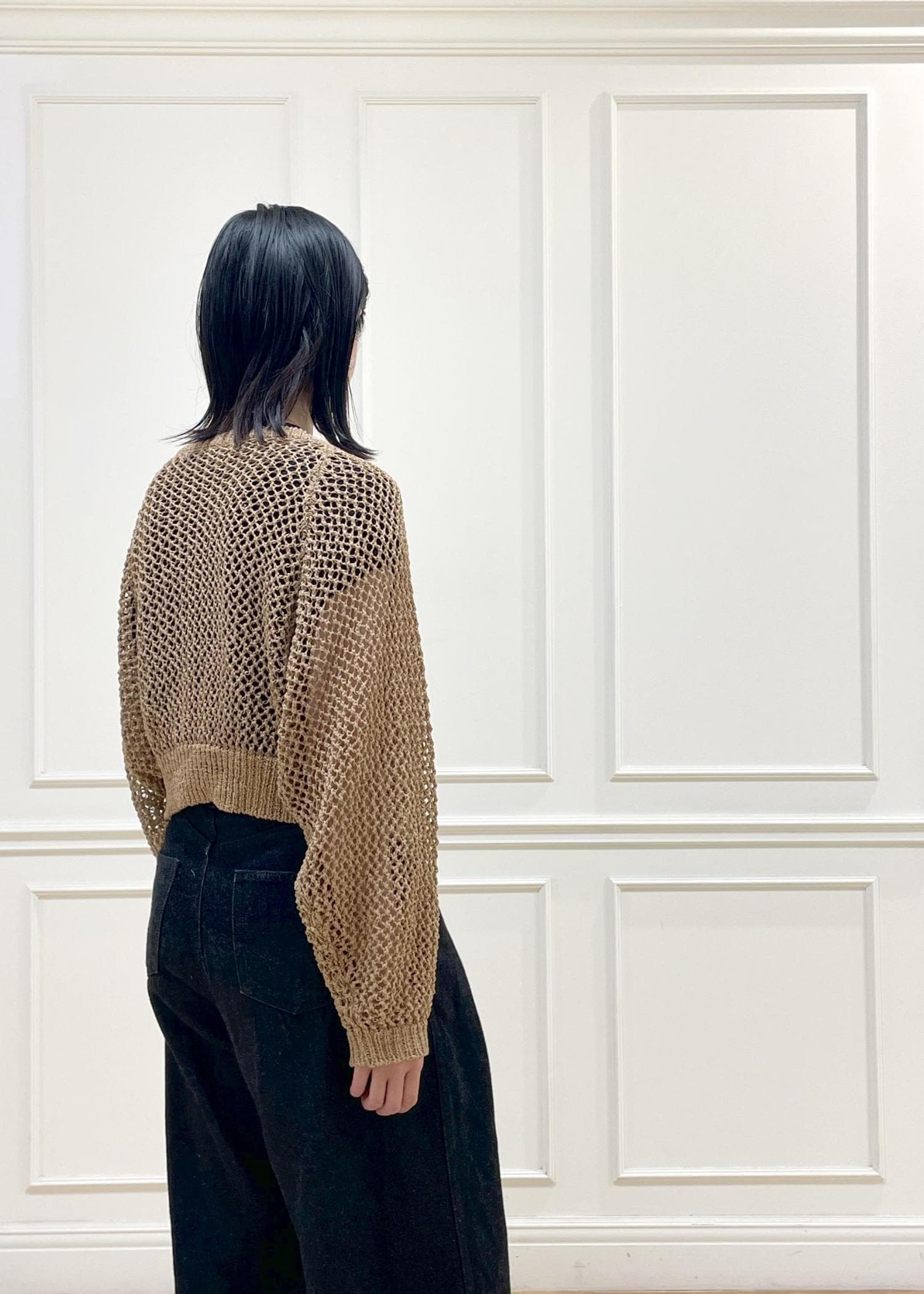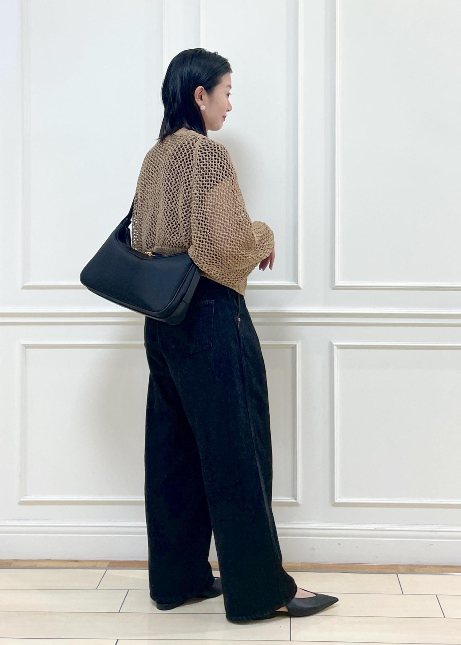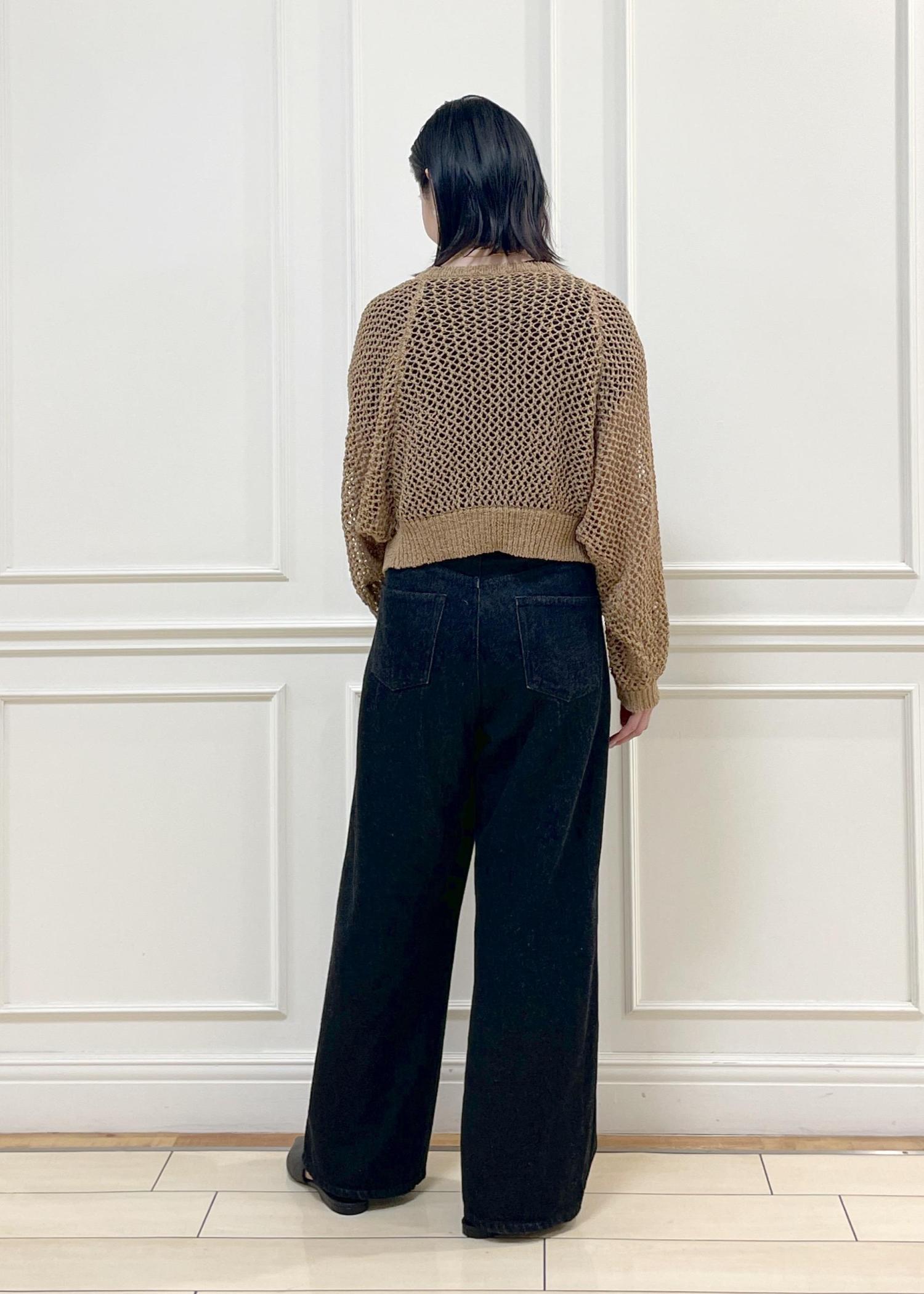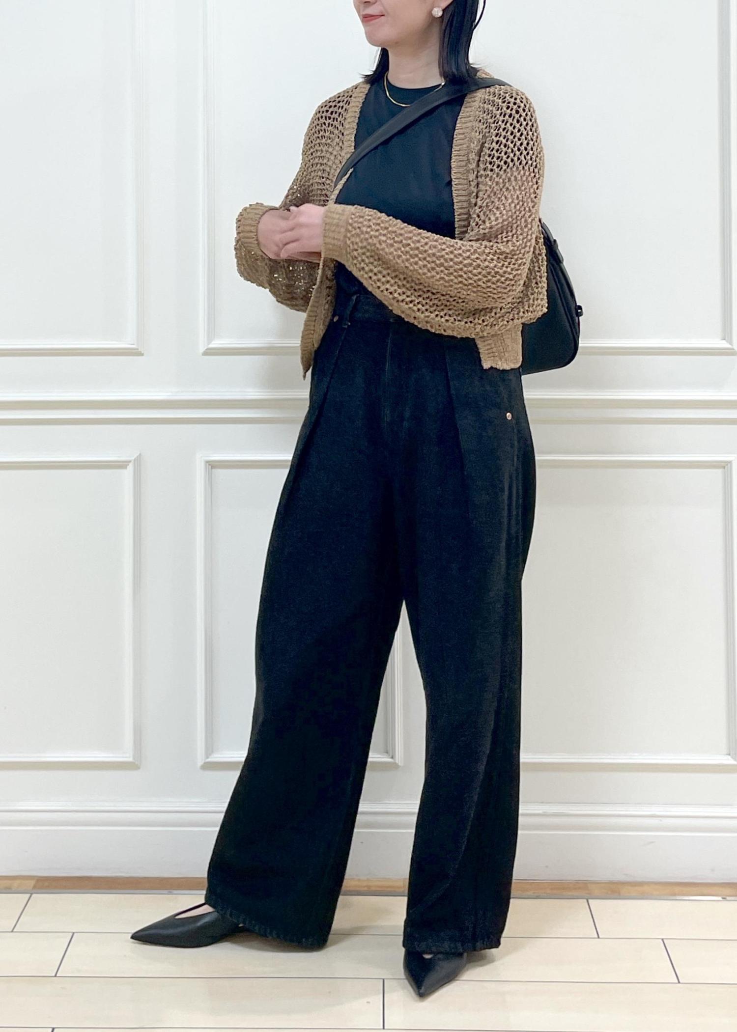 大きめのメッシュ編みが特徴的なボレロに、程よくラフなデニムを合わせた抜け感のあるカジュアルコーディネート。