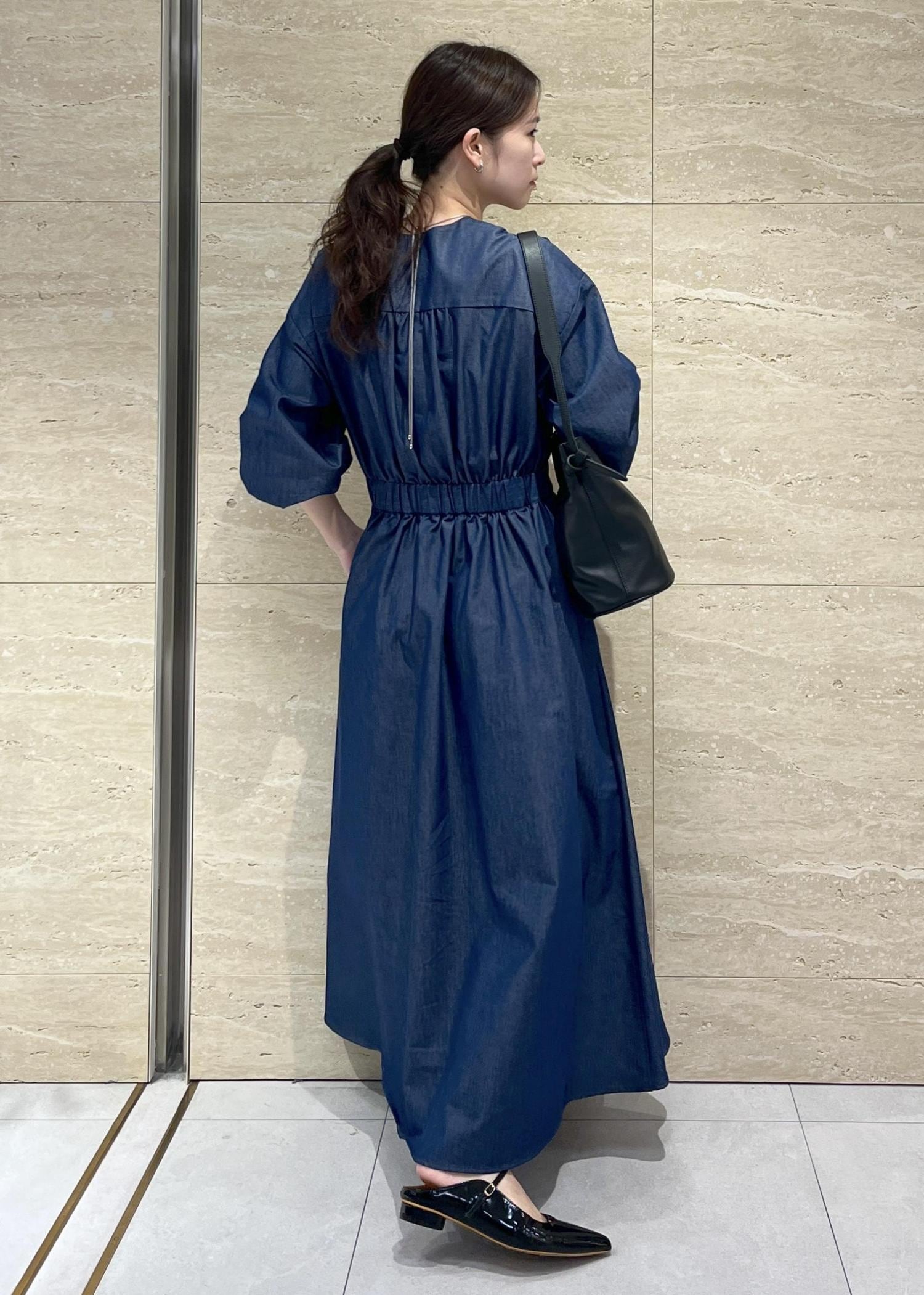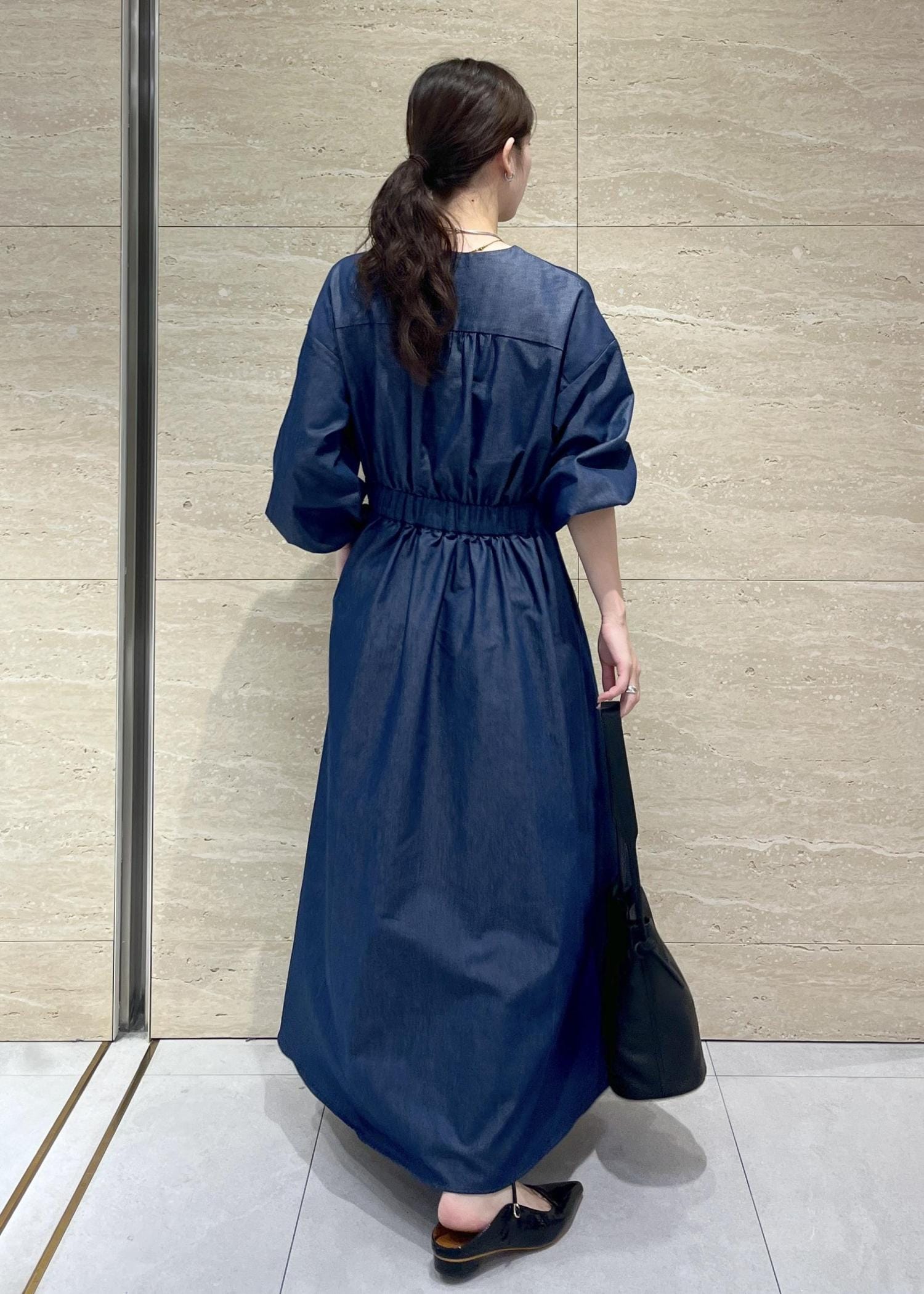 ノーカラーでスカート丈が長めなので、子供っぽくならない大人カジュアルなワンピースです。