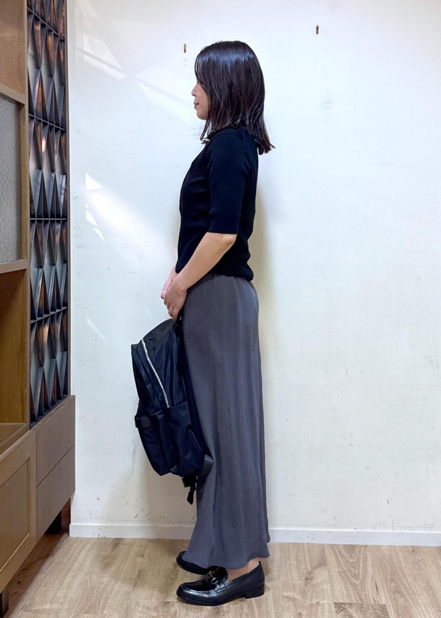 リブデザインですが体のラインに添いすぎないのでピタッとしたものが苦手な方にも取り入れやすいです。
