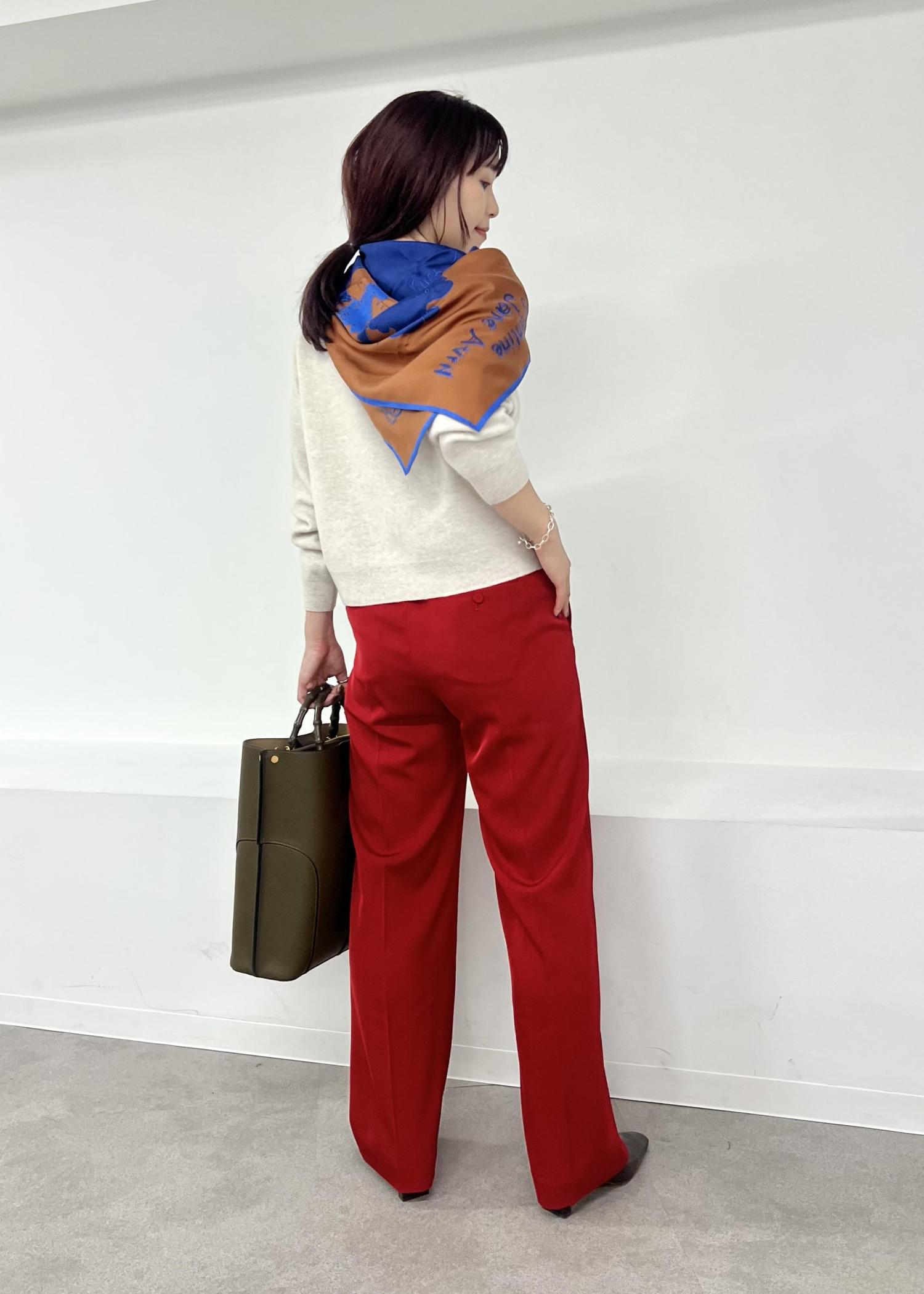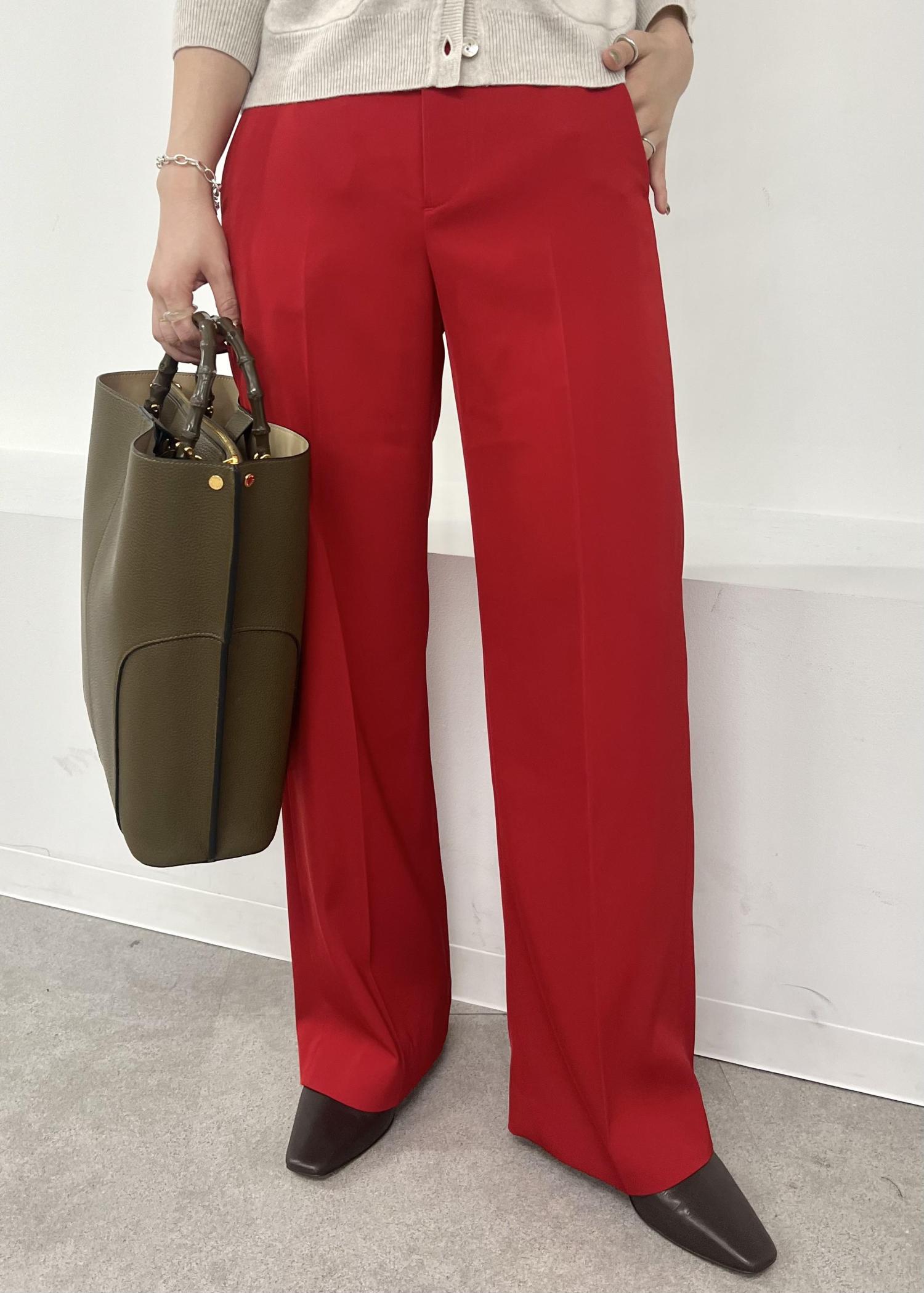 ROPÉセンタープレスパンツ(トリアセテートツイル/デニムライク)レッド / 38¥18,480レビュー普段のワイドパンツだとハイウエストでも大きく感じますが、こちらはジャストサイズでした。後ろゴムでも窮屈感もなくゆとりを持って着られて動きやすかったです◎