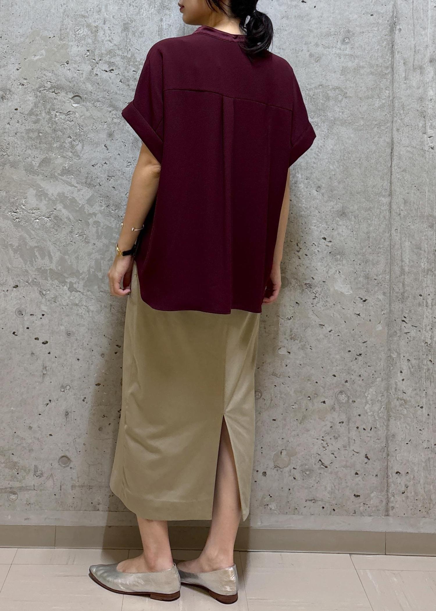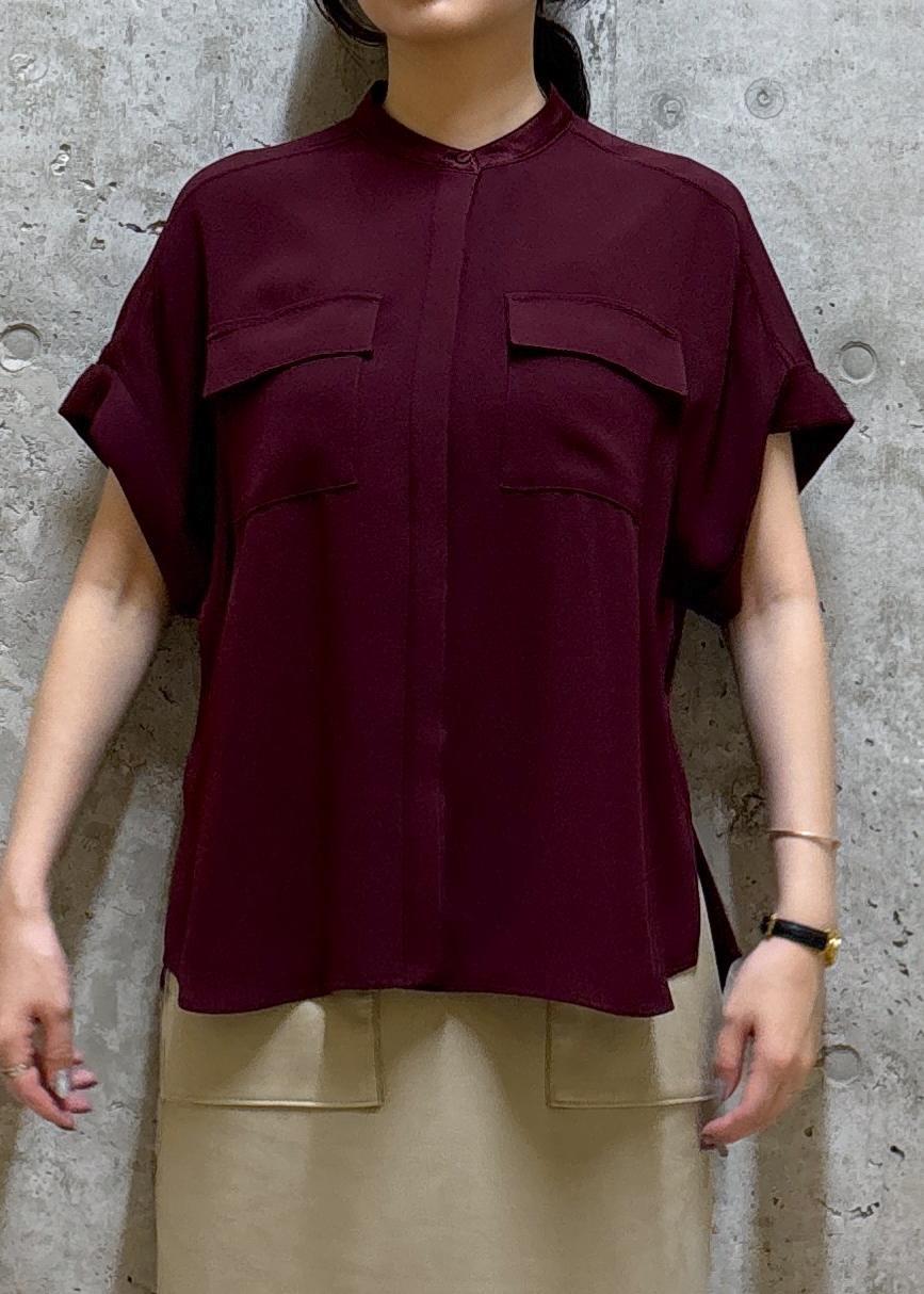 ネックはボタンを上まで留めると首元まで詰まったデザインで、二の腕が隠れる半袖で腕がすっきり細見えします。