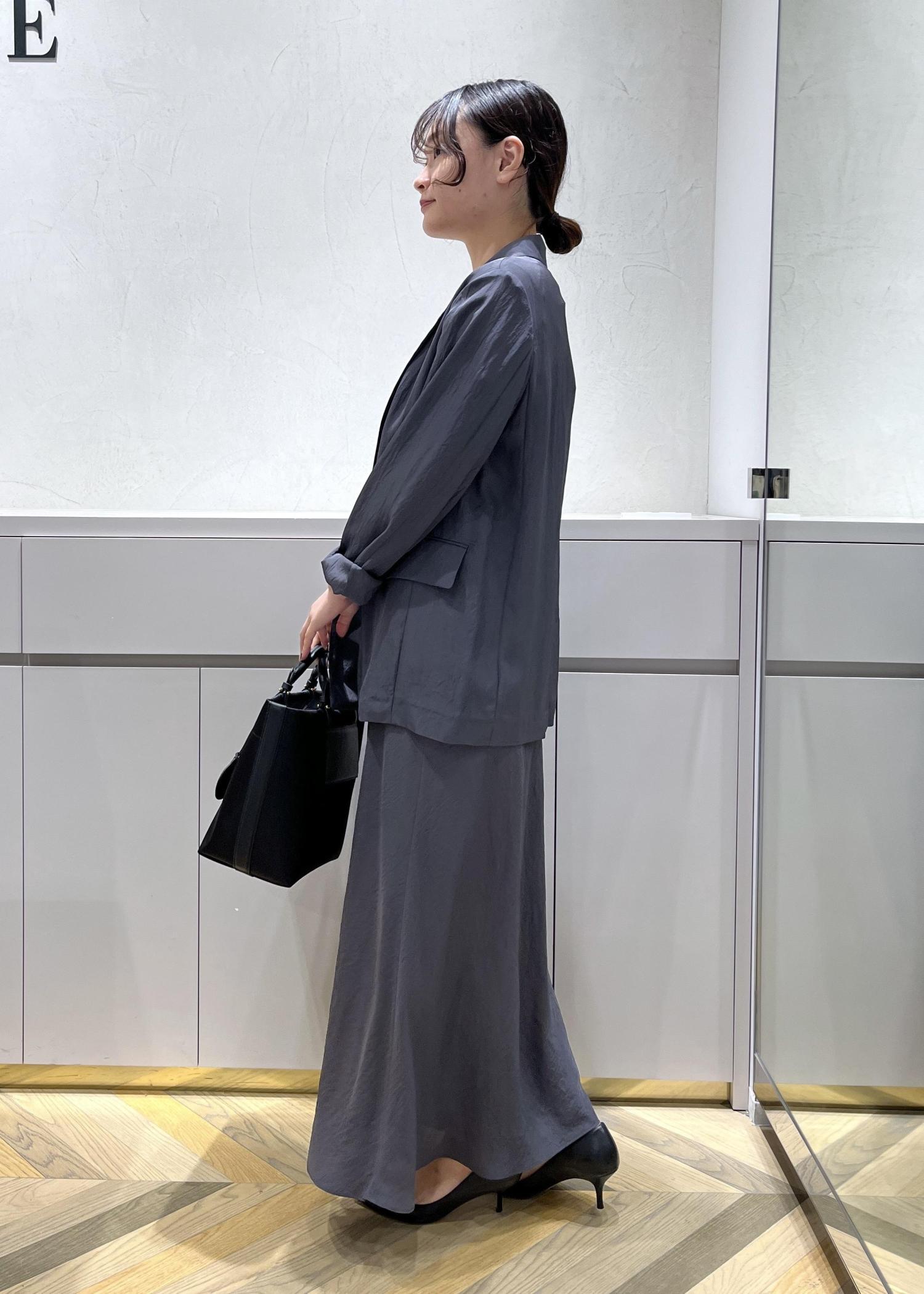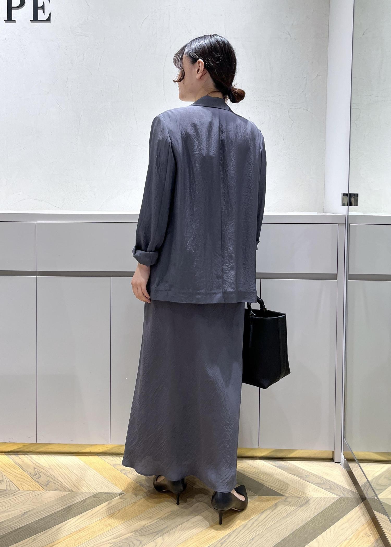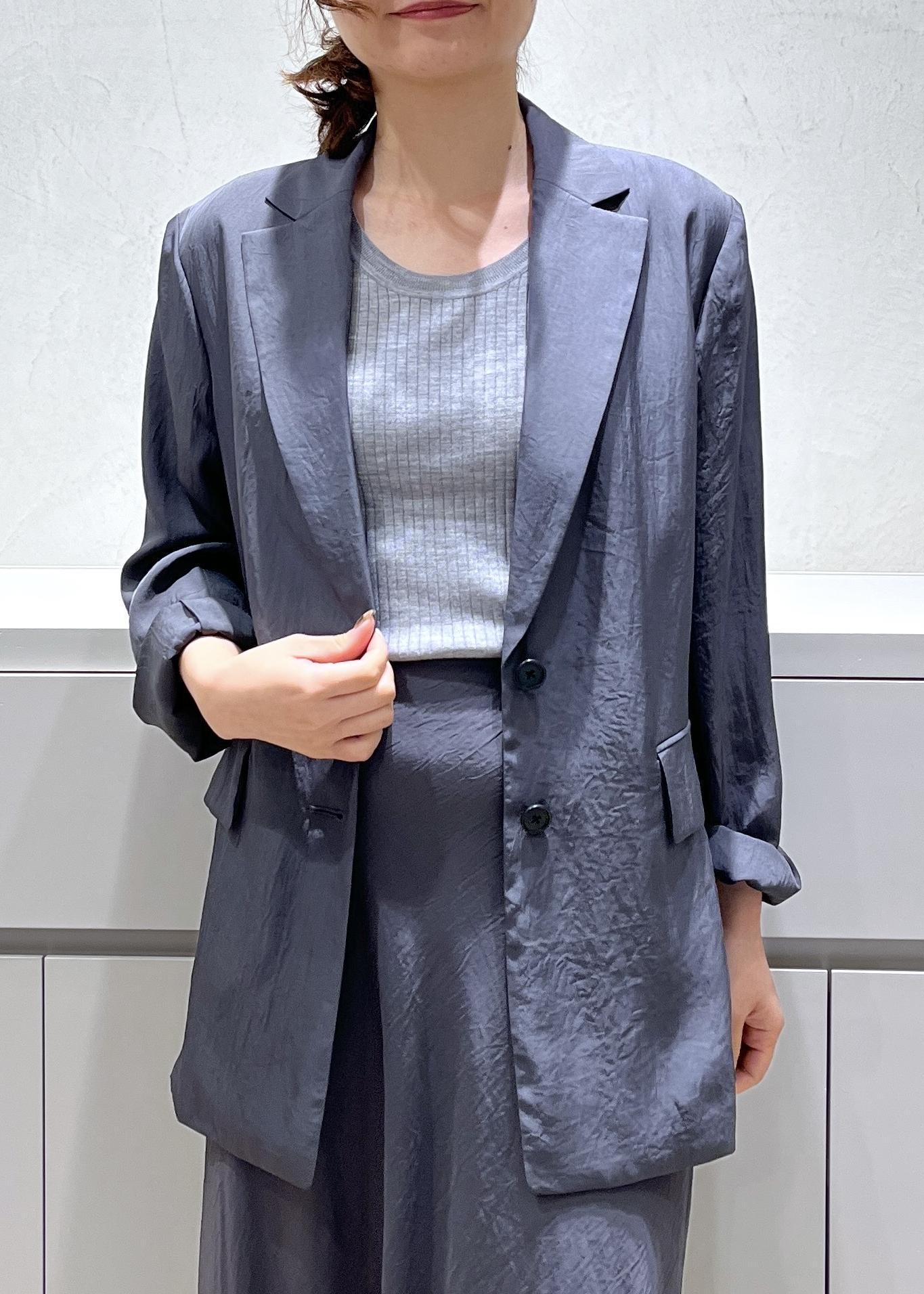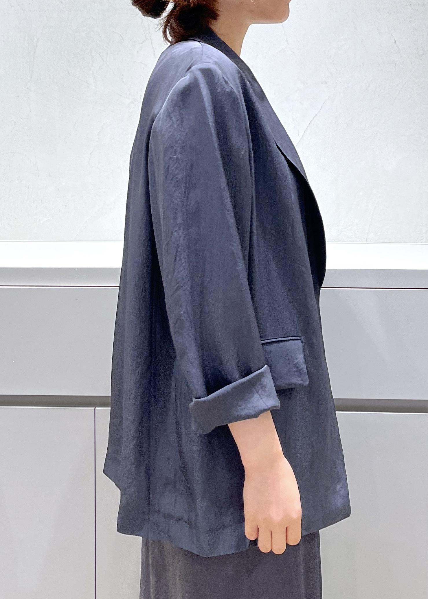 アセテートの軽い素材で、光沢とドレープ感のある生地です。カーディガン感覚で羽織れるジャケットで、季節の変わり目に重宝します◎ -