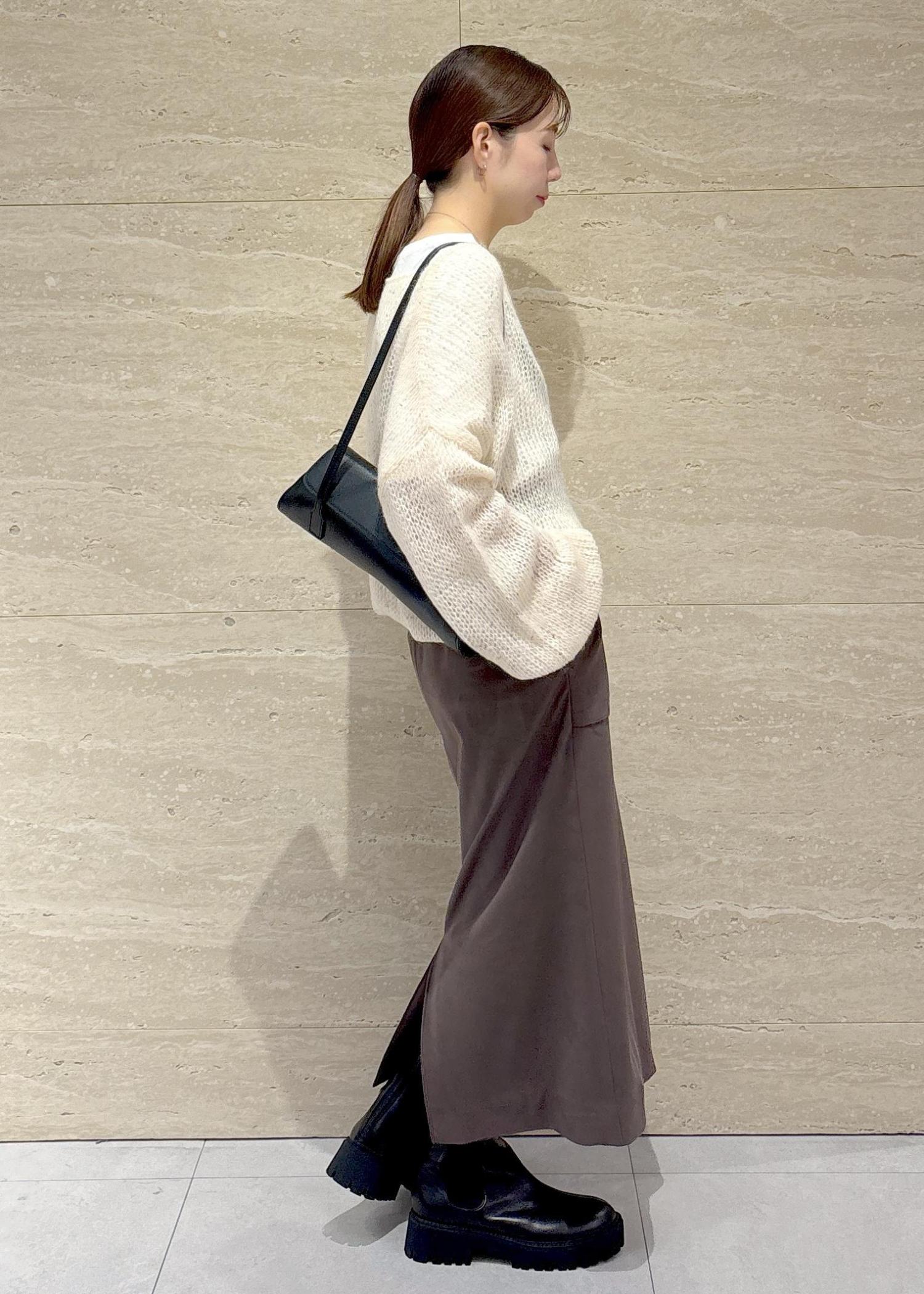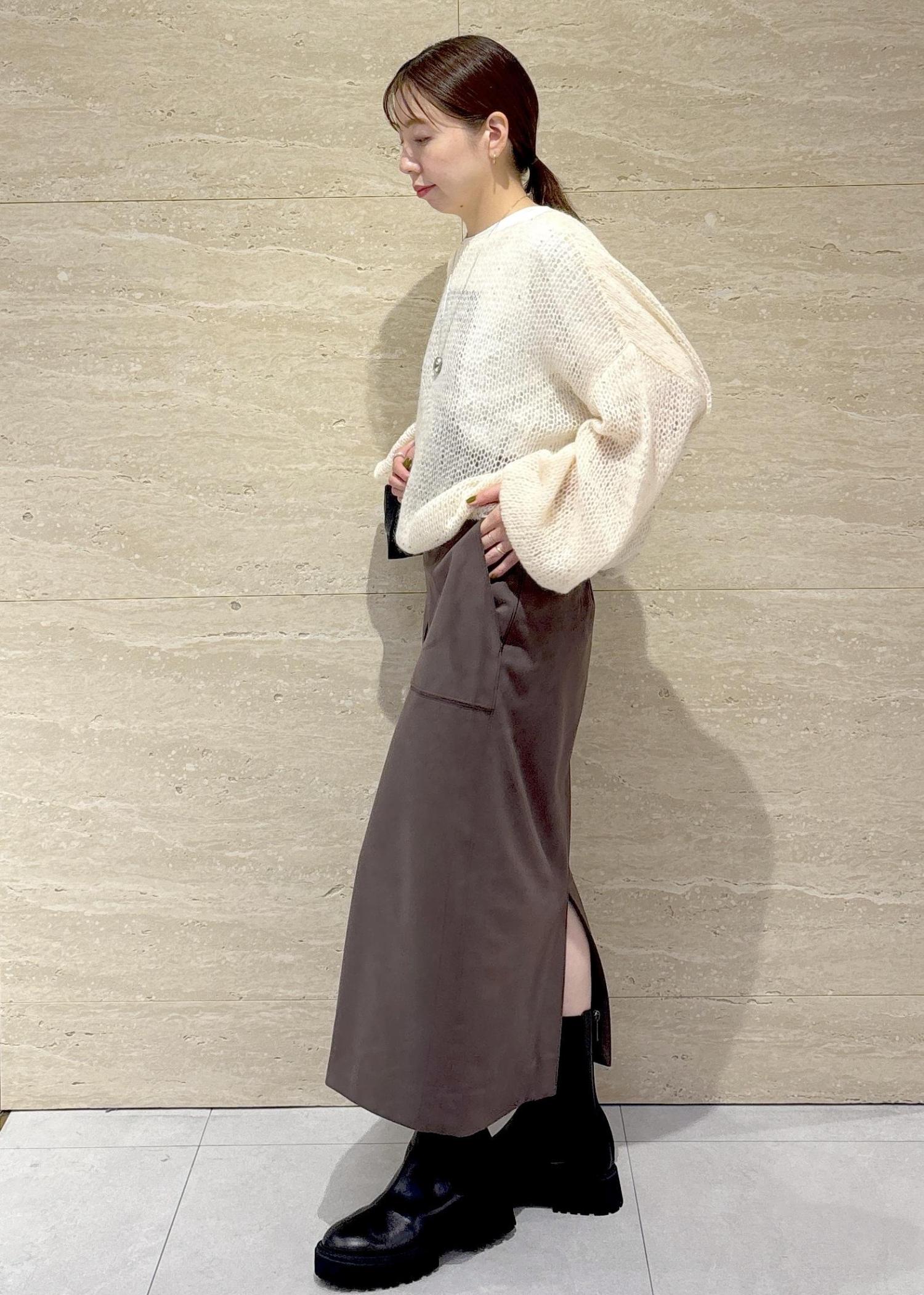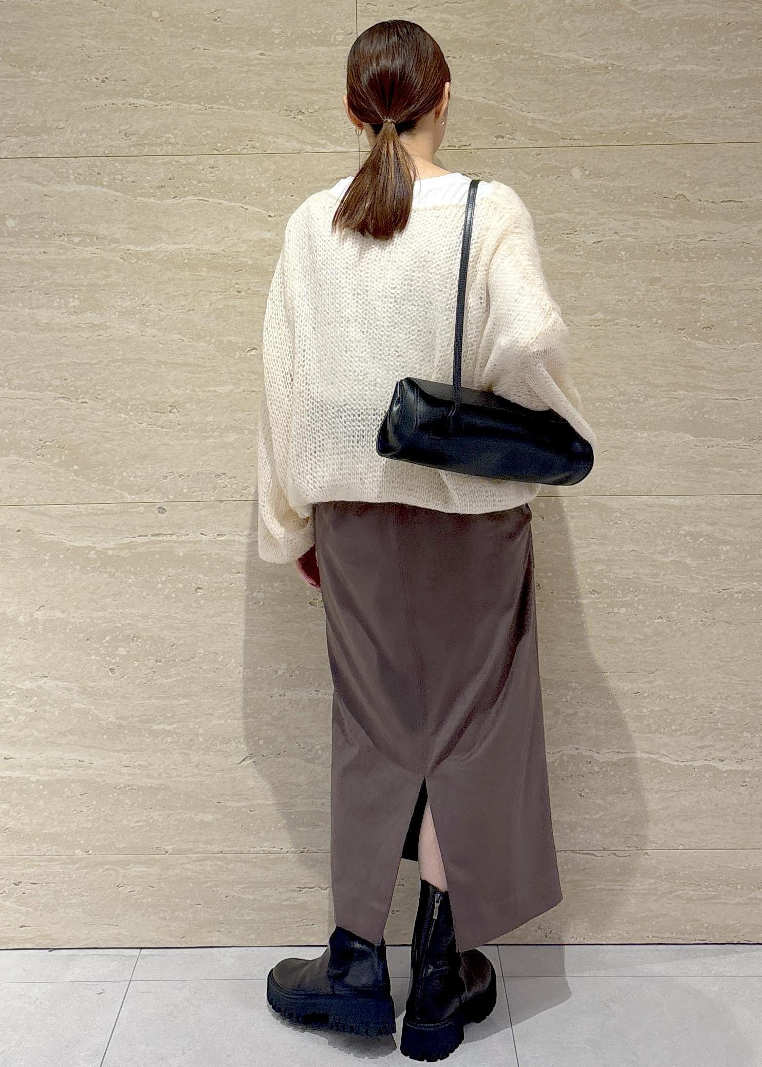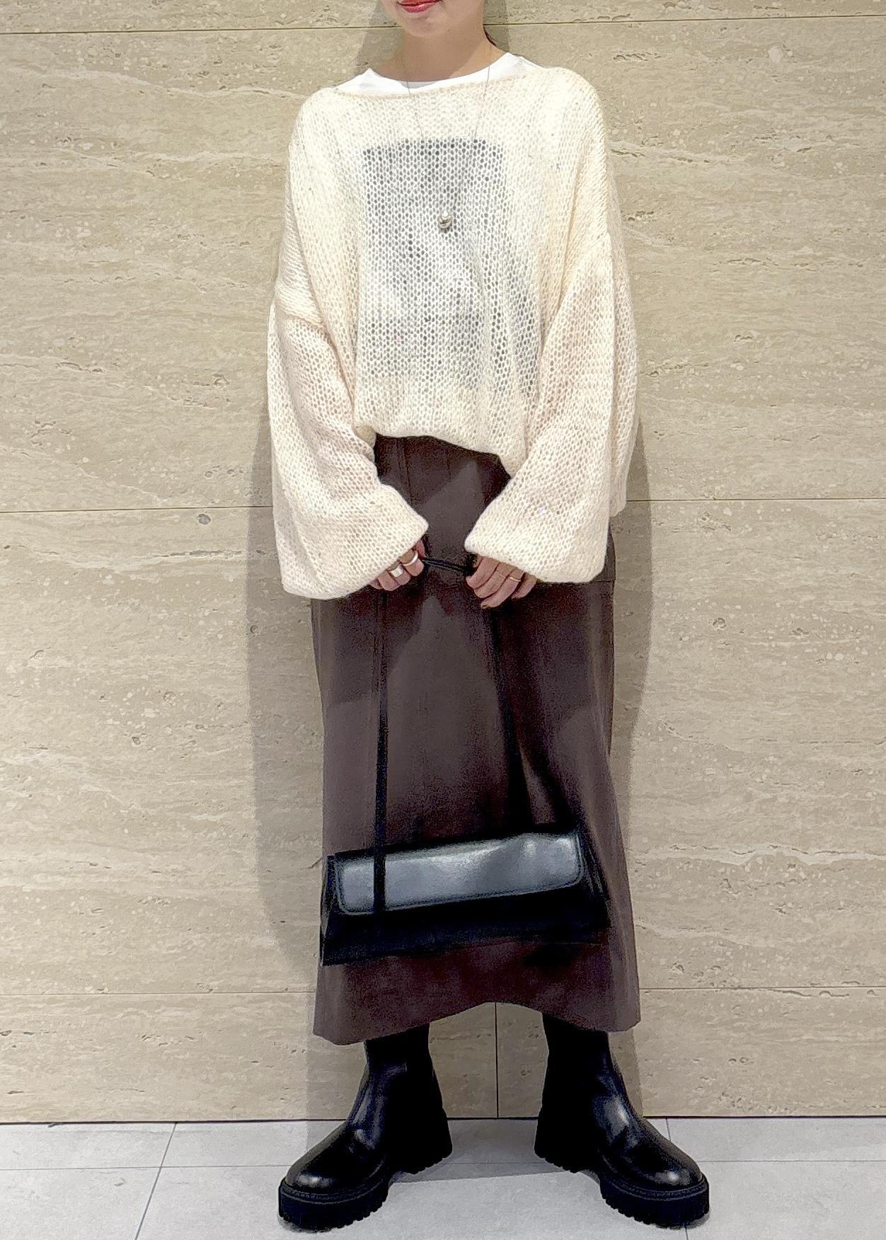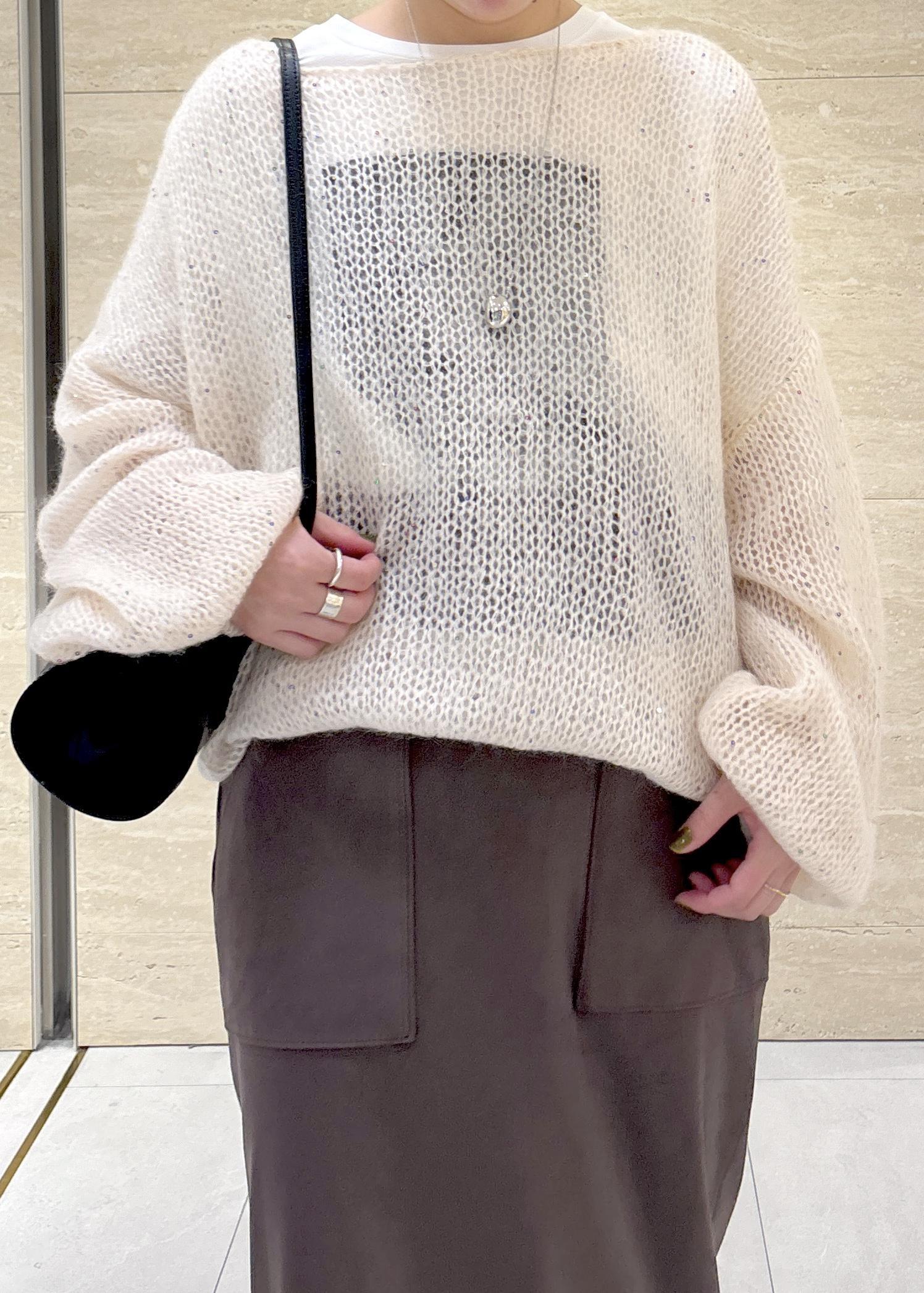 モヘアの素材とスパンコールのキラキラが可愛い存在感あるニットをメインにコーディネートしました。