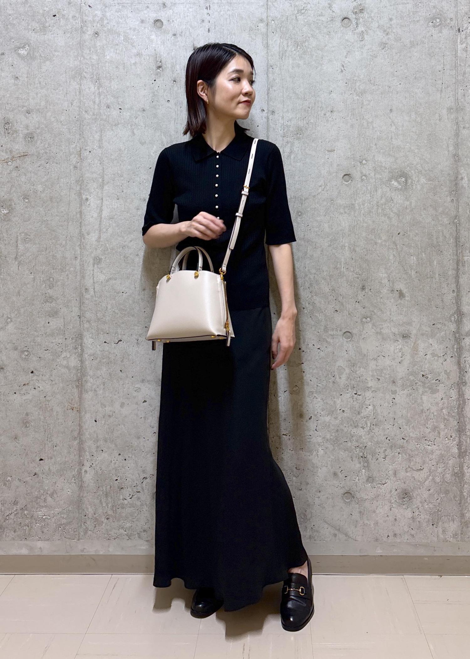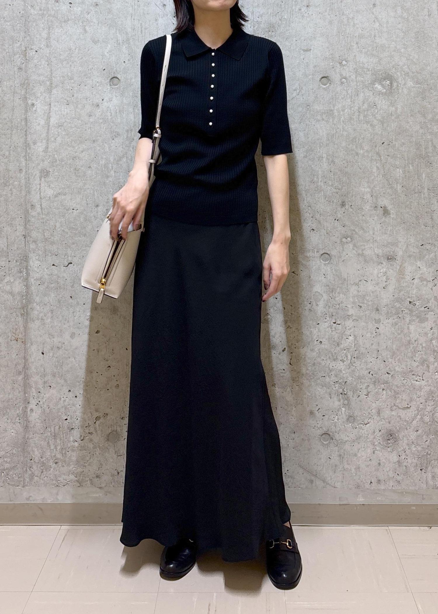 ポロニットにマーメイドスカートを合わせたキレイめカジュアルなコーディネイト。
