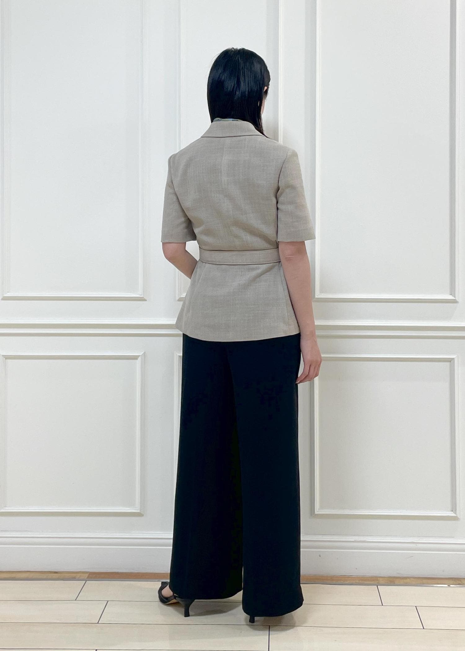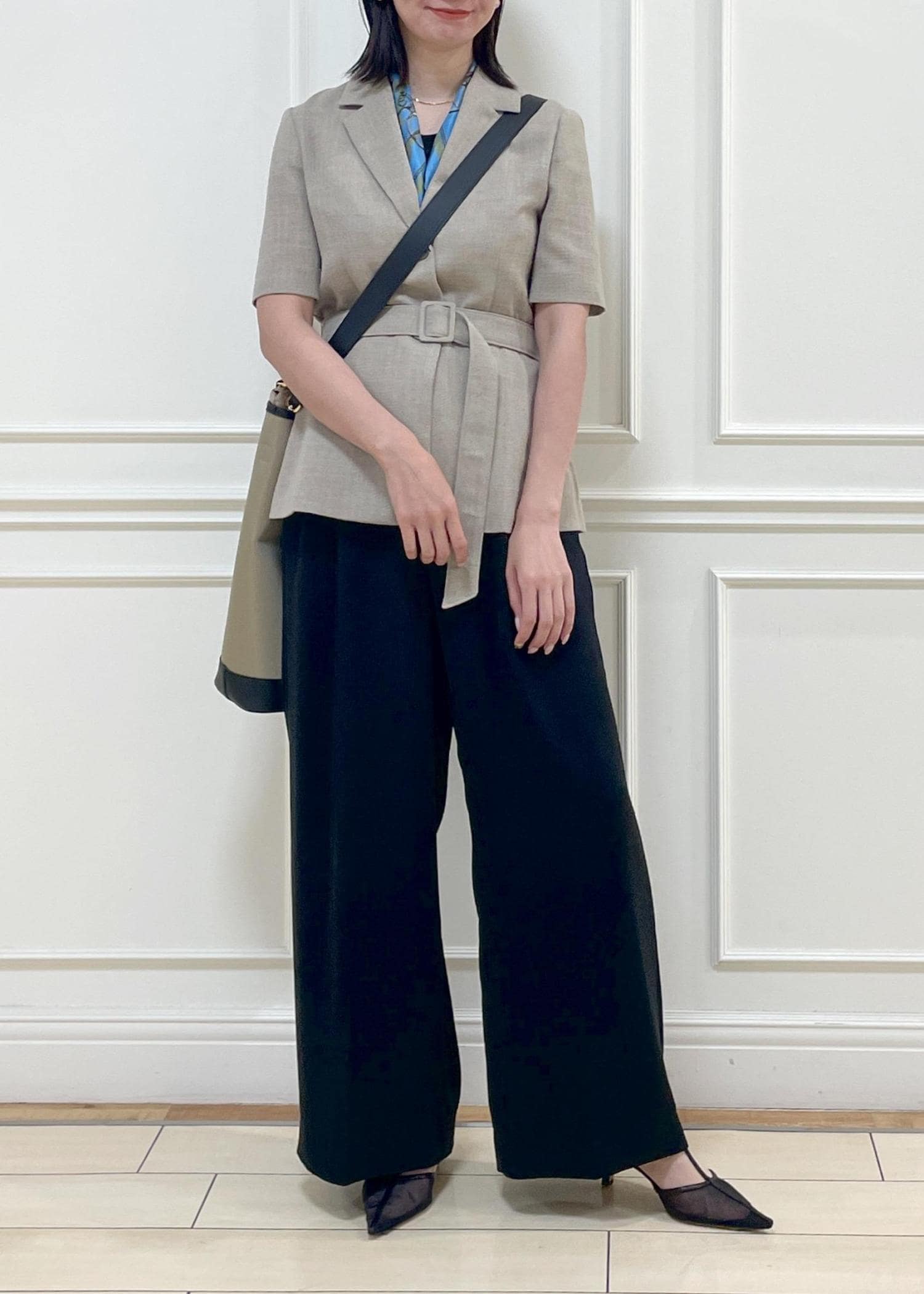 ウエストマークでスタイルアップが叶うベルト付きジャケットに、リラクシーなワイドパンツを合わせたコーデ。