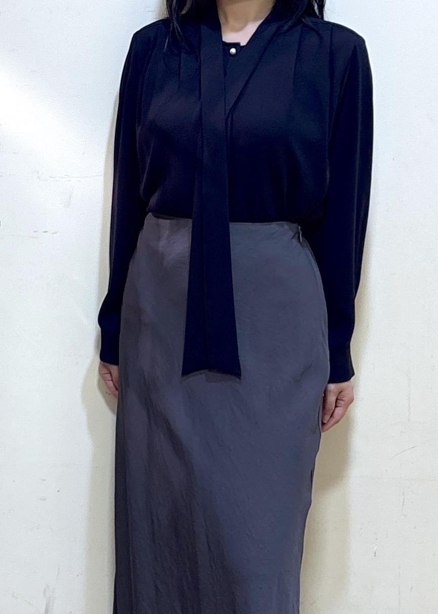 ナチュラルなツヤ感のあるネイビーブラウスは