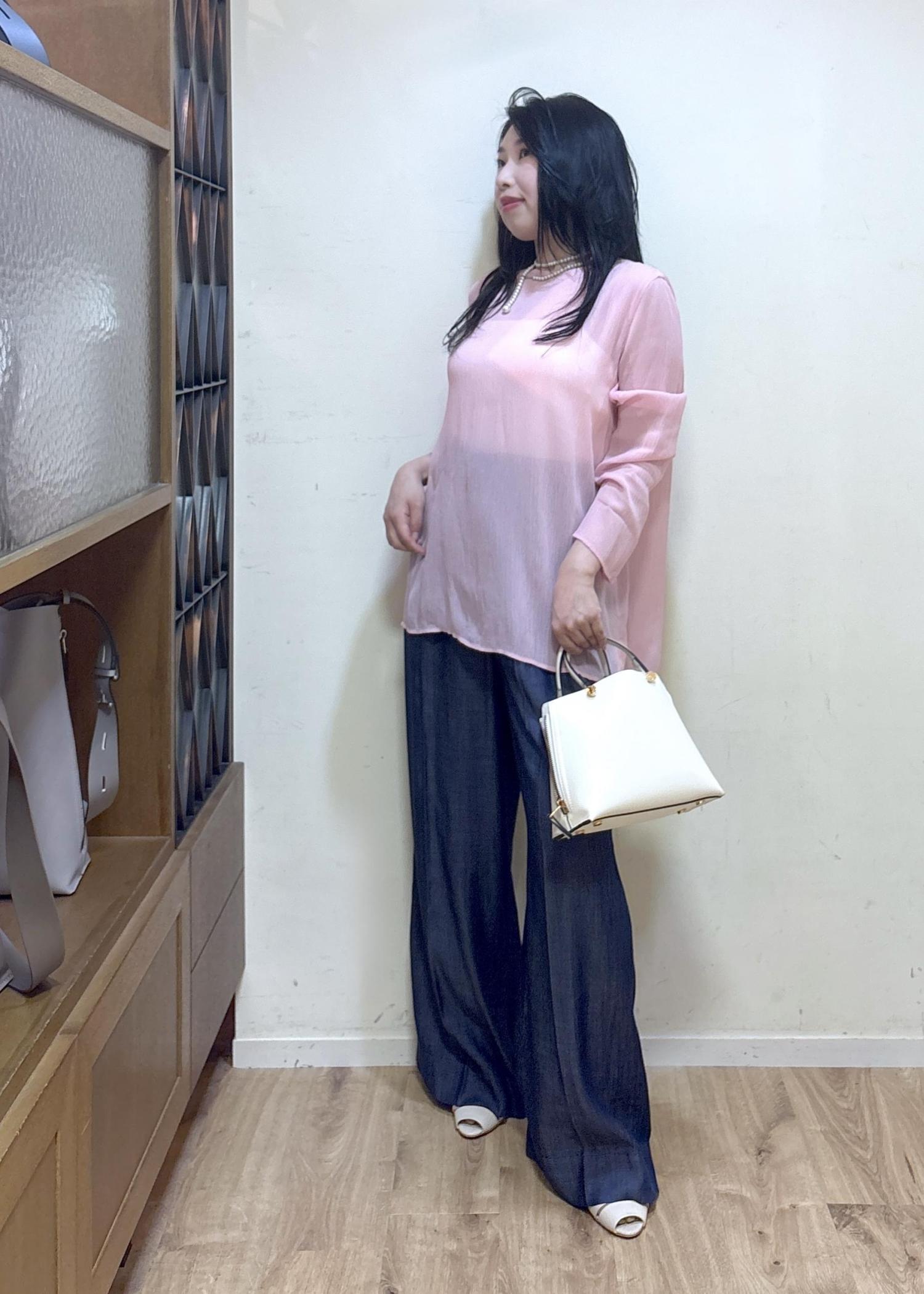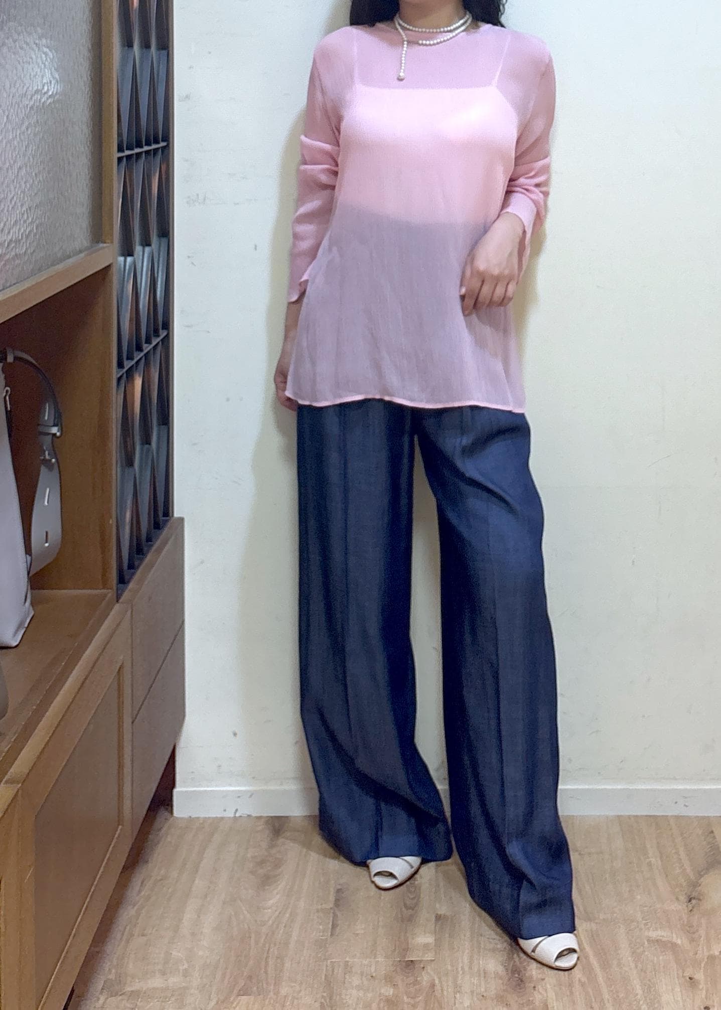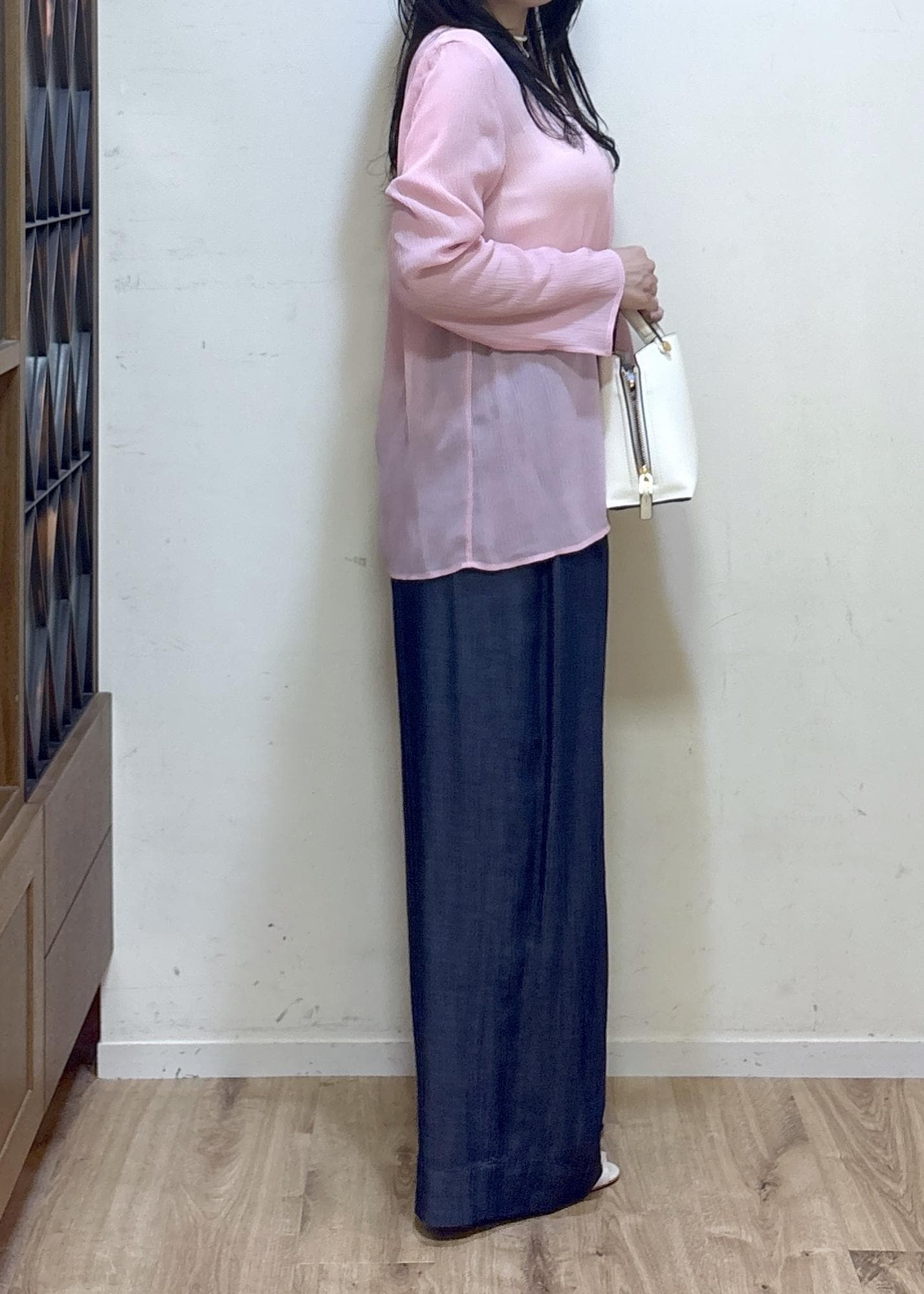 着丈は高めのヒールを合わせて履いていますので、合わせる靴によっては丈のお直しを見ていただけたらと思います。 -