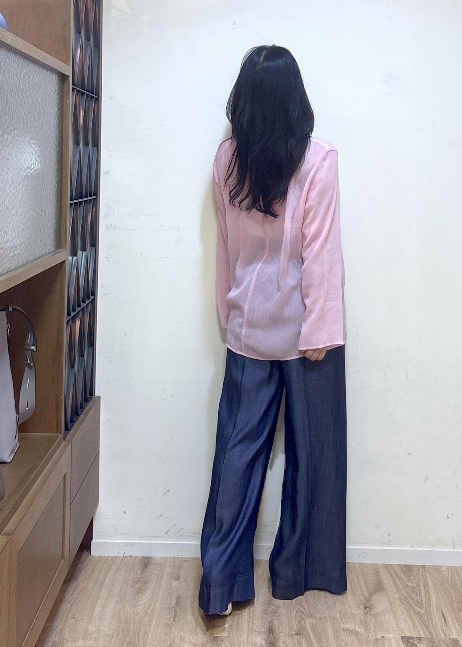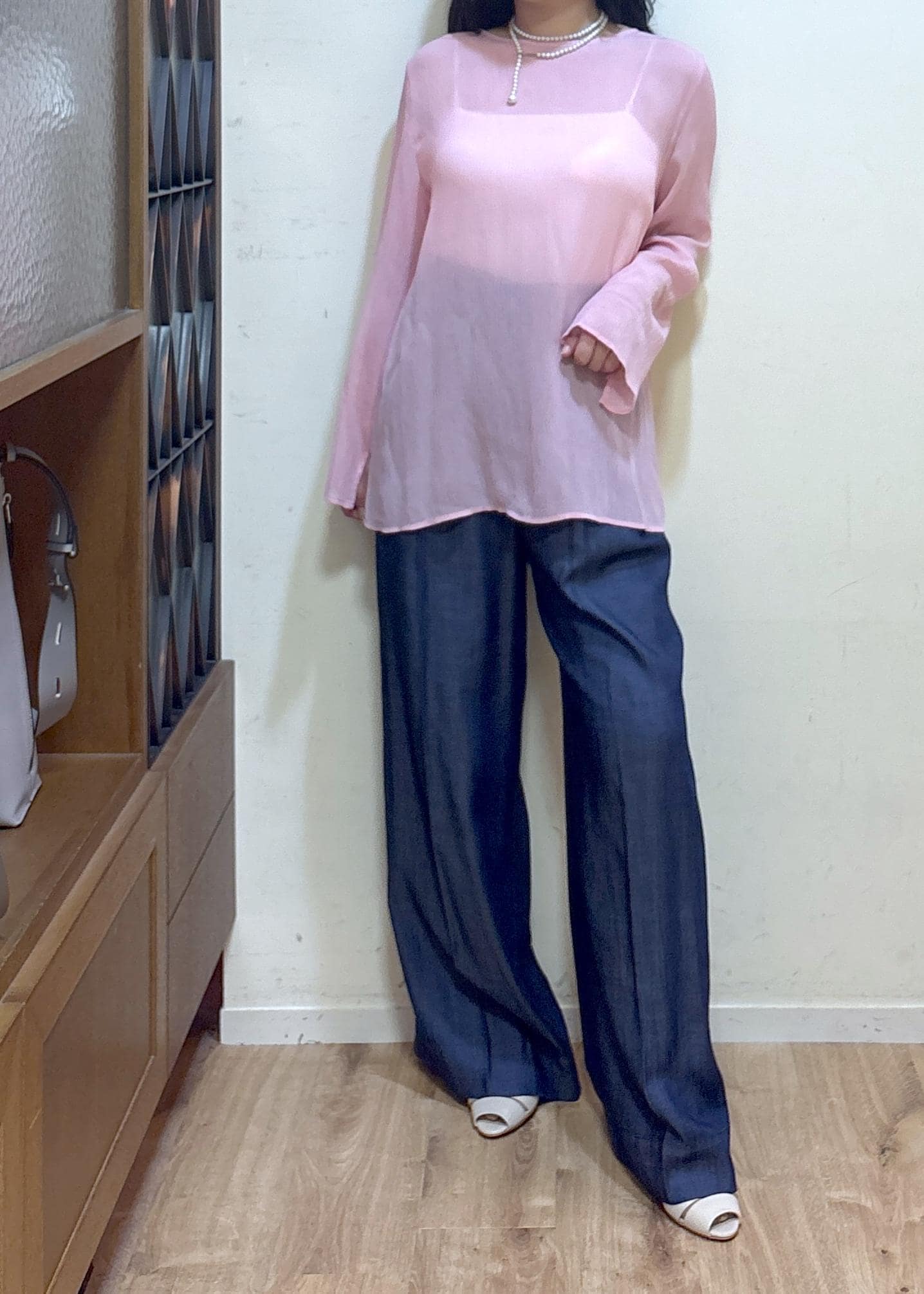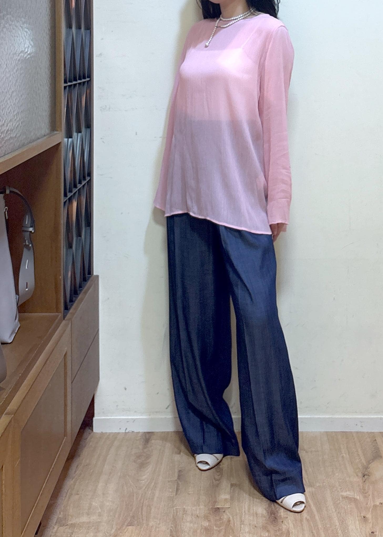 着丈は高めのヒールを合わせて履いていますので、合わせる靴によっては丈のお直しを見ていただけたらと思います。 -
