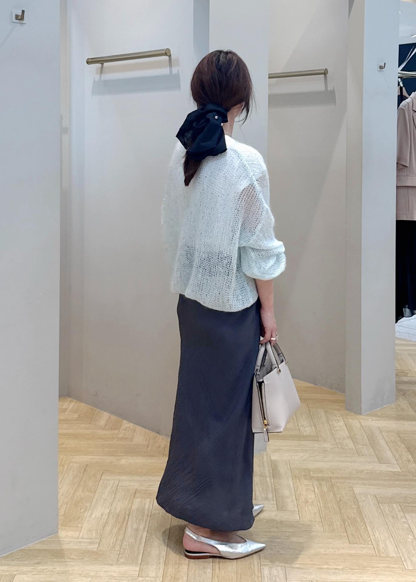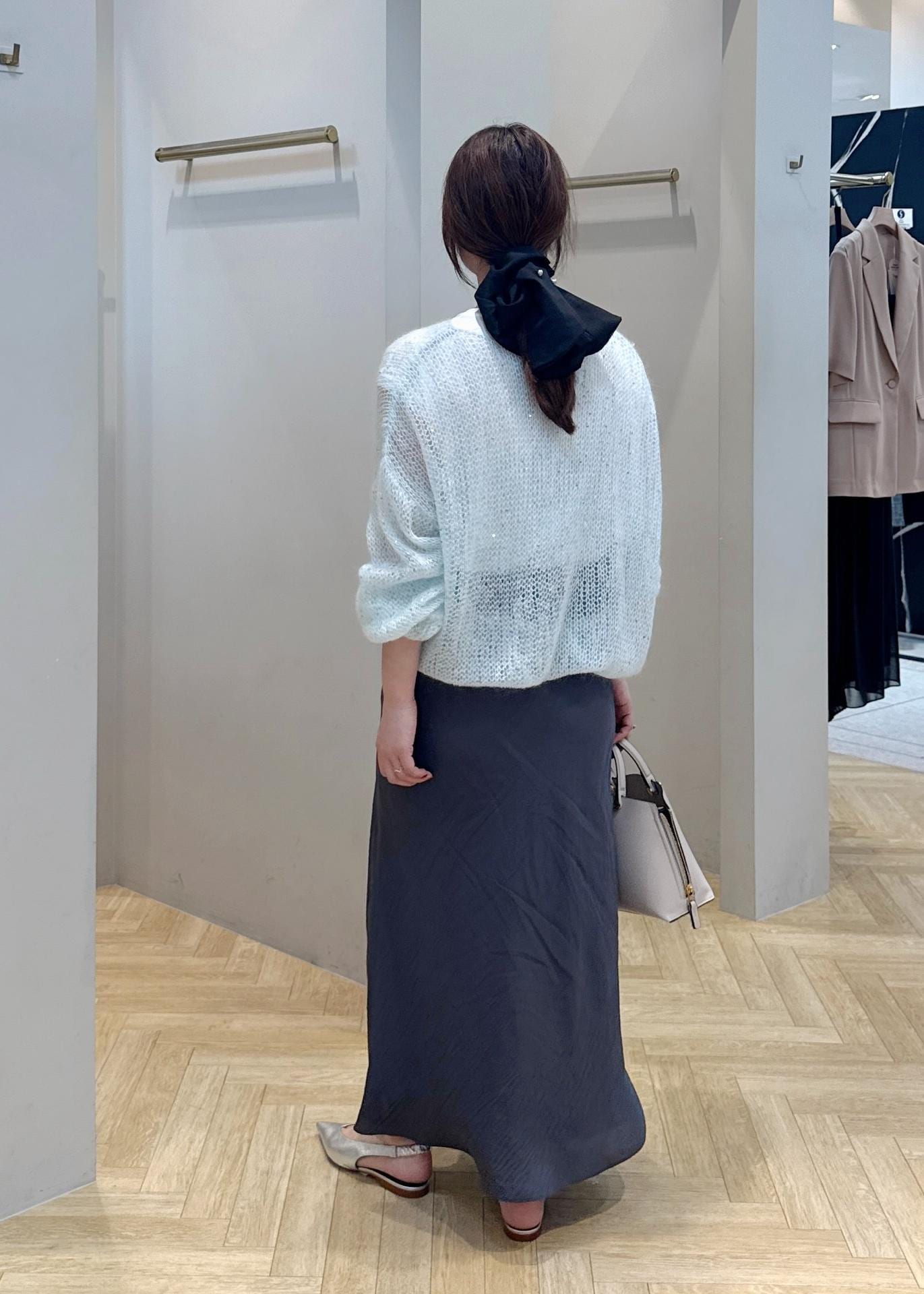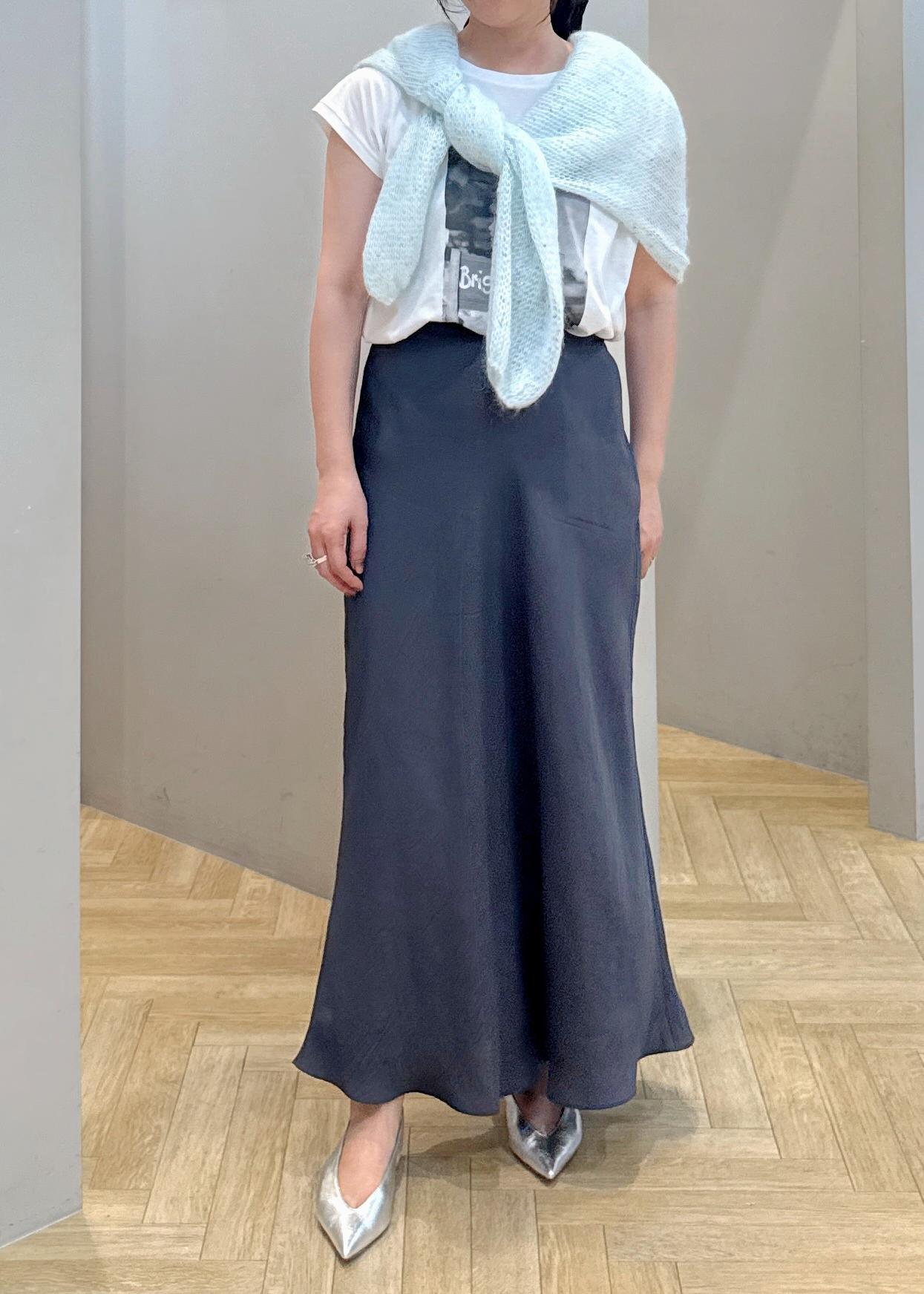 艶感あるスカートと合わせたらより異素材効果で引き立ちます。
