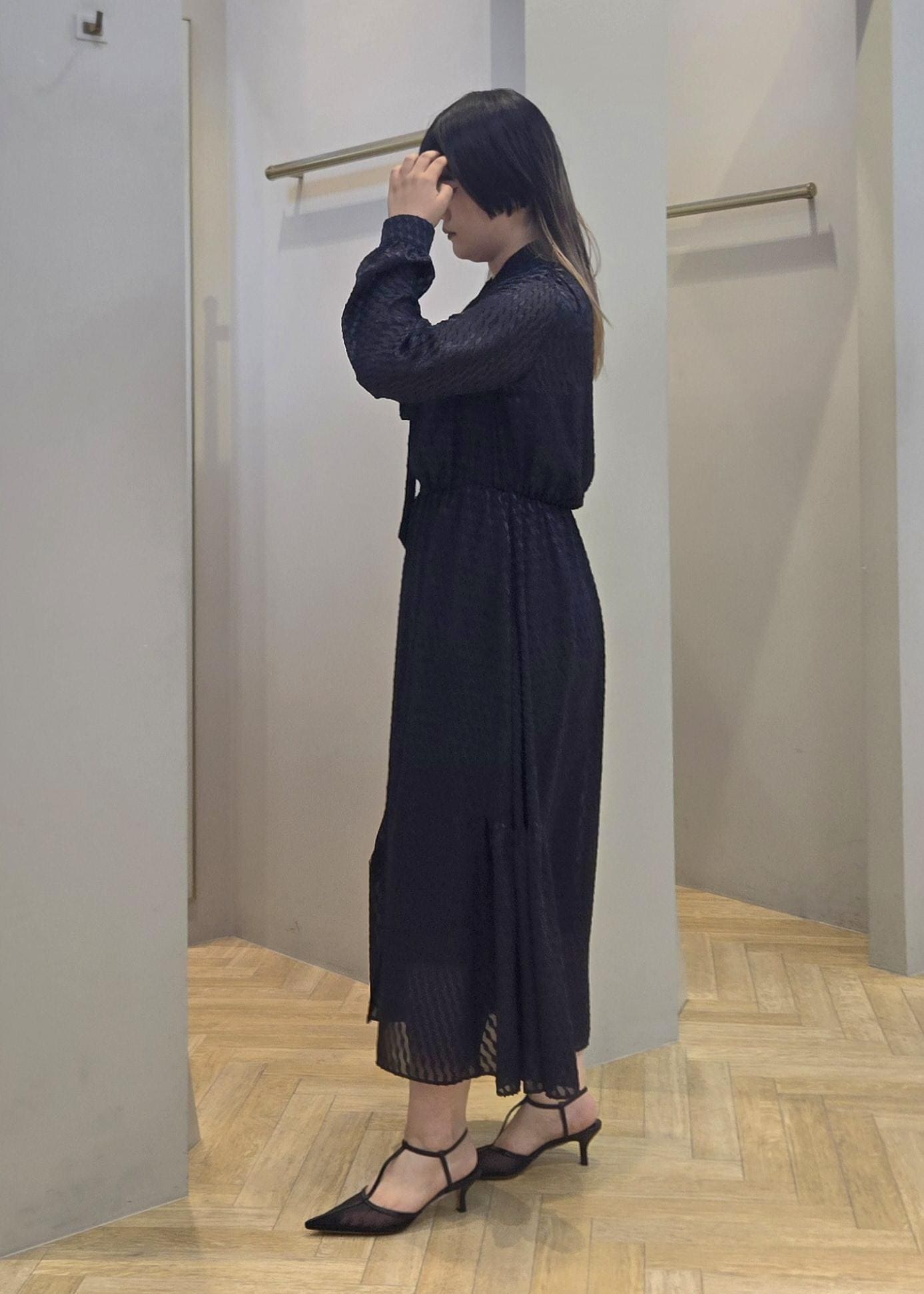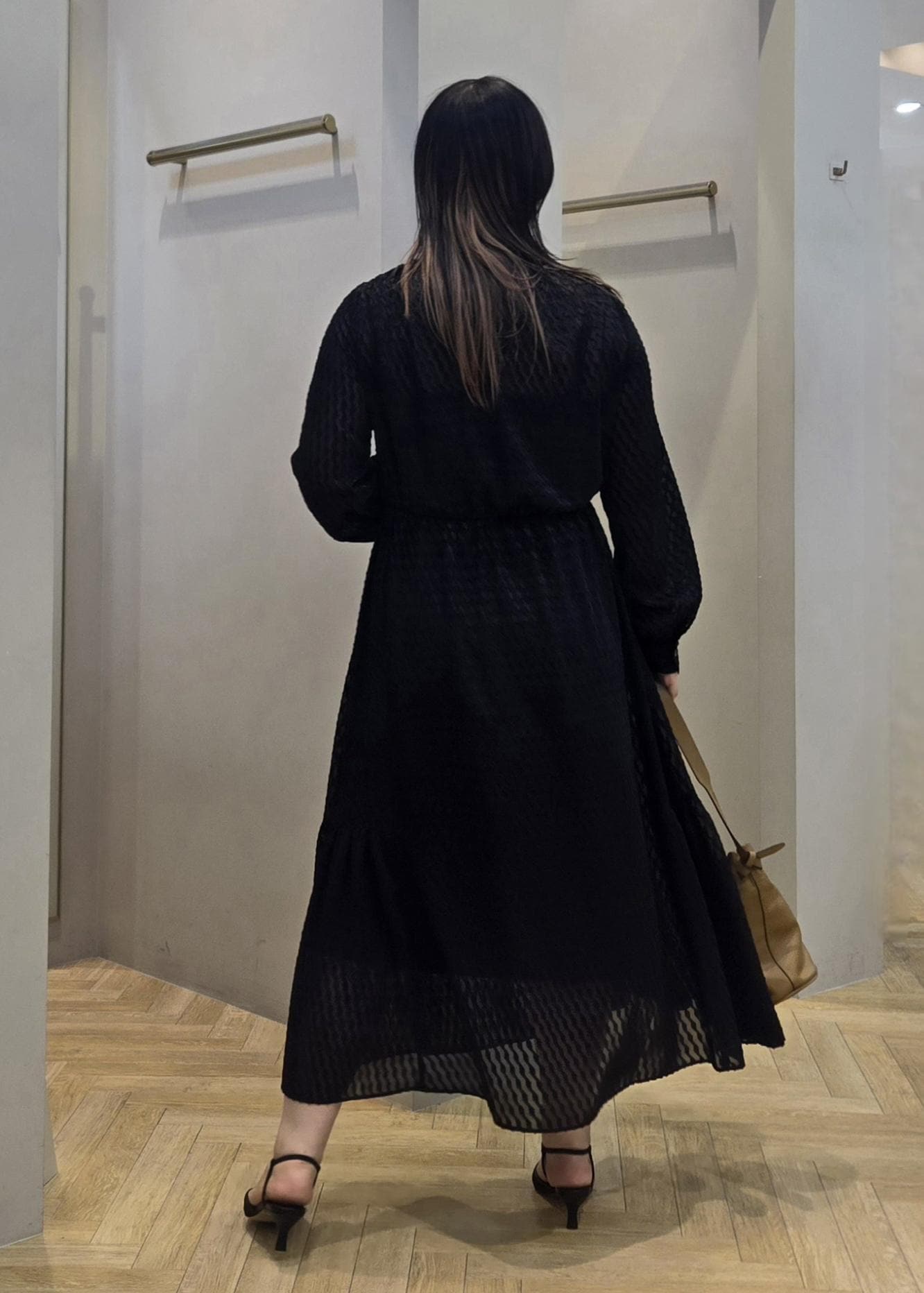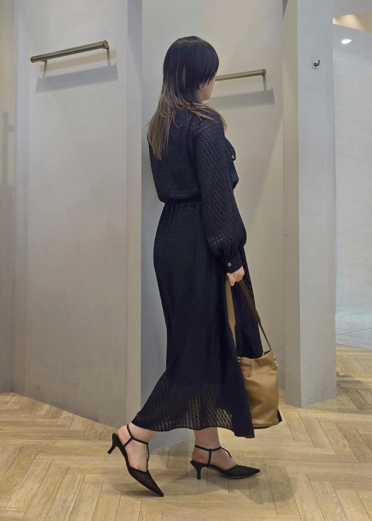 黒でシックな印象ですが肩・ウエスト・裾・袖口にギャザーが華やかな印象に。