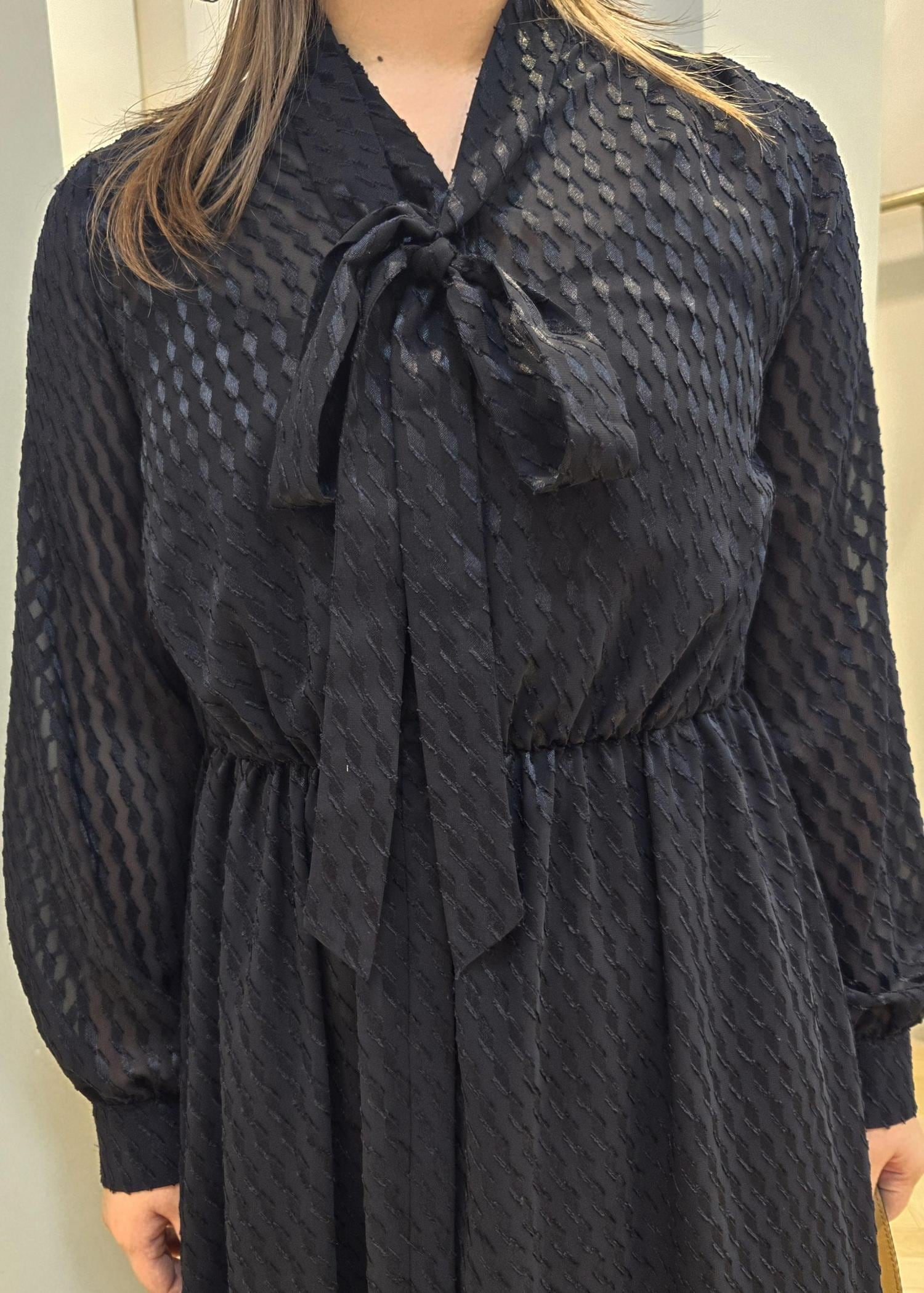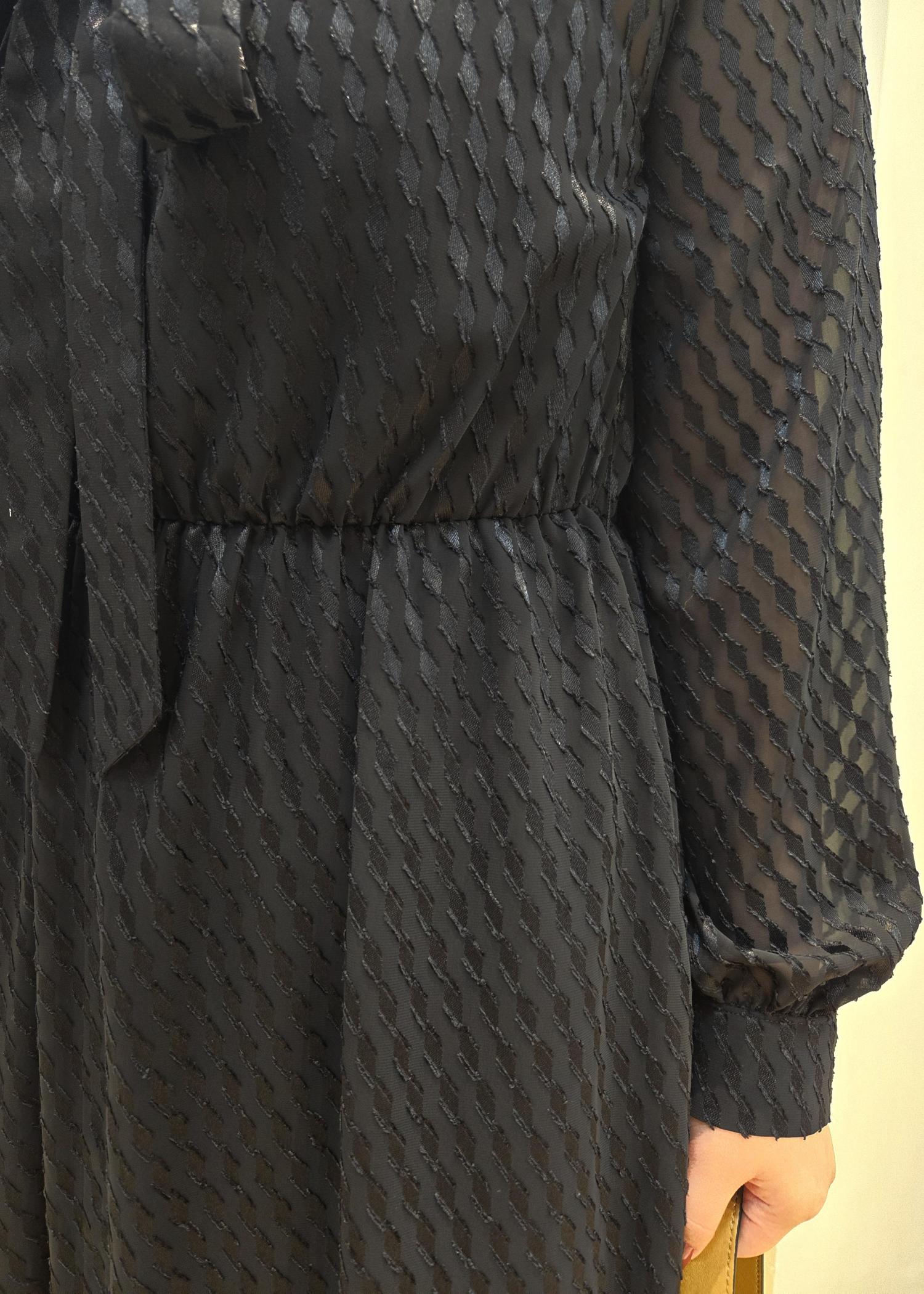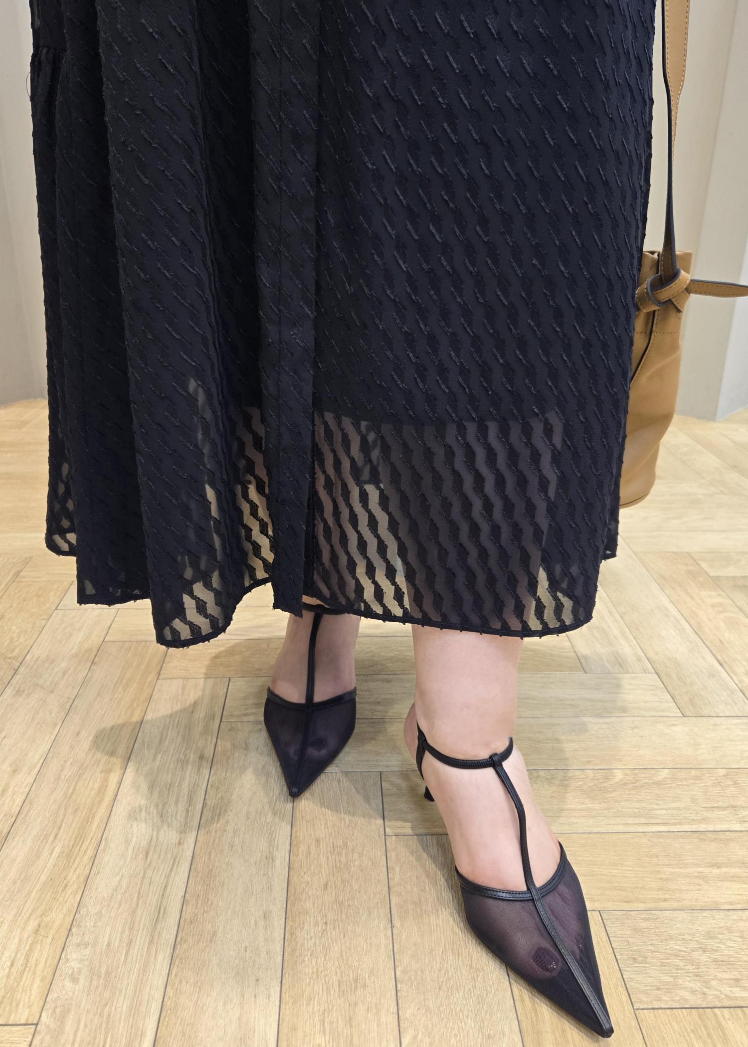 黒でシックな印象ですが肩・ウエスト・裾・袖口にギャザーが華やかな印象に。