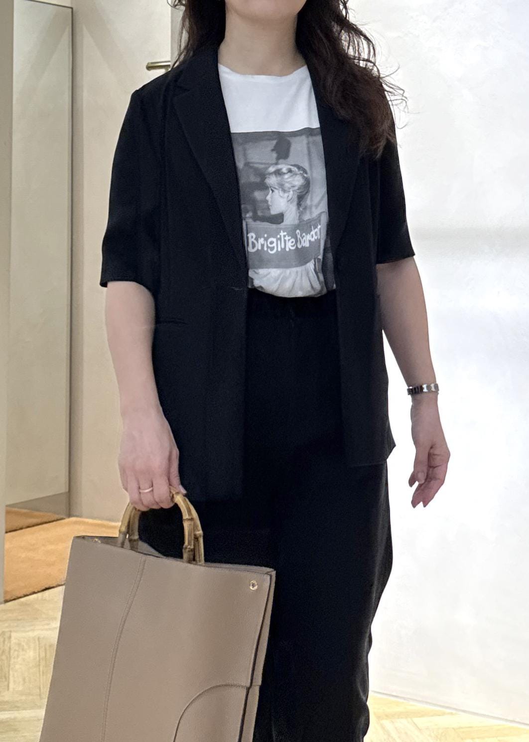 抜け感のあるハーフスリーブジャケットにインナーはTシャツを合わせてセットアップだけどかっちりしすぎないスタイルにしました。