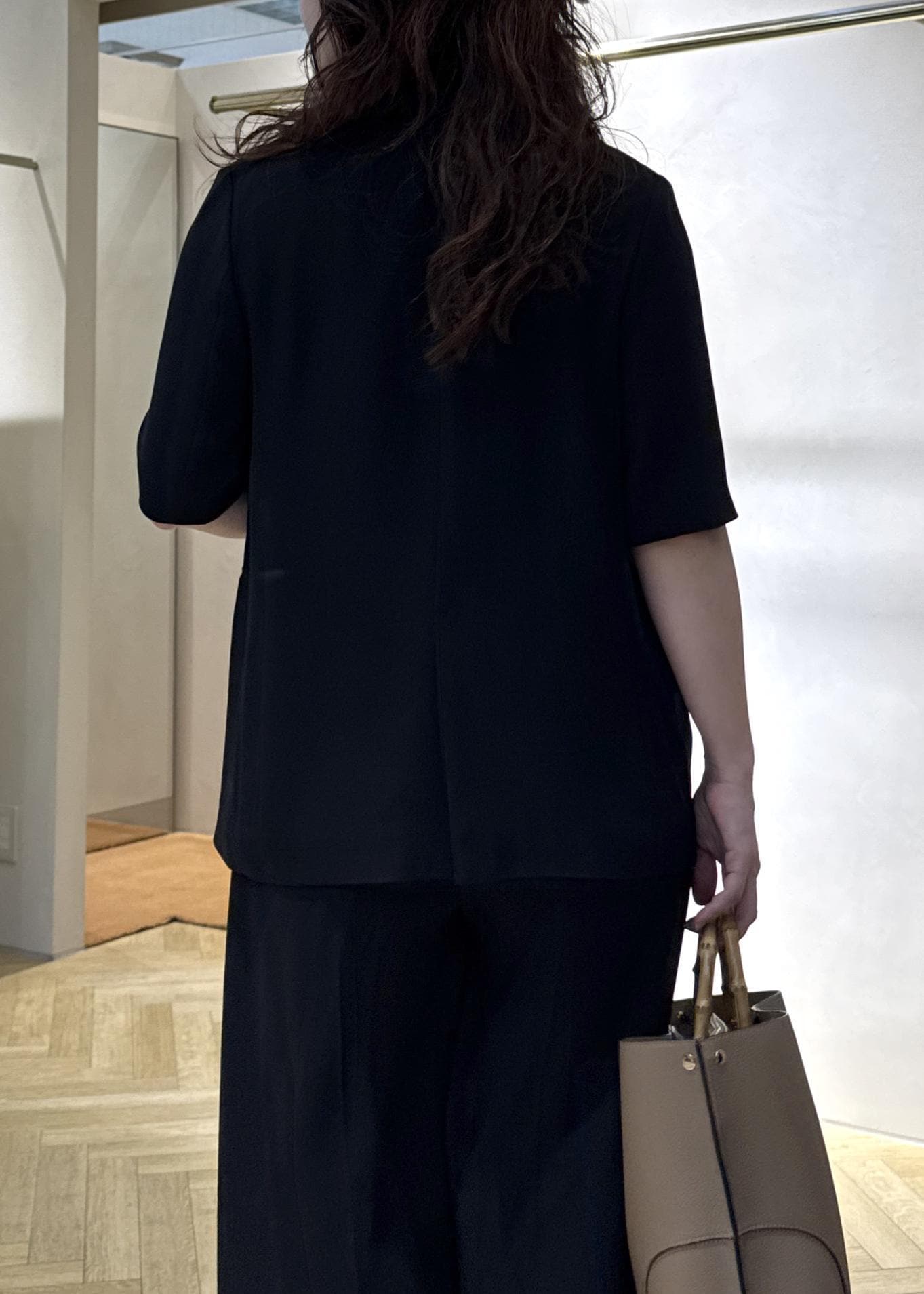 ROPÉ【洗える・カセット服・新色追加】トリアセバックサテン ハーフスリーブジャケット/セットアップ対応ブラック /¥31,900レビュー38サイズを着用しています。