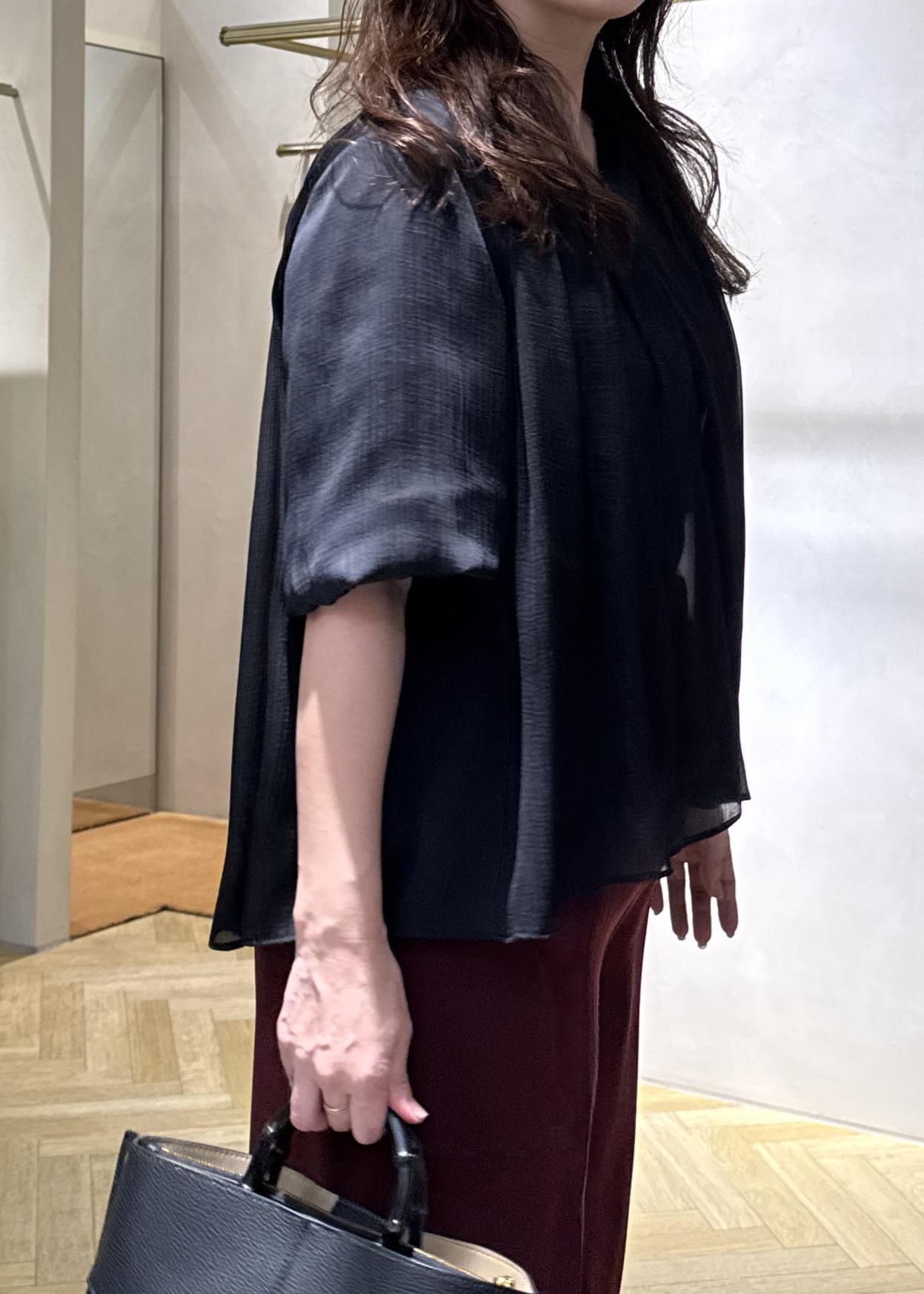 アウトレットROPÉ楊柳スキッパーブラウス/イージーケアブラック / F¥10,450レビュー肌離れよく見頃はゆとりがあり袖も袖口はシャーリングでゴム仕様ですが締め付けはありませんでした。