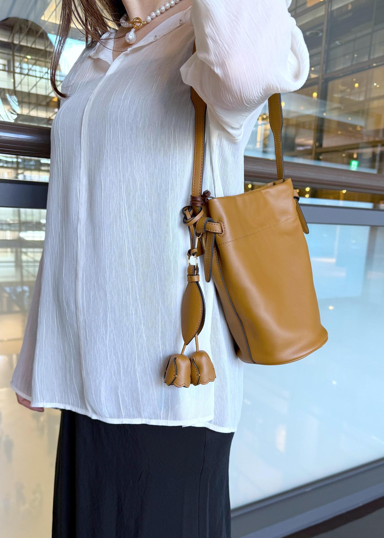 ポーチやお財布・携帯・充電器など、マチがしっかりあるので必要最低限のものは入れていただけます。