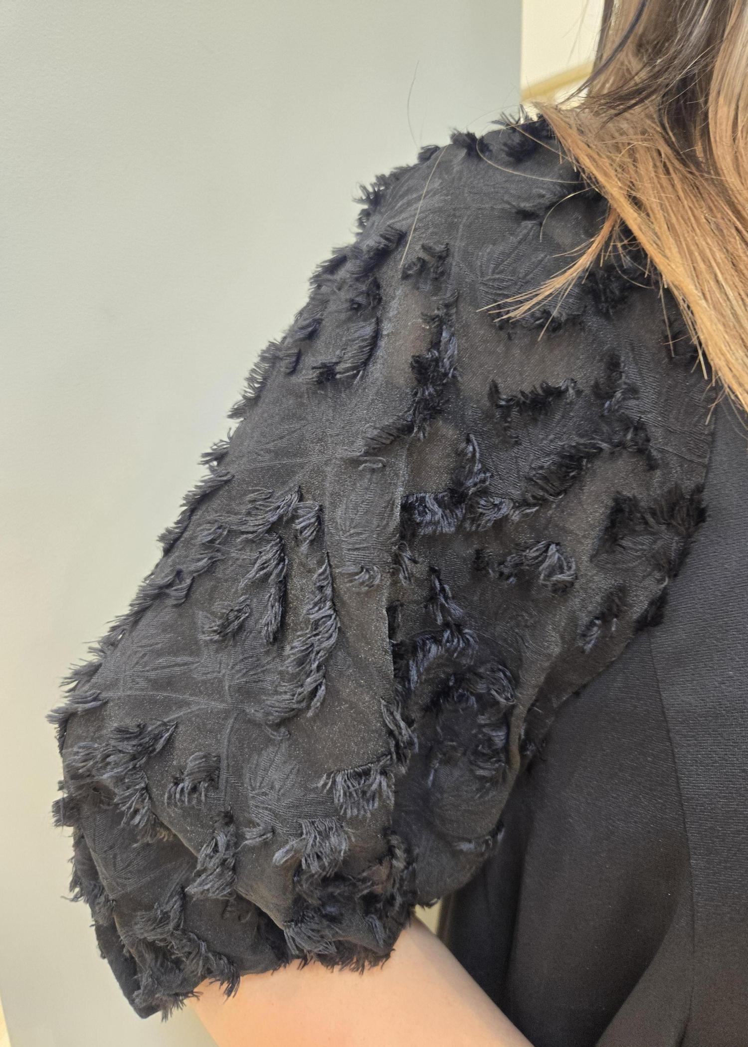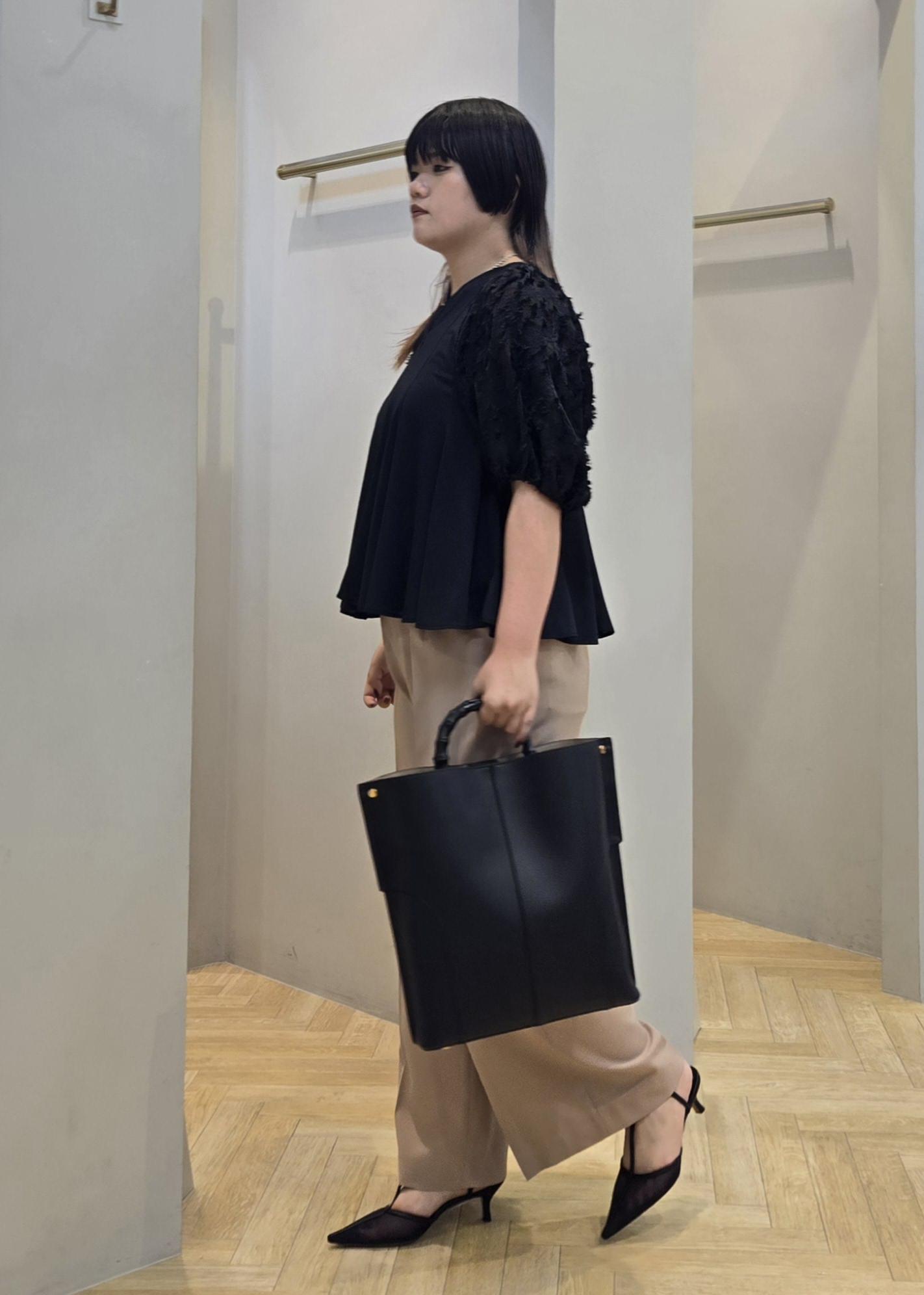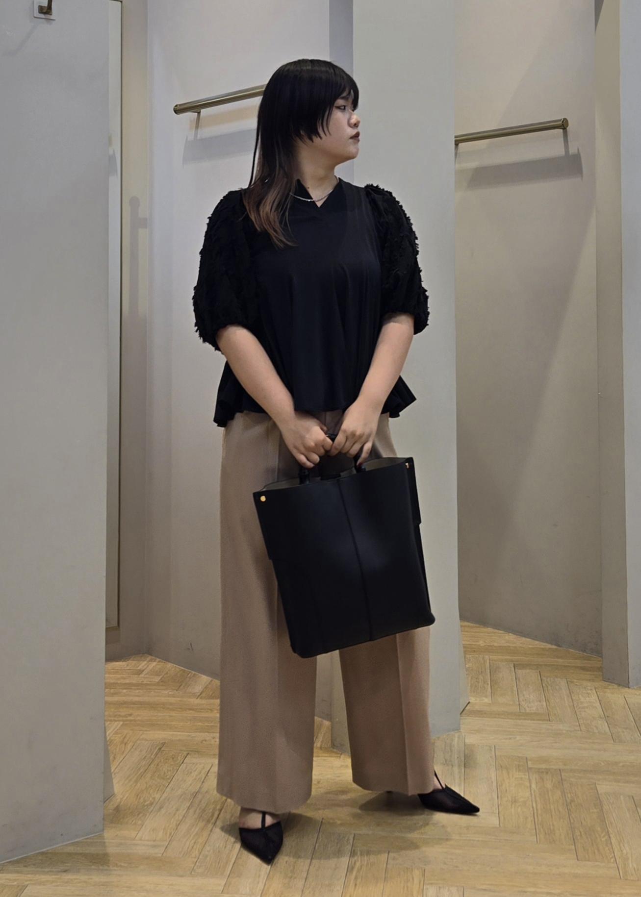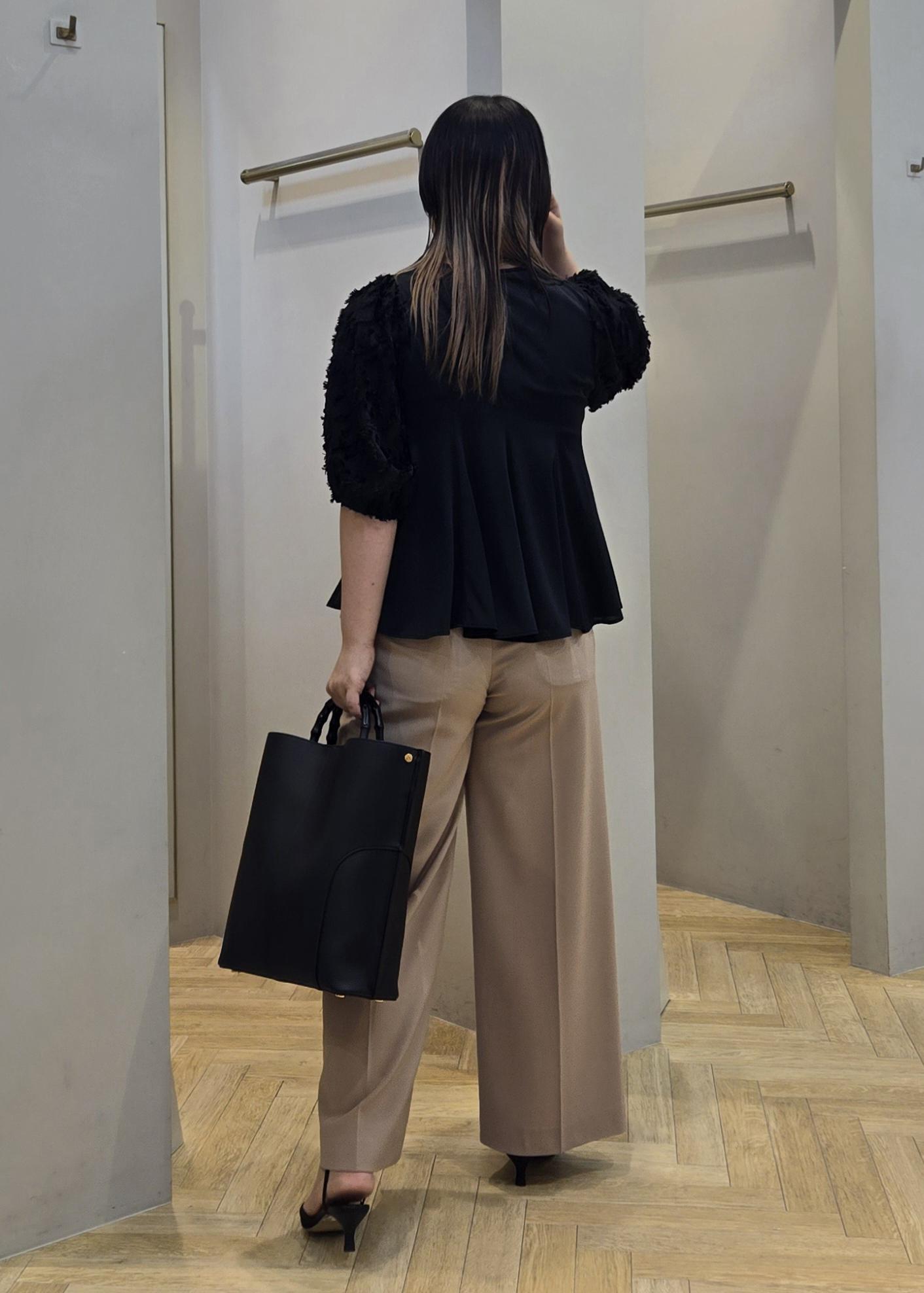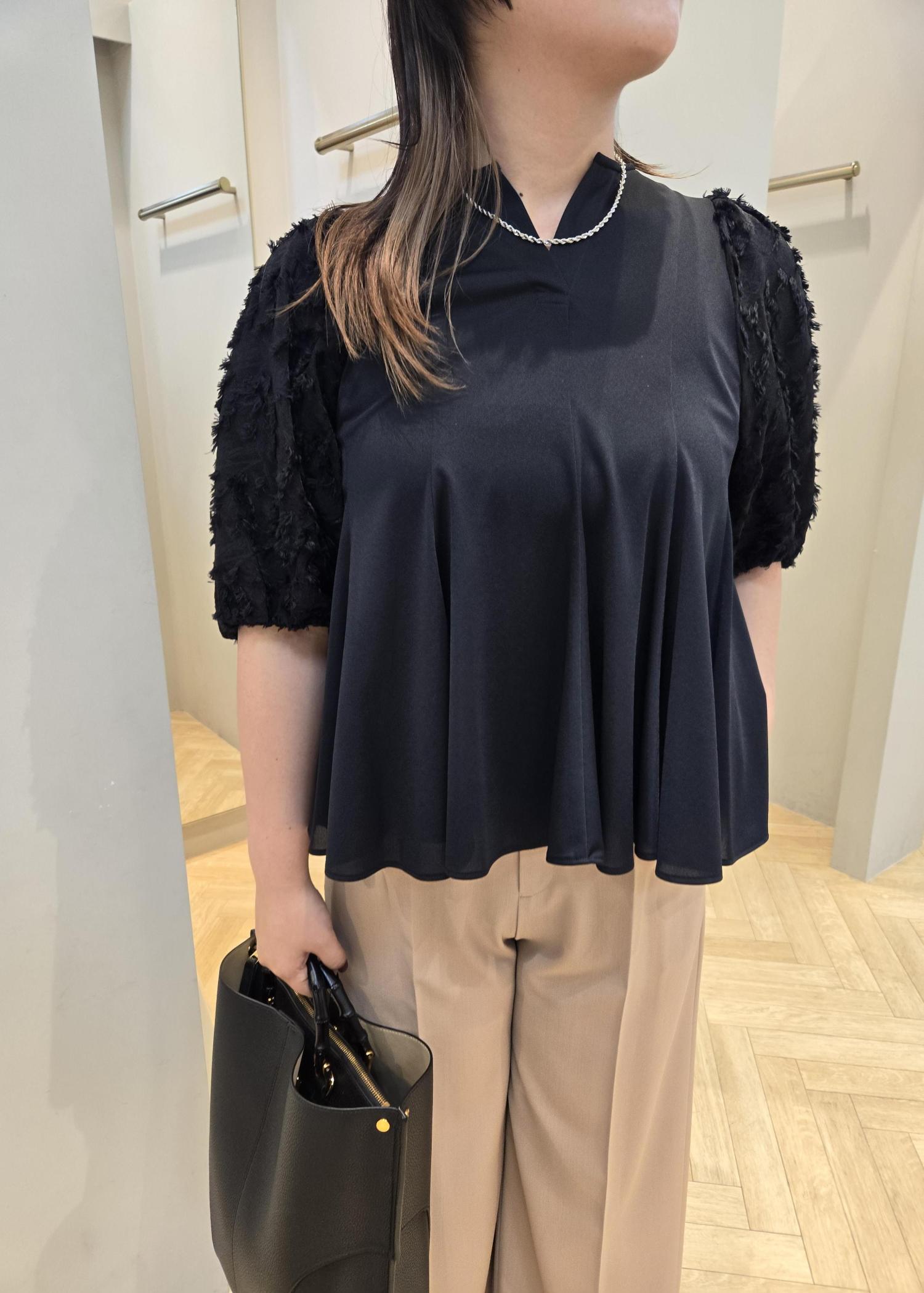 ROPÉジャガードスリーブコンビブラウス/イージーケアブラック / F¥19,800レビュー1枚で華やかな印象になるカットソーで、袖にほのかにシアー感がありボリューム感と抜け感が良いバランスで作られてます。ペプラムのような形になっているのでしたにスッキリとしたボトムを合わせるとバランスがいいです。