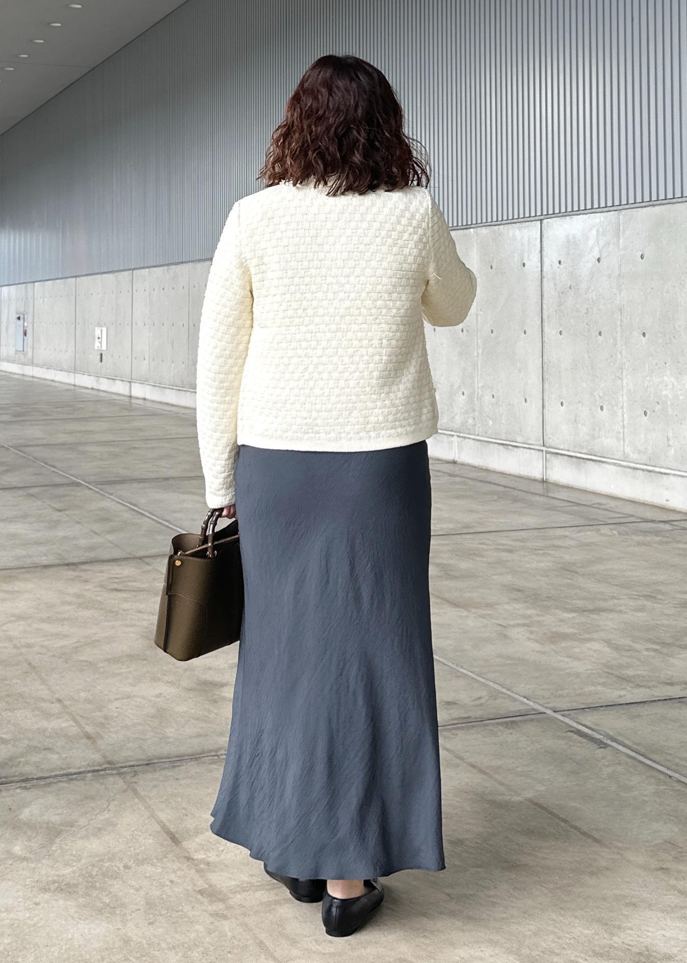 マーメイドスカートですが、腰回りはピッタリし過ぎずすっきりとしたシルエットで、裾に向かって広がるマーメイドラインになっているものの広がらずトップスを選びません。後ろウエストのみゴム仕様になっており程よく楽ちんです。 -