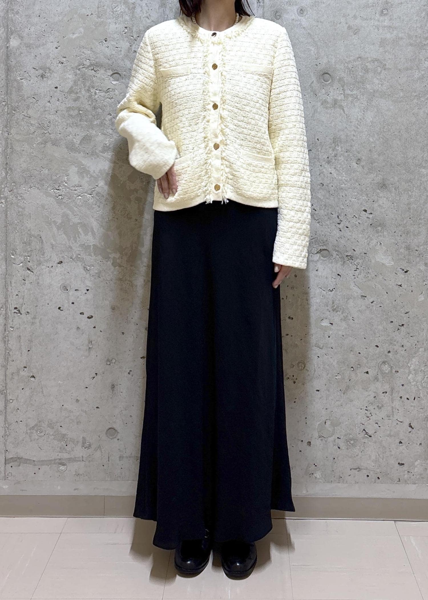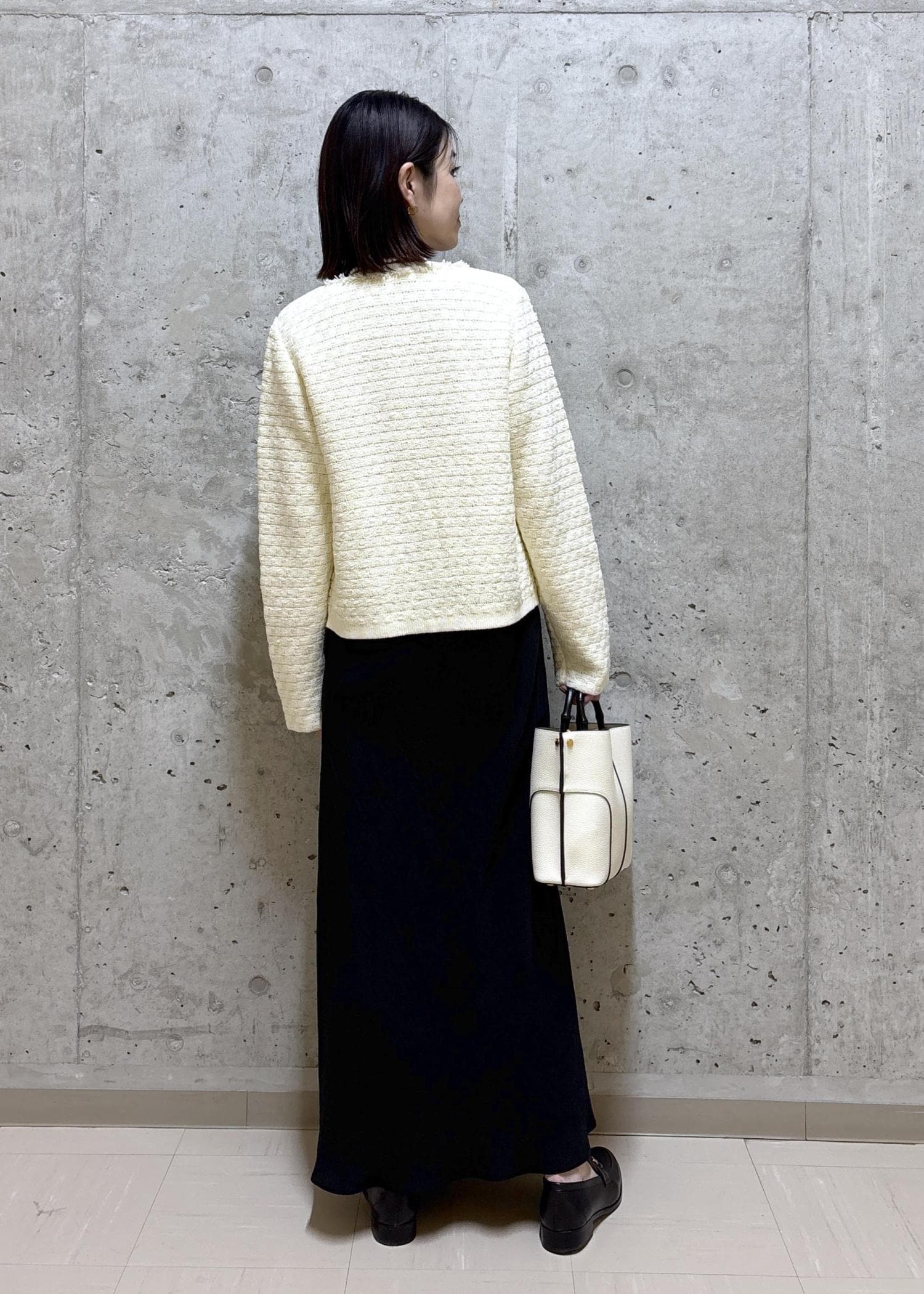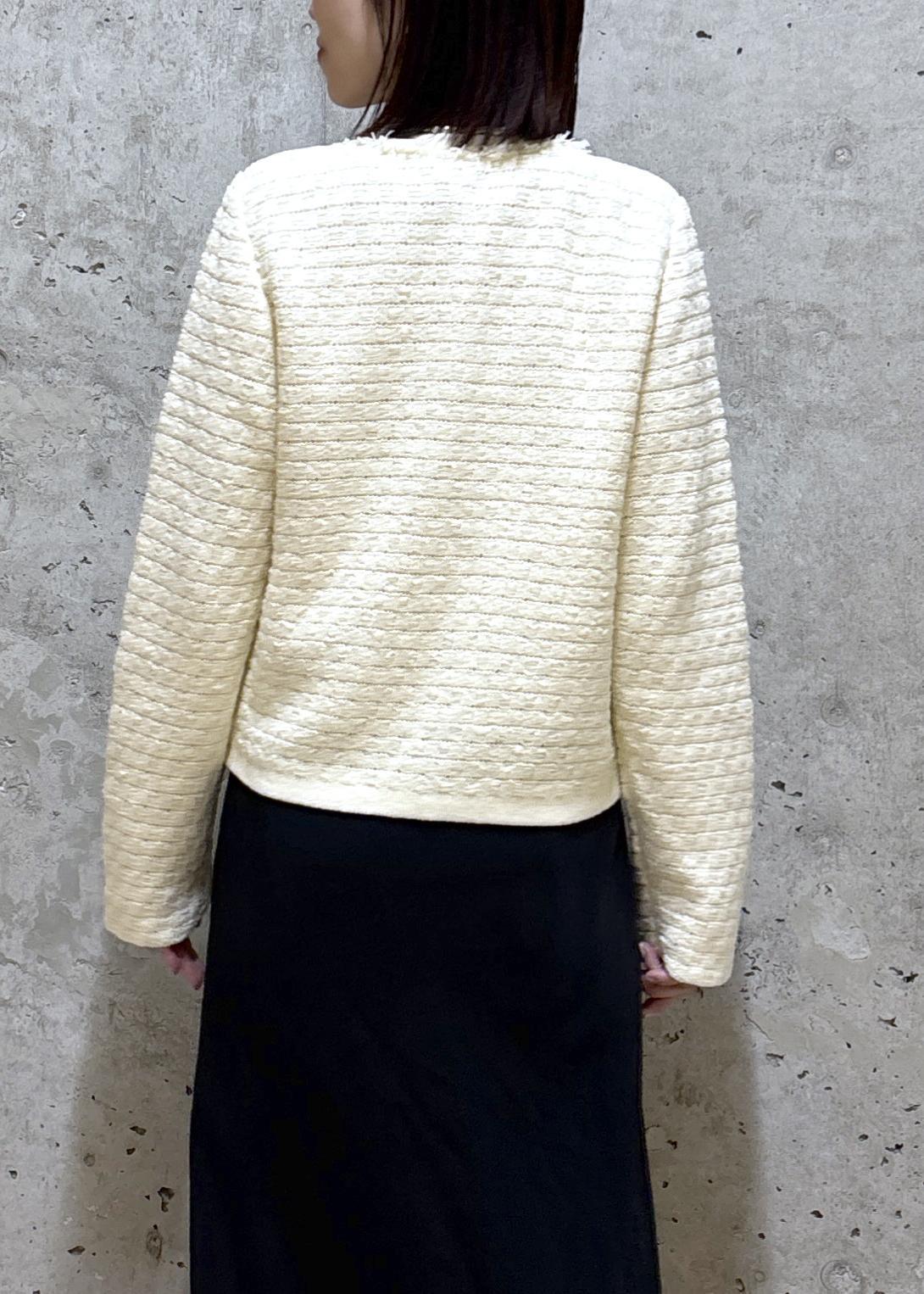 ツイード調に編み込まれたニットジャケットで、柔らかい生地感。羽織ると軽い着心地で重みは感じなかったです。