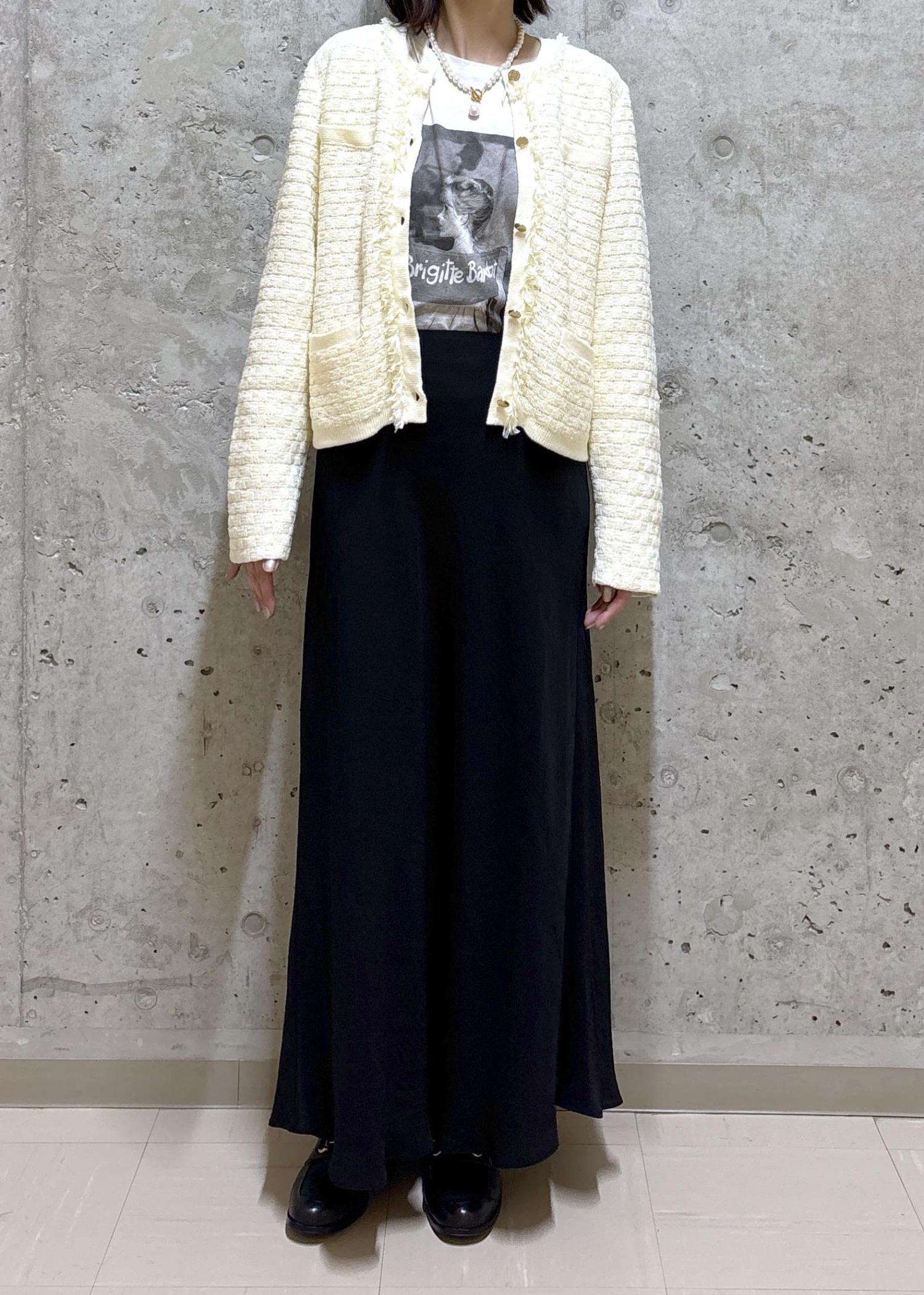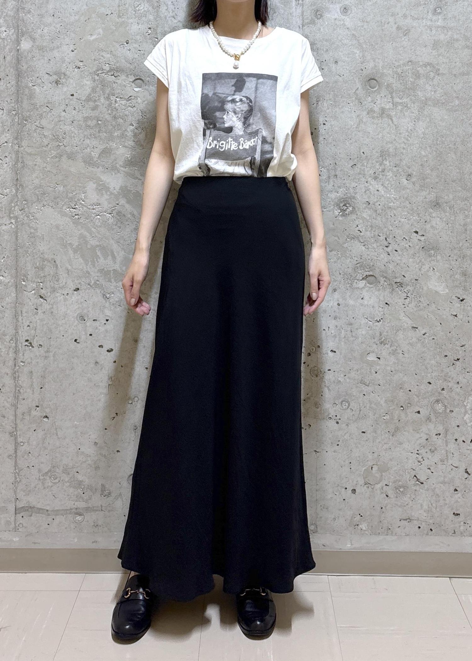 今回はTシャツと合わせてカジュアルなコーディネイトにしました。マーメイドスカートと合わせてスッキリとした女性らしい印象に。