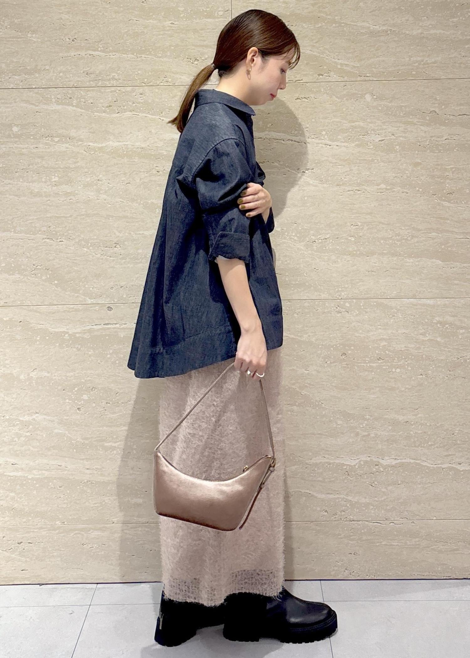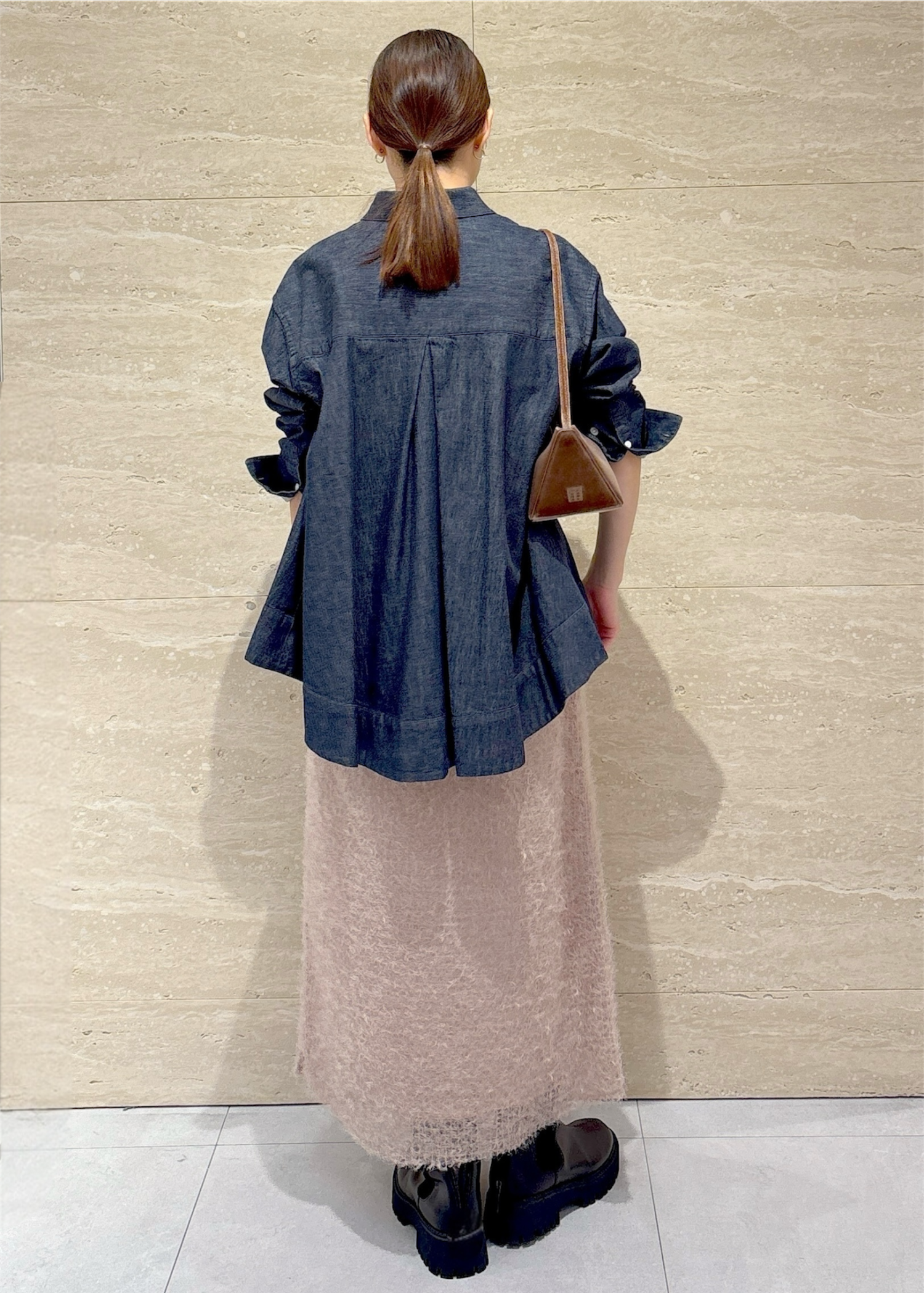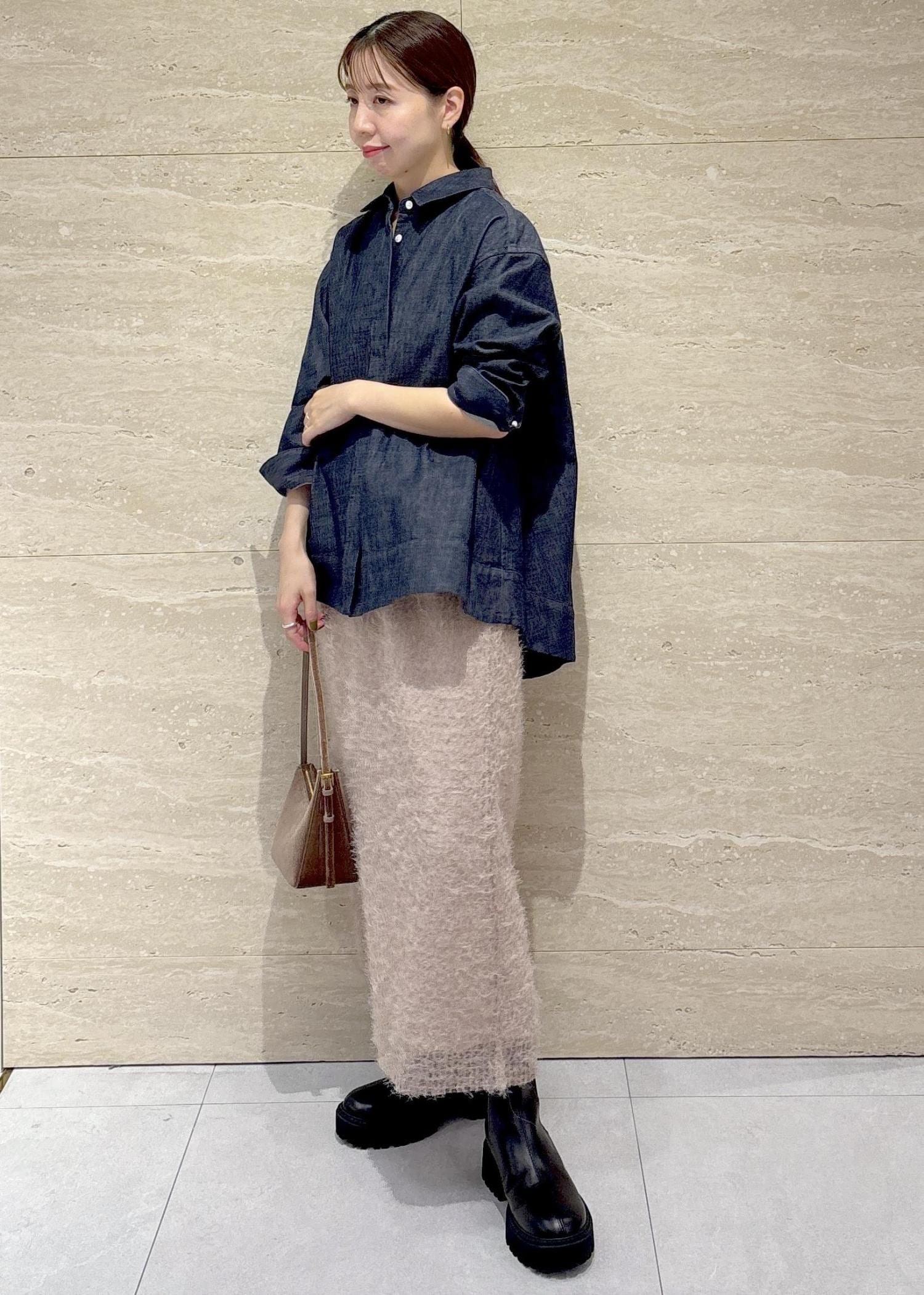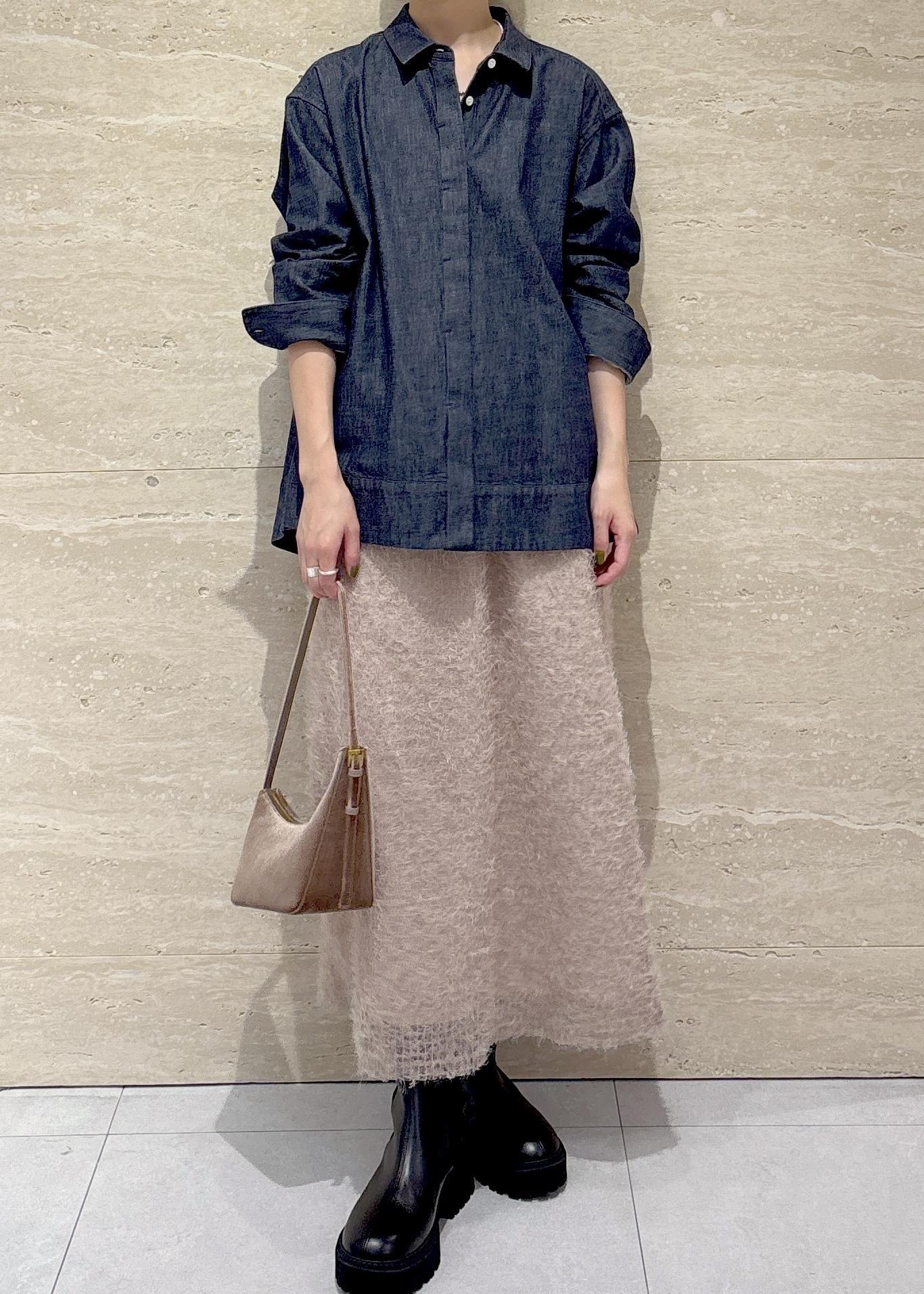 上はデニムのしっかりした質感、下はふわっと毛足のあるニットっぽいスカートで、素材感のコントラストを楽しむコーデにしました。