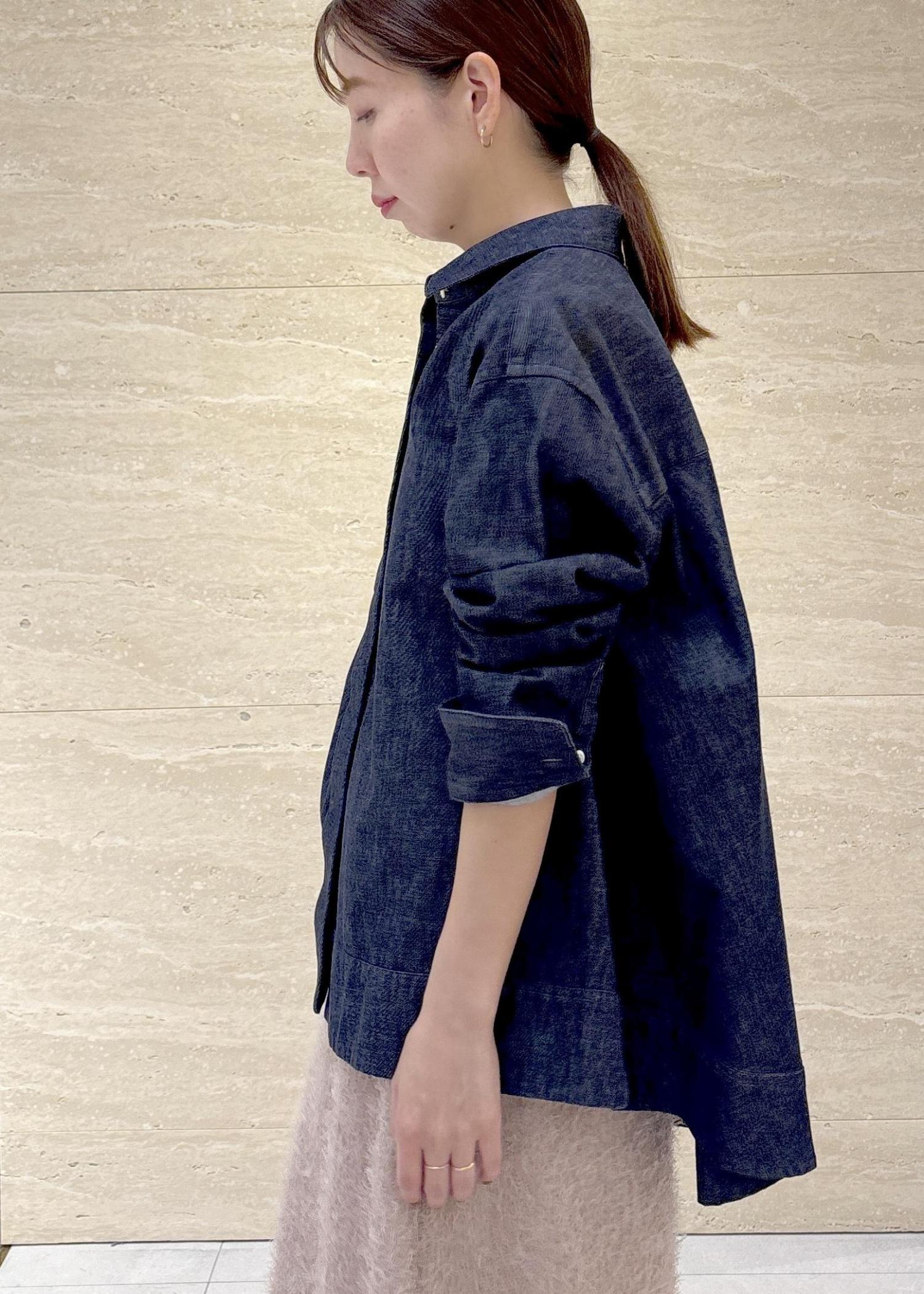 ROPÉ SELECT【drawell(ドロウェル)】DENIM BACK FLARE SHIRT|シャツネイビー / F¥30,800レビュー後ろが長いデザインで横から見るとシルエットがとても可愛いです。