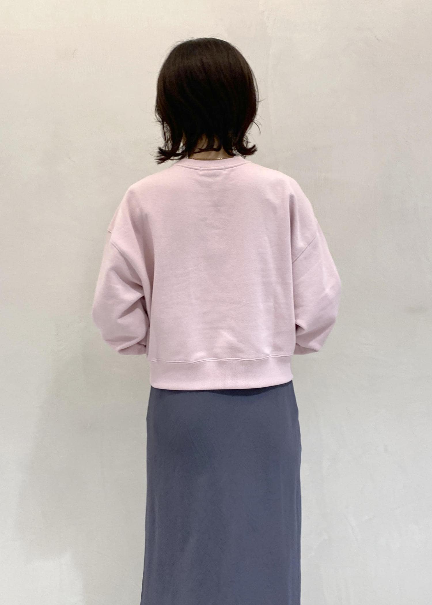 女度高めのマーメイドスカートに、ほんのり甘さのあるピンクのスウェットを合わせ、