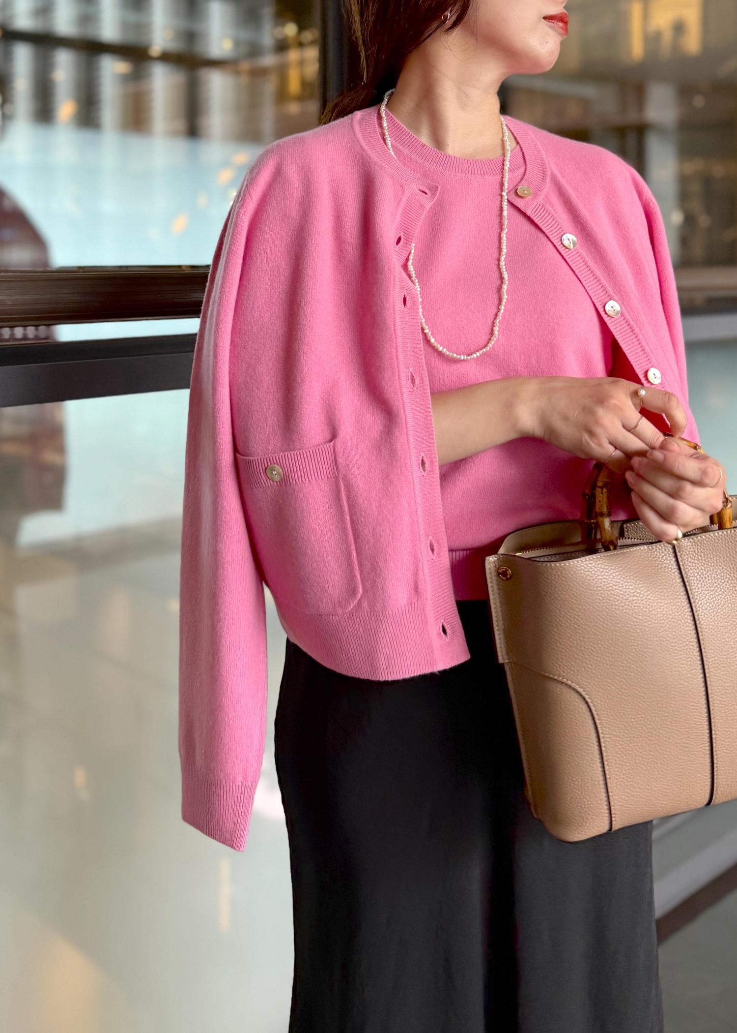 ROPÉ【一部WEB限定】ウールカシミヤ ブレンドニットカーディガン/イージーケアピンク系 / F¥27,500レビュー着丈は、骨盤にかかるくらいの長さなので、スカート・パンツ、ワンピースの羽織としても、ボトムを選ばずにバランス良く着れます。