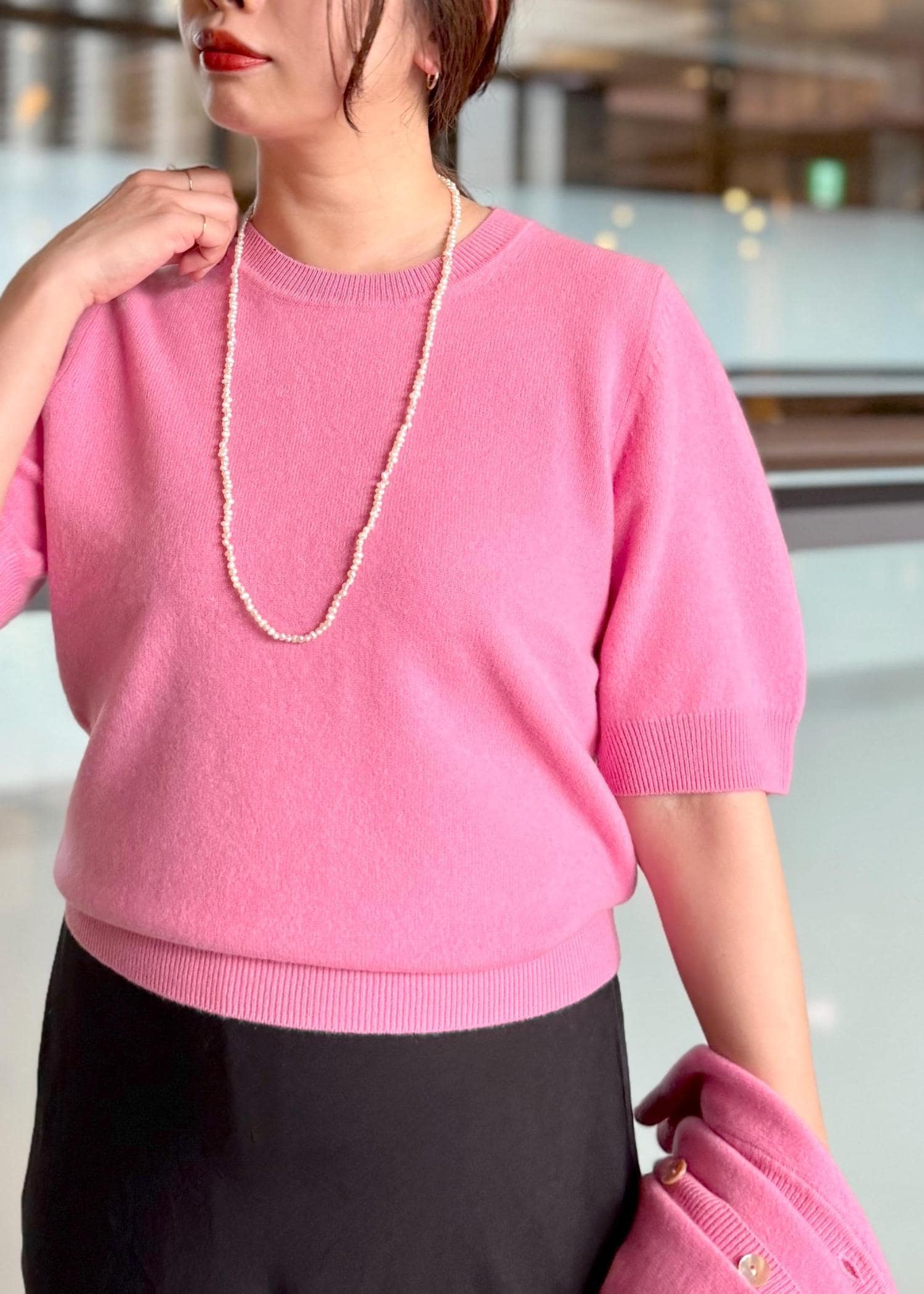 ROPÉウールカシミヤブレンド 5分袖ニットプルオーバー/イージーケアピンク系 / F¥19,800レビュー着丈は、骨盤でとまるくらいの長さなので、インでもアウトでもバランス良く着れます。