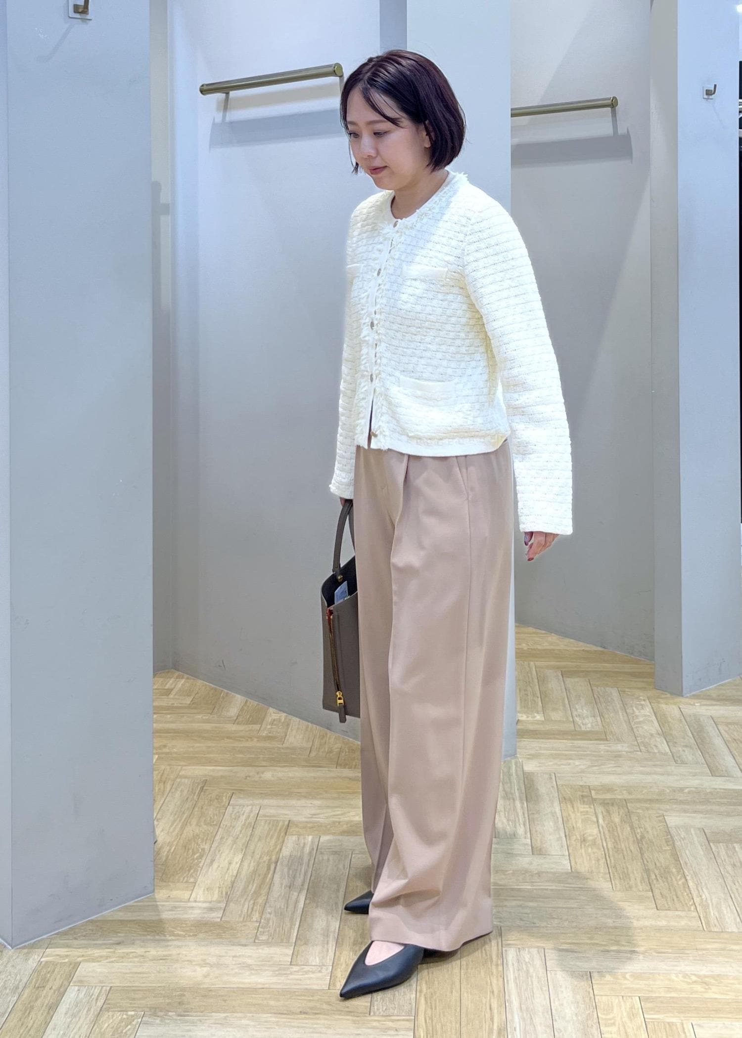 ベージュのワイドパンツを合わせることで