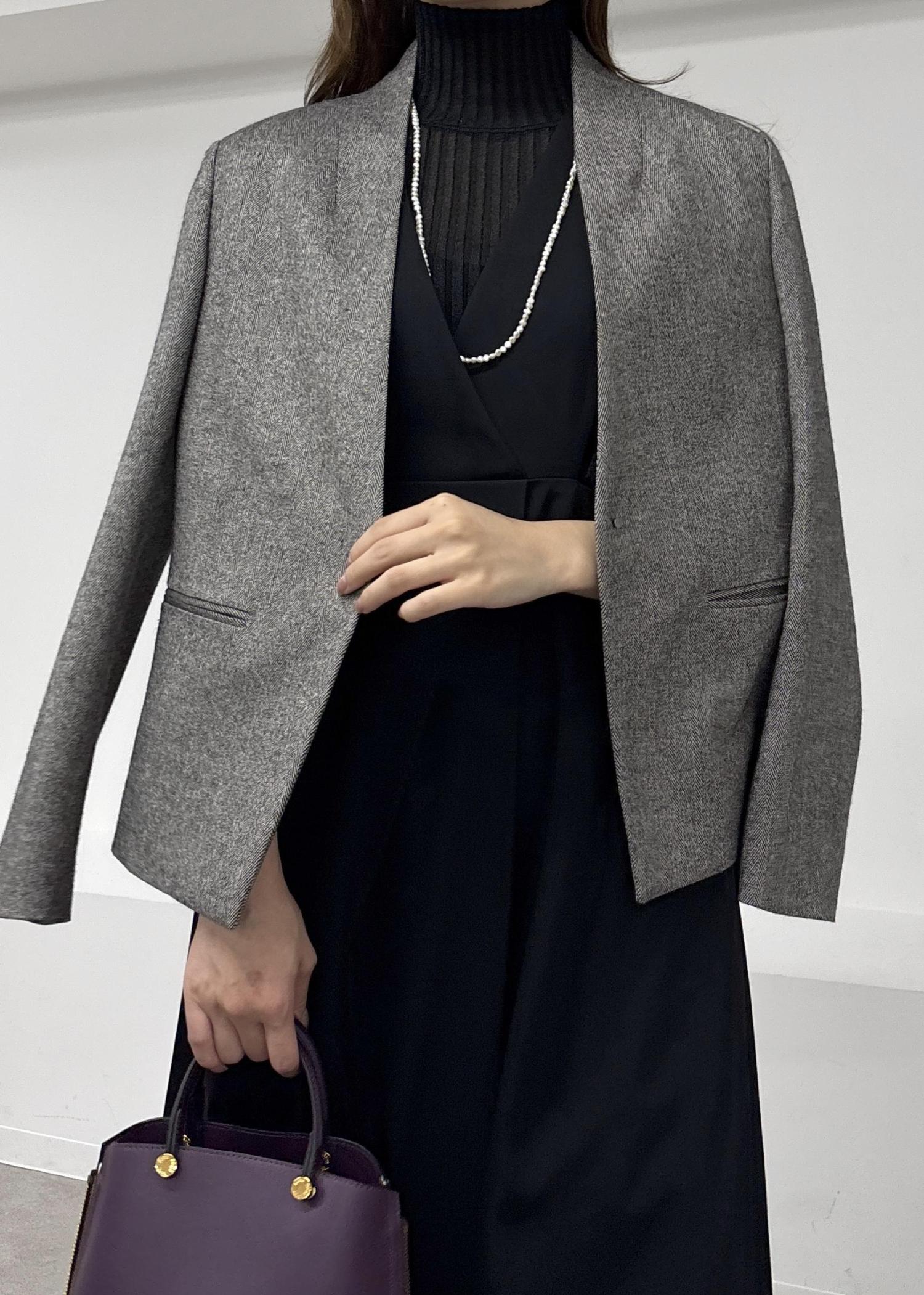 ROPÉウール混ノーカラージャケット(無地/ヘリンボーン)/セットアップ対応ブラック系 / 38¥41,800レビュー襟元が少し高いデザインのウール混ジャケット。ほどよく艶感があり女性らしい印象で合わせていただけます。