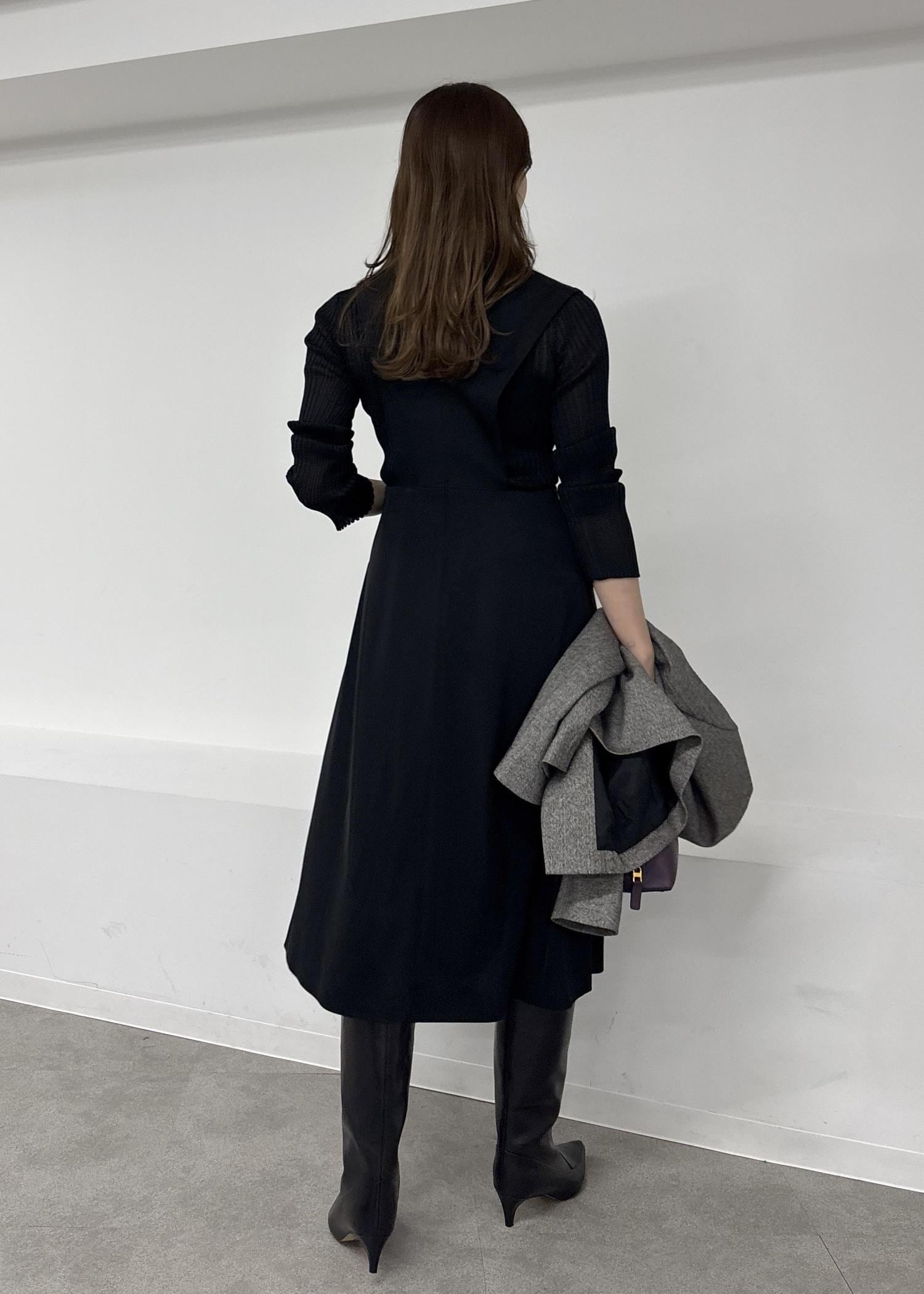 全体のサイズ感はジャスト、ウエストの切り返し位置が高くすっきり着用できました。着丈は膝下10cmあたり。とても軽く肩の負担無く楽な着心地です。 -