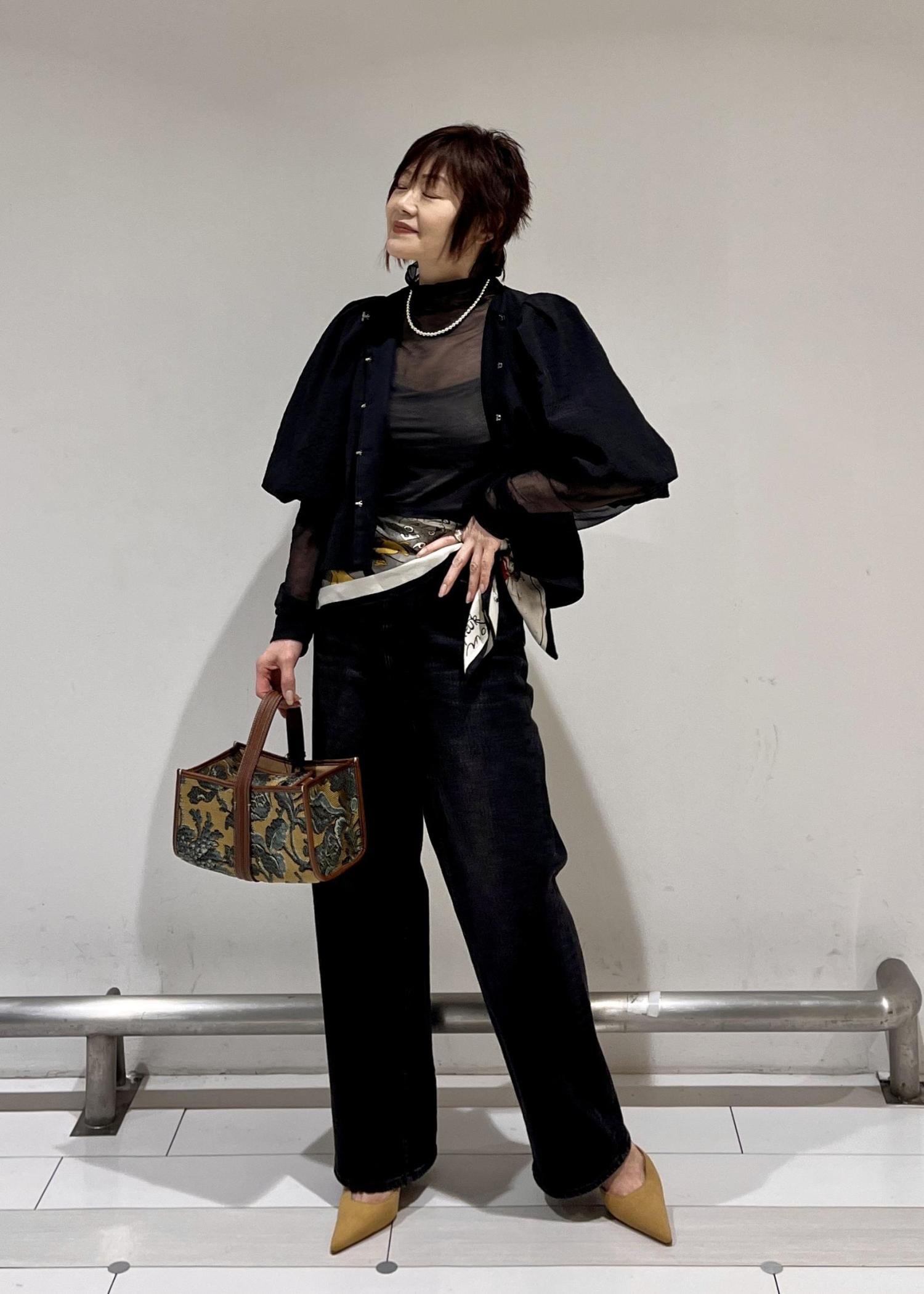 単調にならないように異素材を組合せて小物に差し色を取り入れメリハリのあるコーディネートに