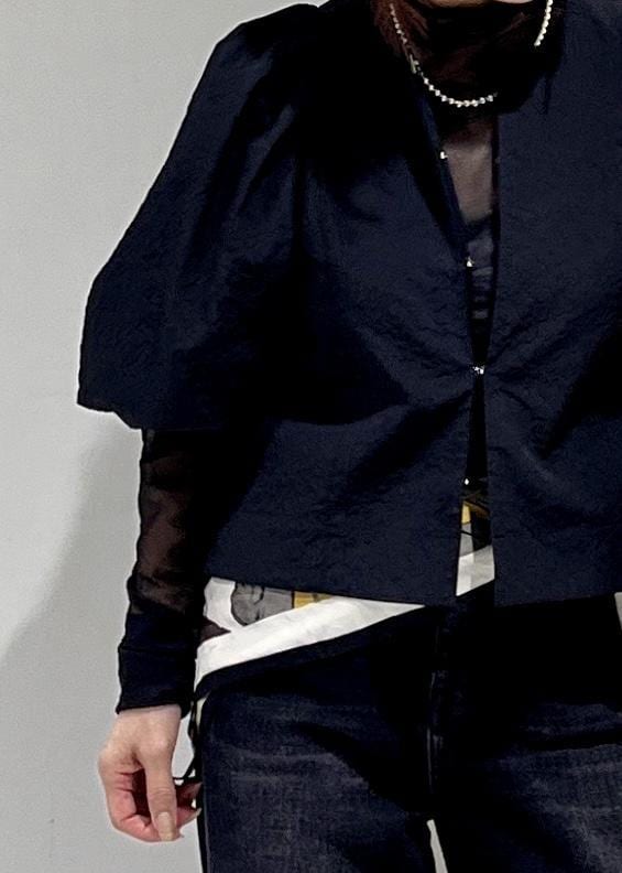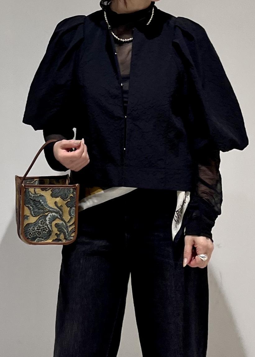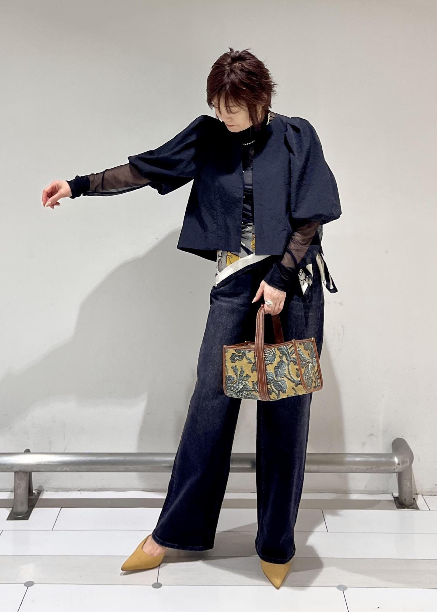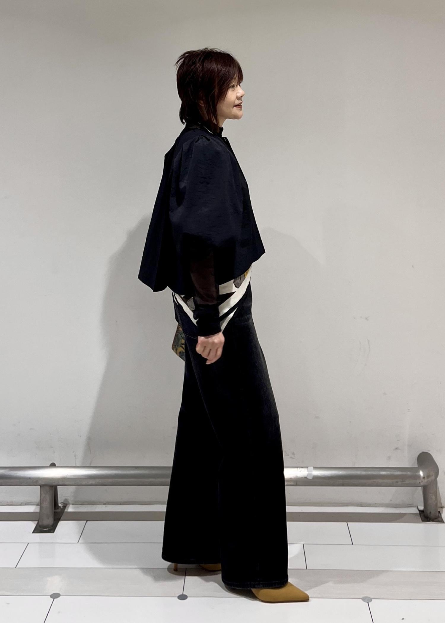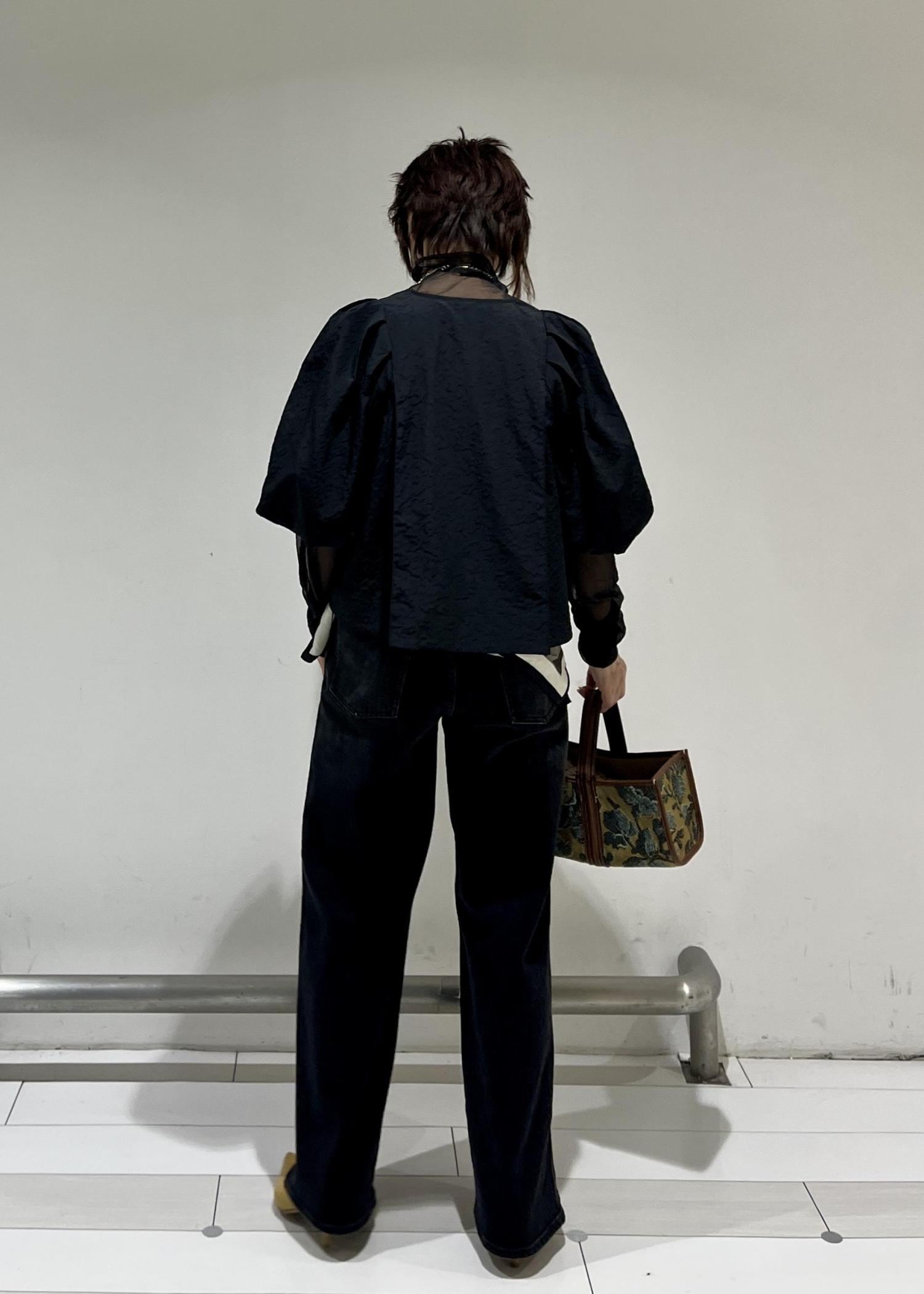 REALM(レルム)のSleeve Volume Blouseにチュールのインナーをレイヤードしボトムにデニムを合わせてワンカラーで統一しました。