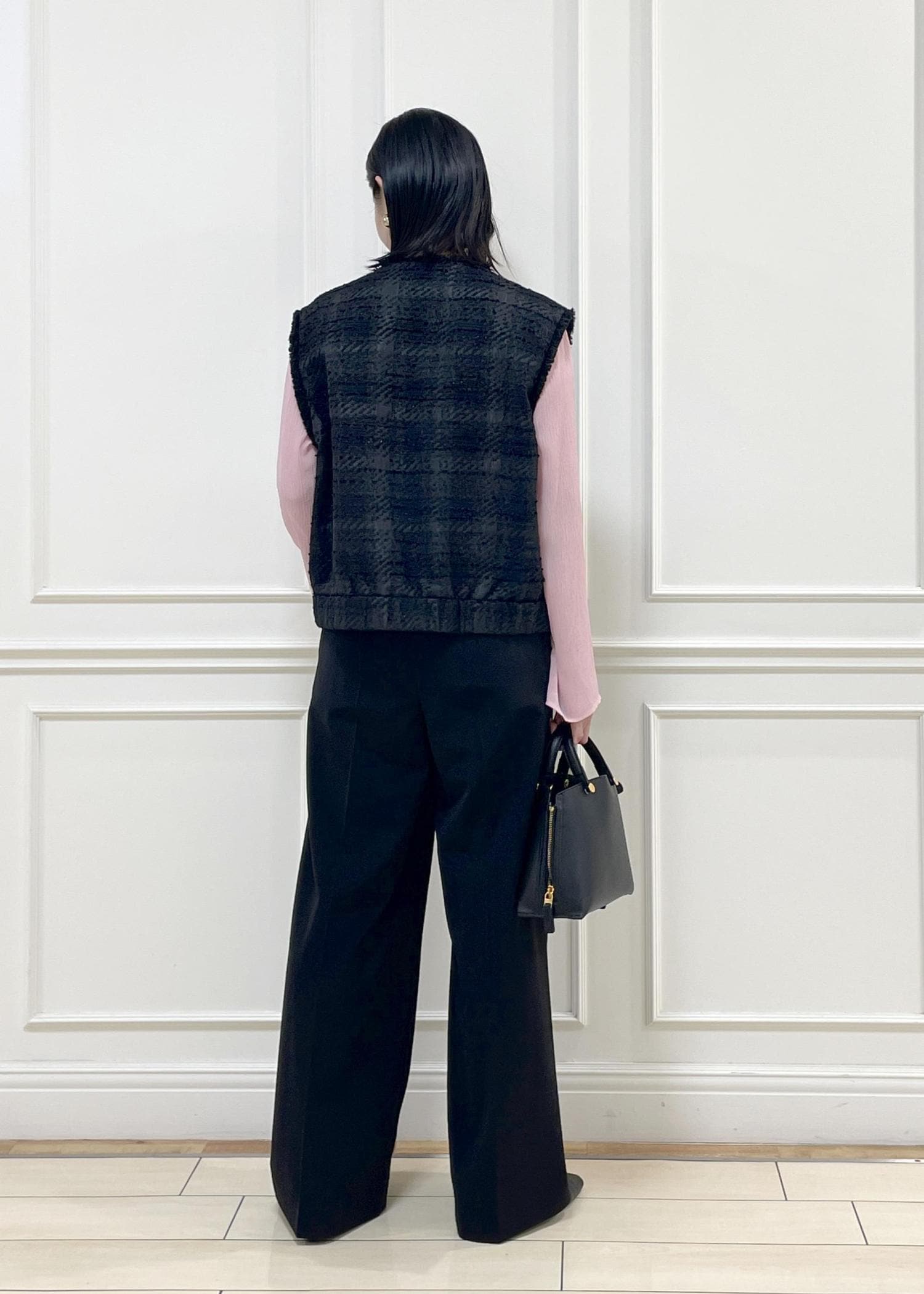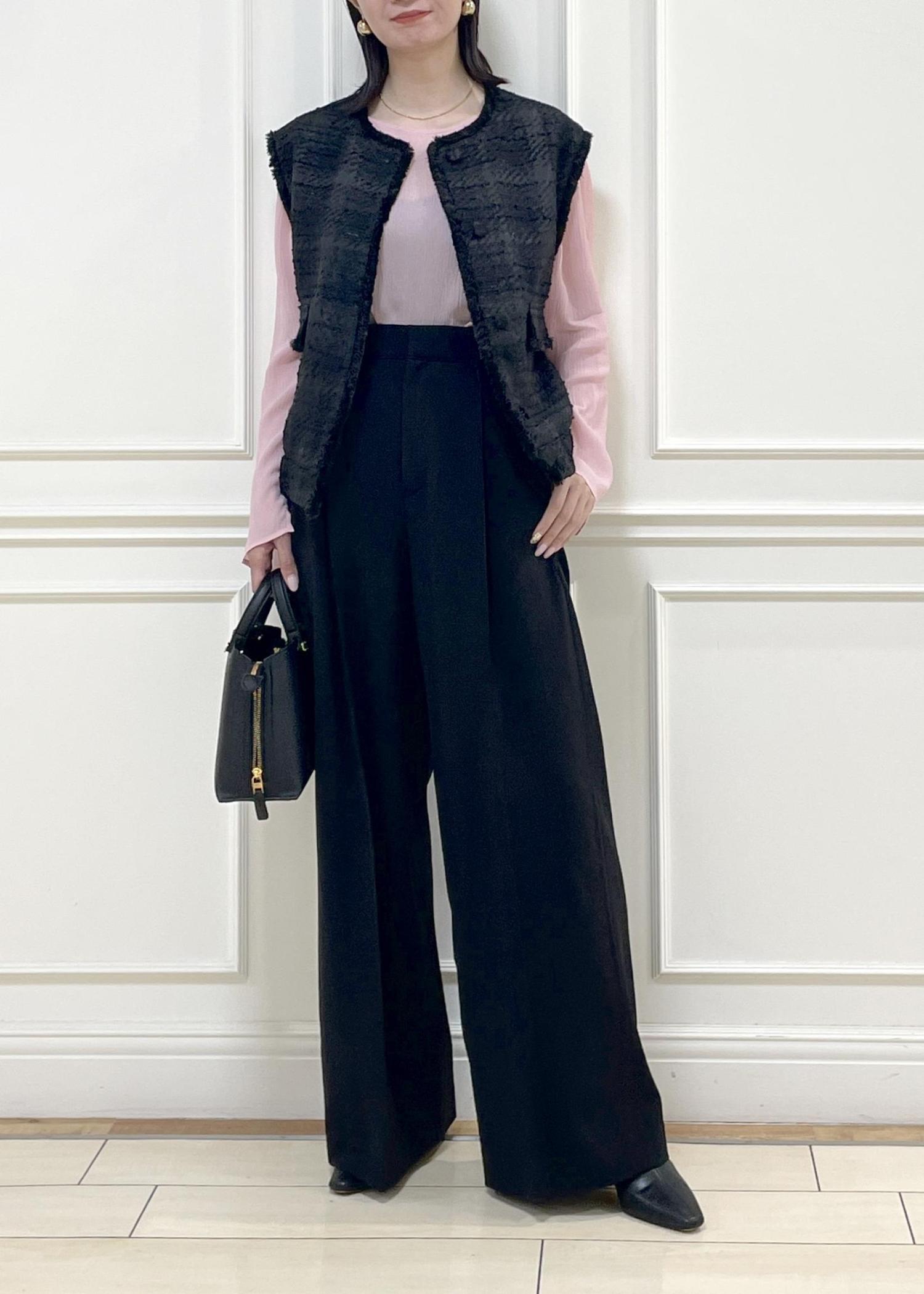 ジレはブルゾンディテールが効いており、抜け感がありながらも華やかで大人っぽい印象に仕上げてくれます。
