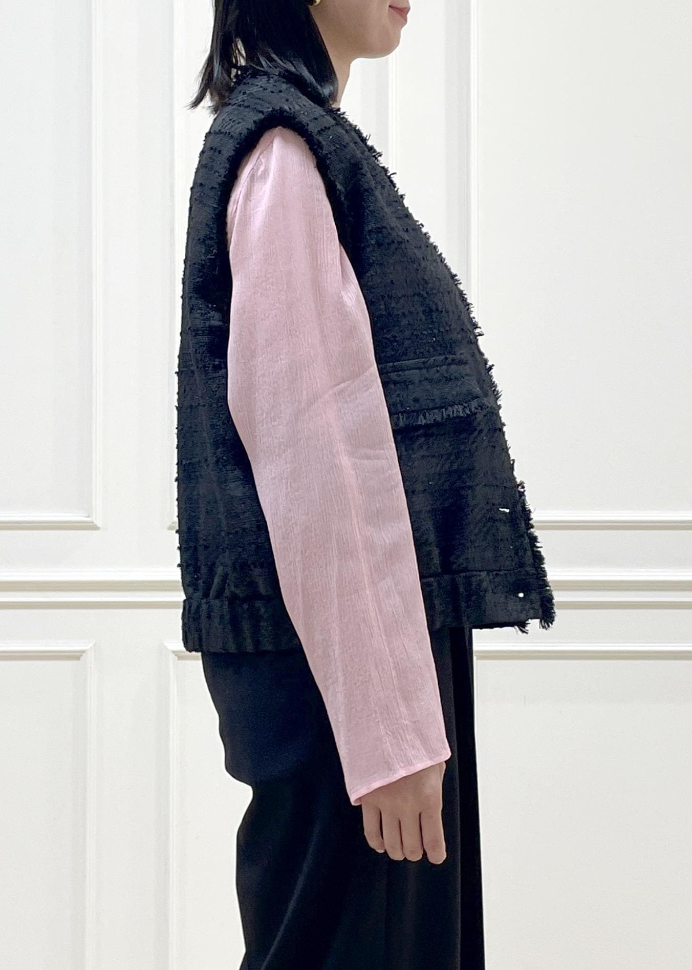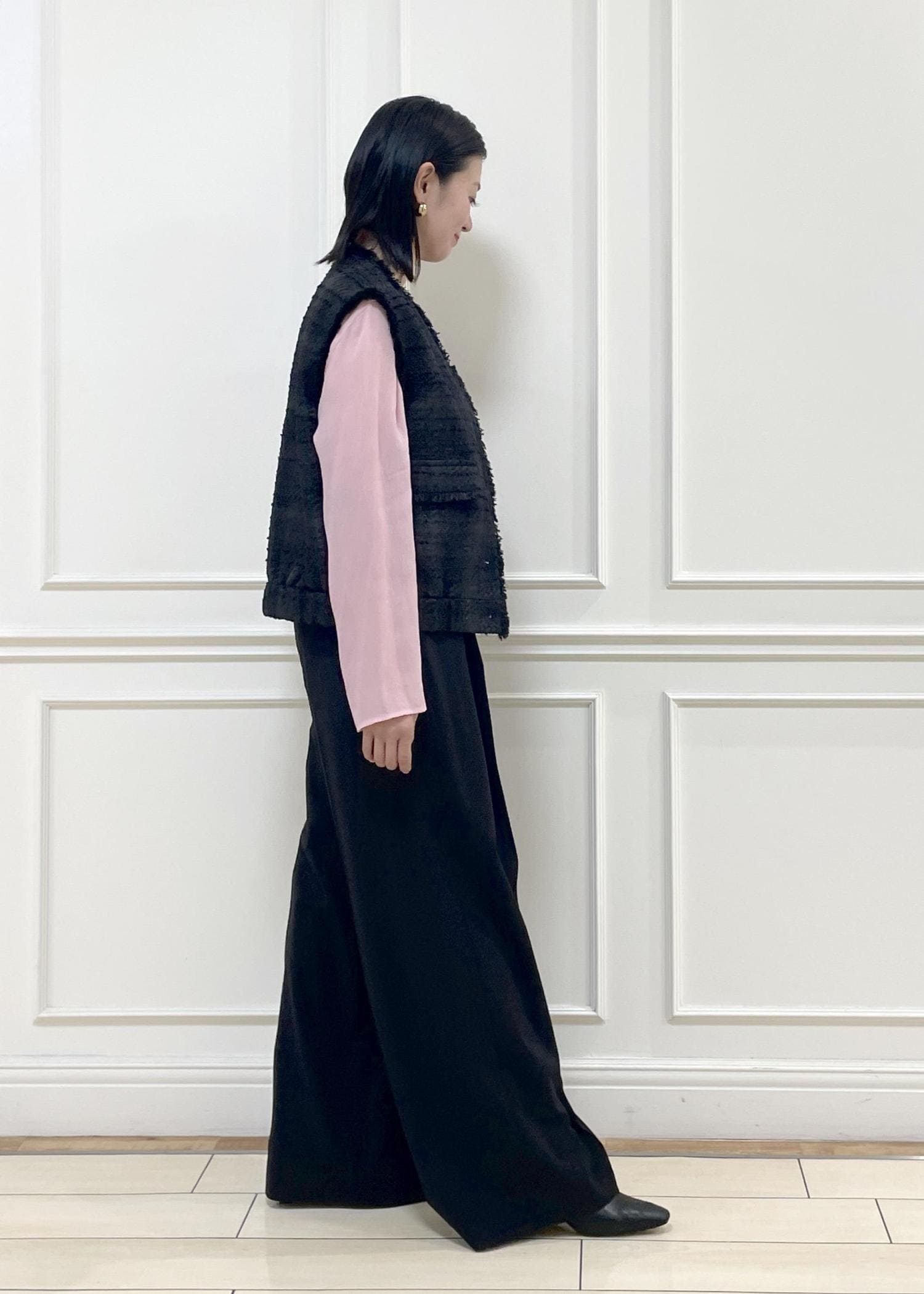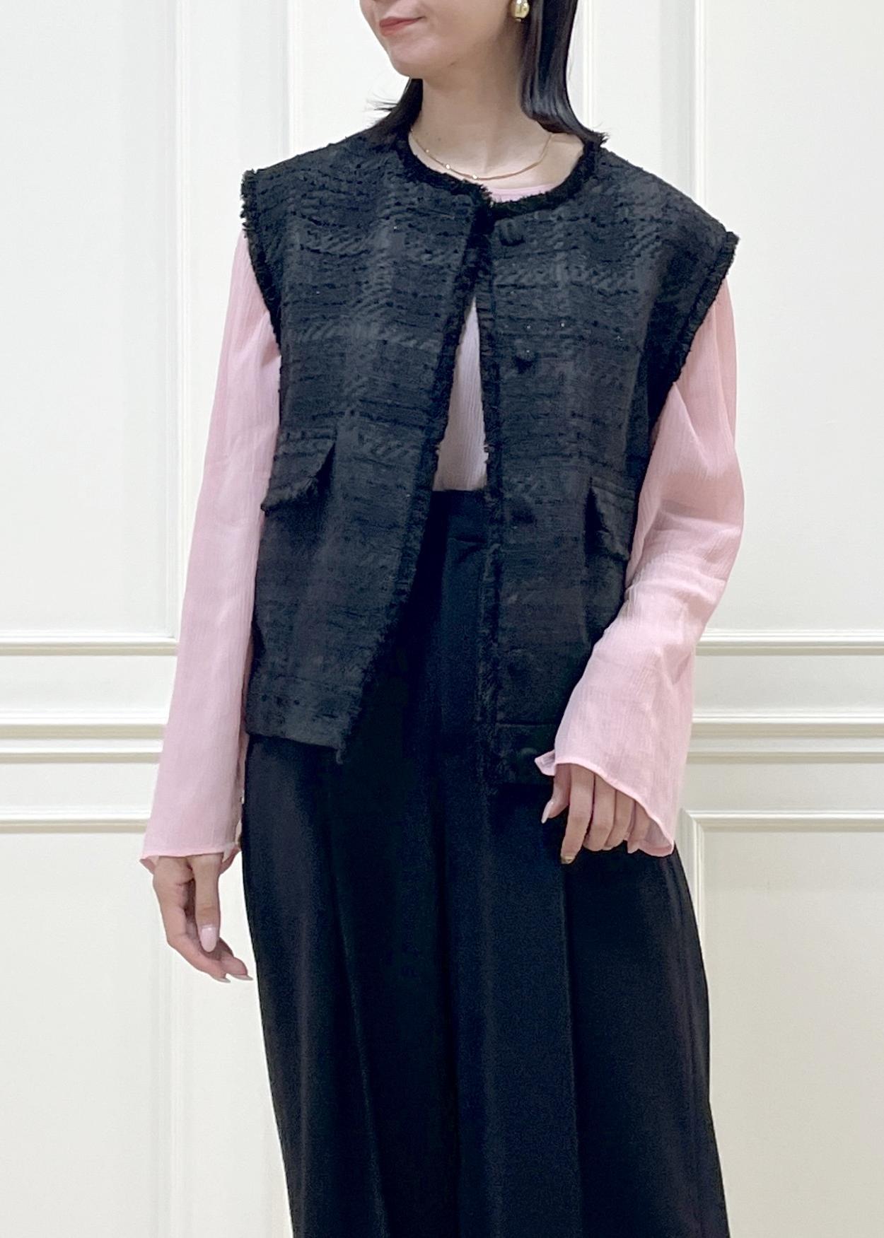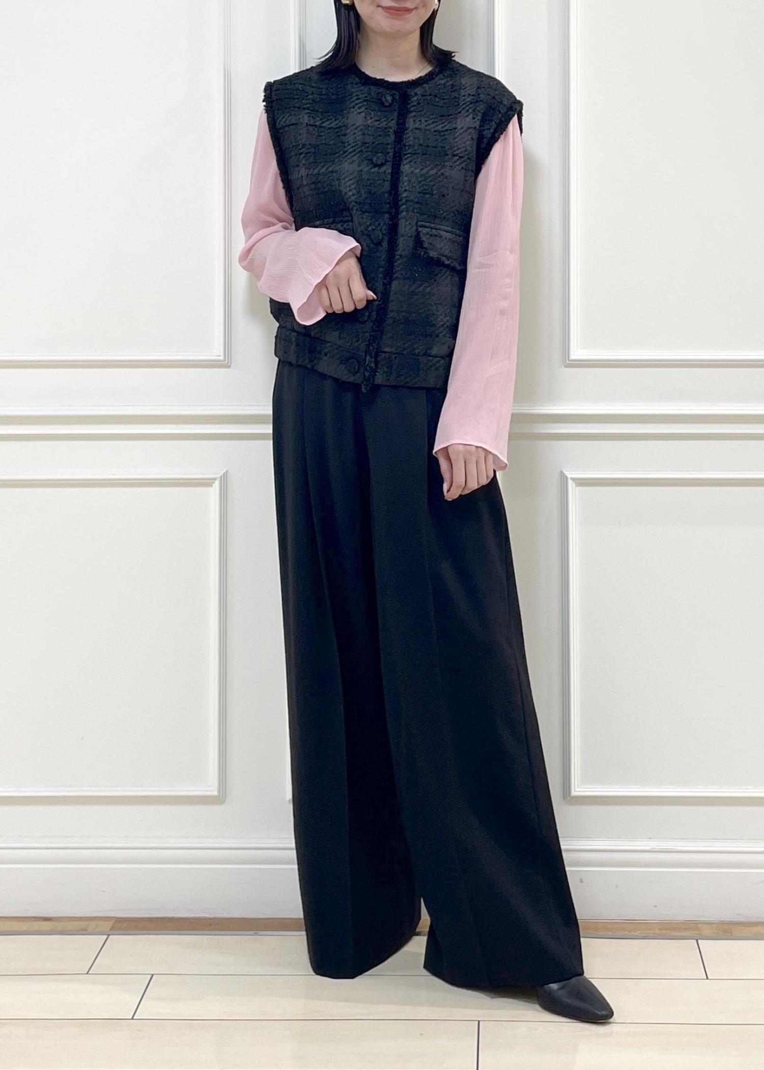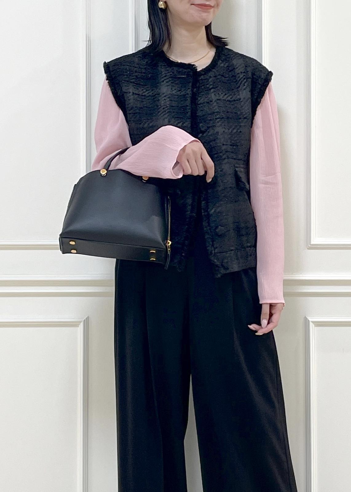 ツイード素材のジレに、シアー感が可愛いピンクのブラウスをレイヤードした綺麗目フェミニンスタイリング。