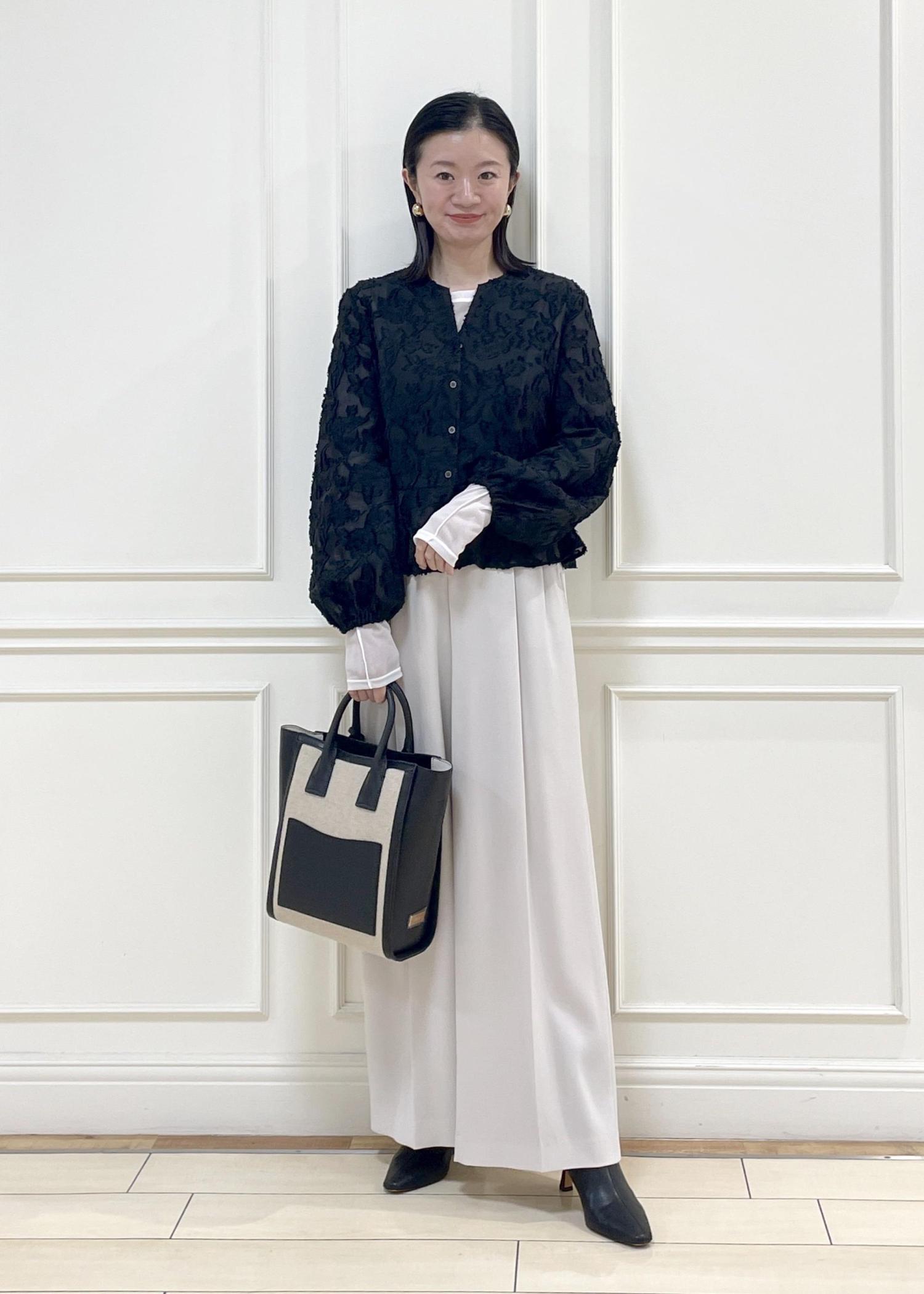 ブラウスは、上品な立体感のあるジャガード素材がフェミニンさを引き立て、シアーインナーを重ねることで抜け感もプラス。