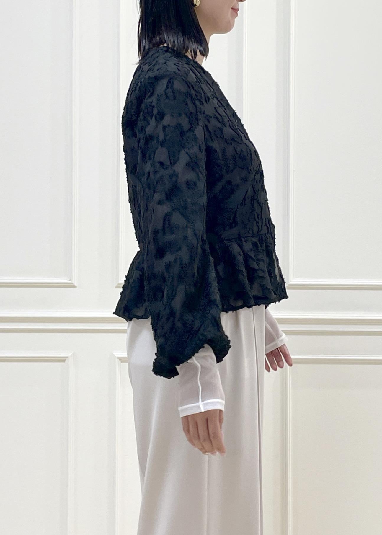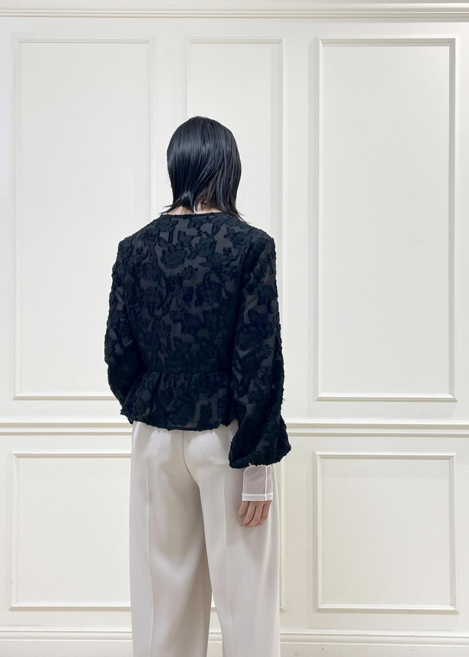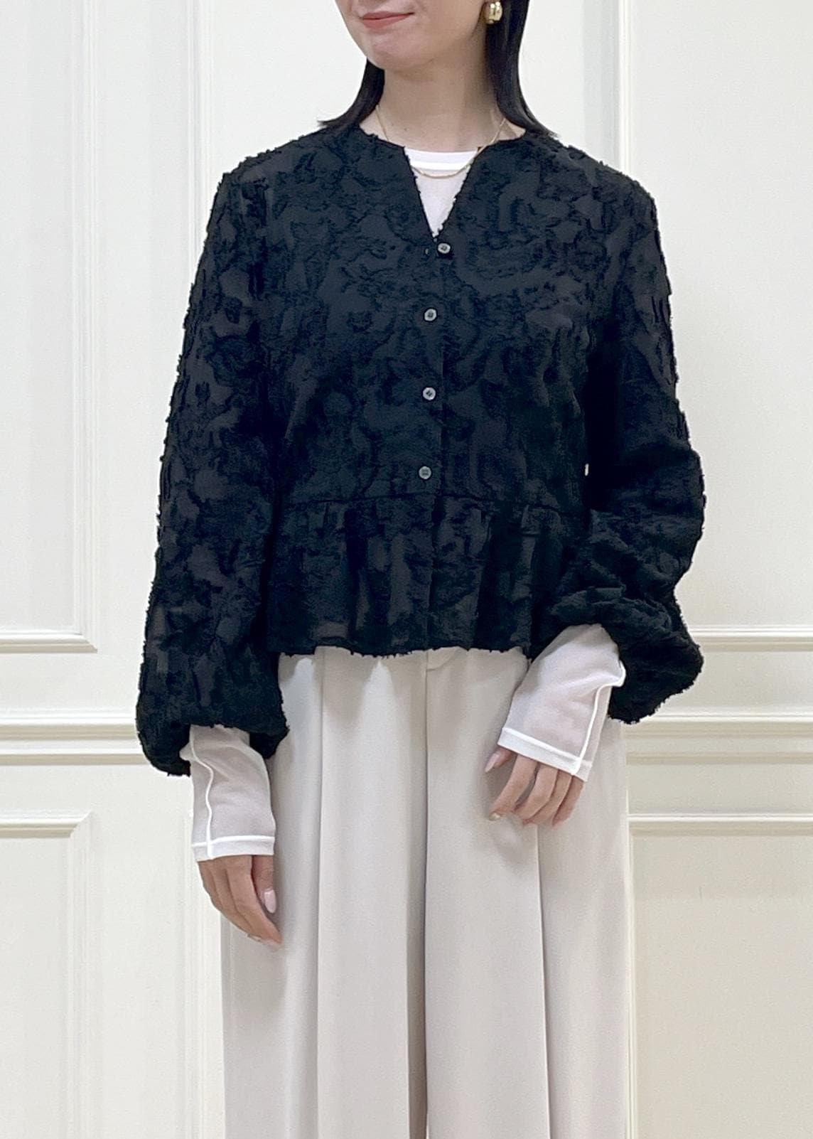 ROPÉペプラムジャガードブラウス/イージーケアブラック / F¥25,300レビュー身幅や袖周りにゆとりを持たせた、リラックス感のあるシルエットが魅力のブラウス。
