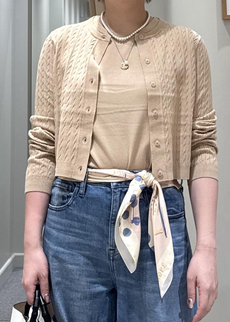 カーディガンは、ショート丈でややコンパクトなサイズ感。インナーは袖のあるアイテムと重ねるよりは