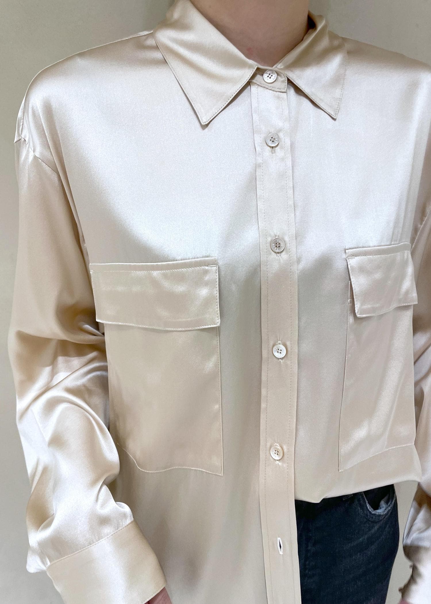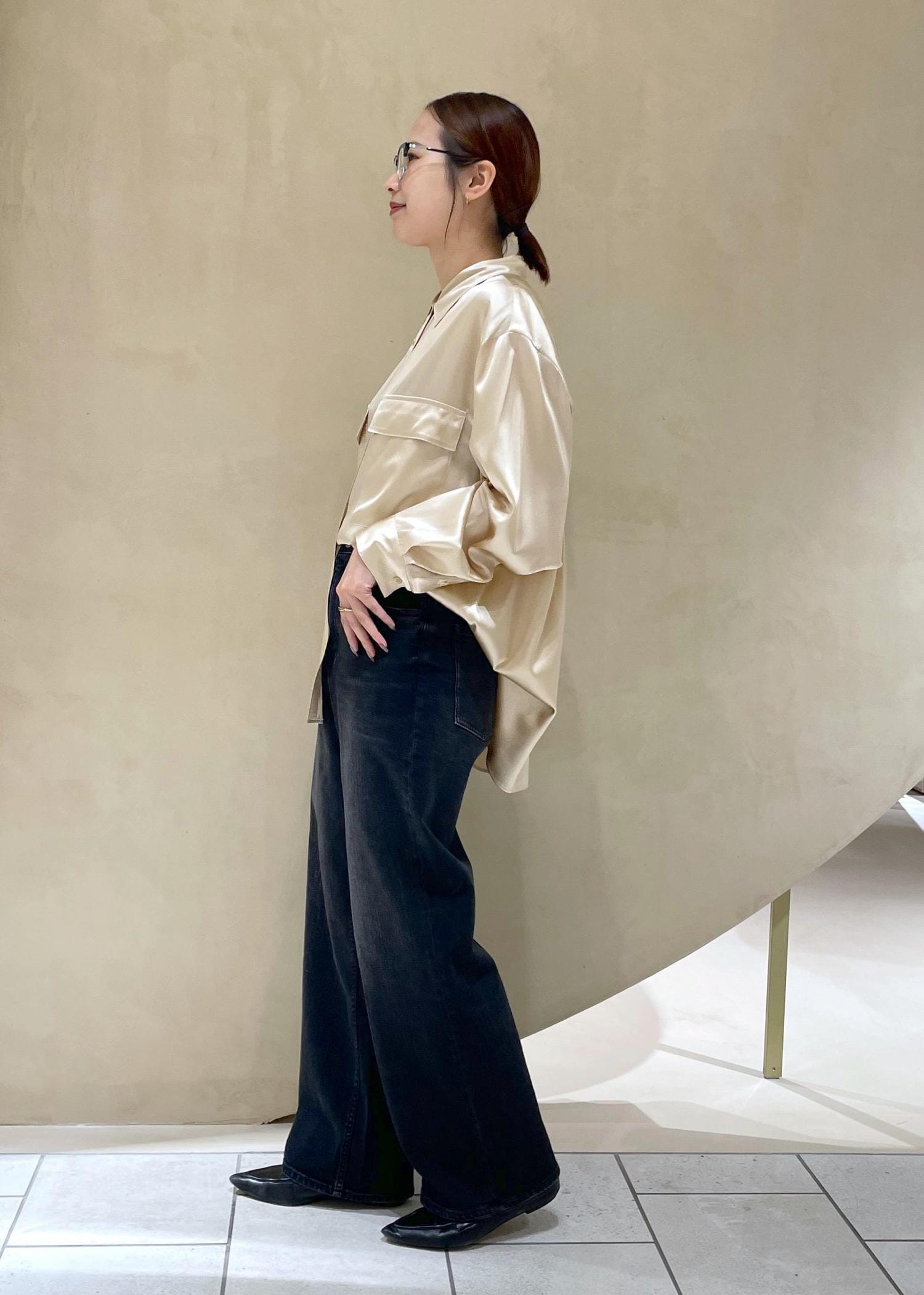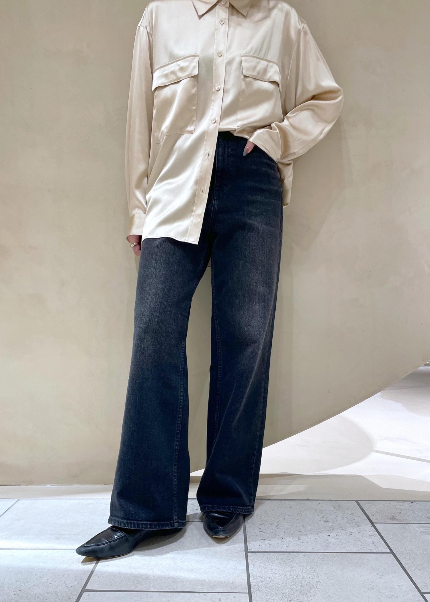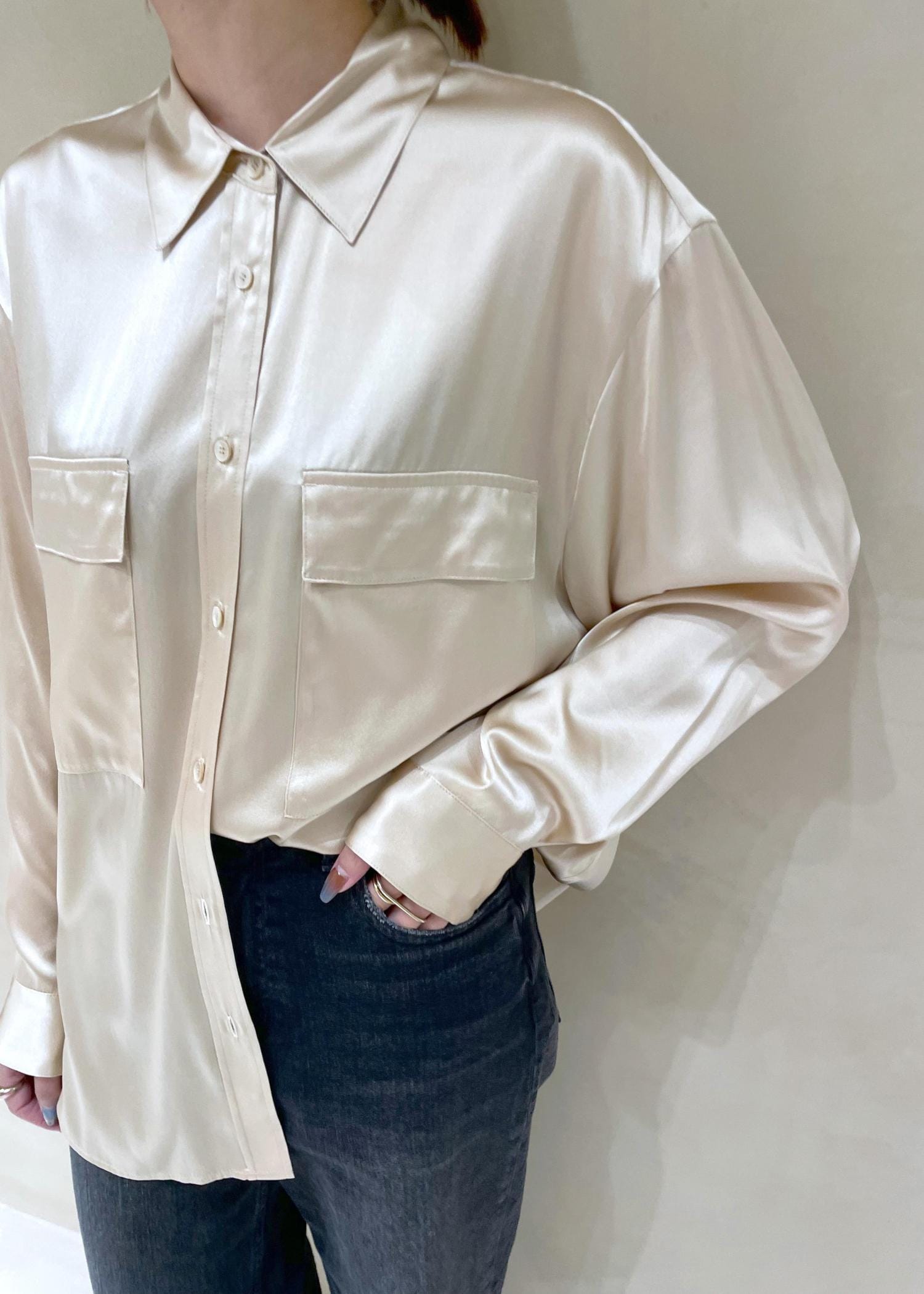 デニムと合わせてもシルクの光沢感があるので女っぽい印象に。