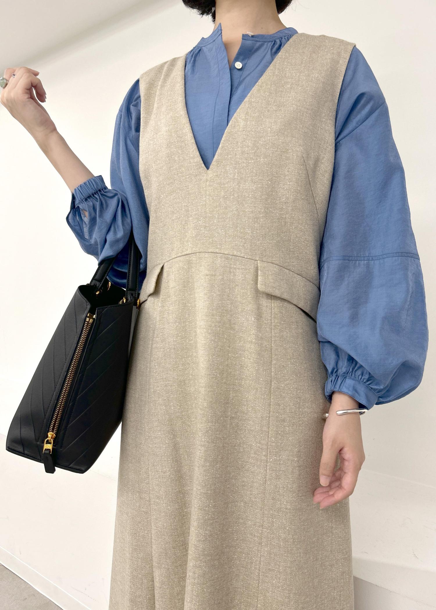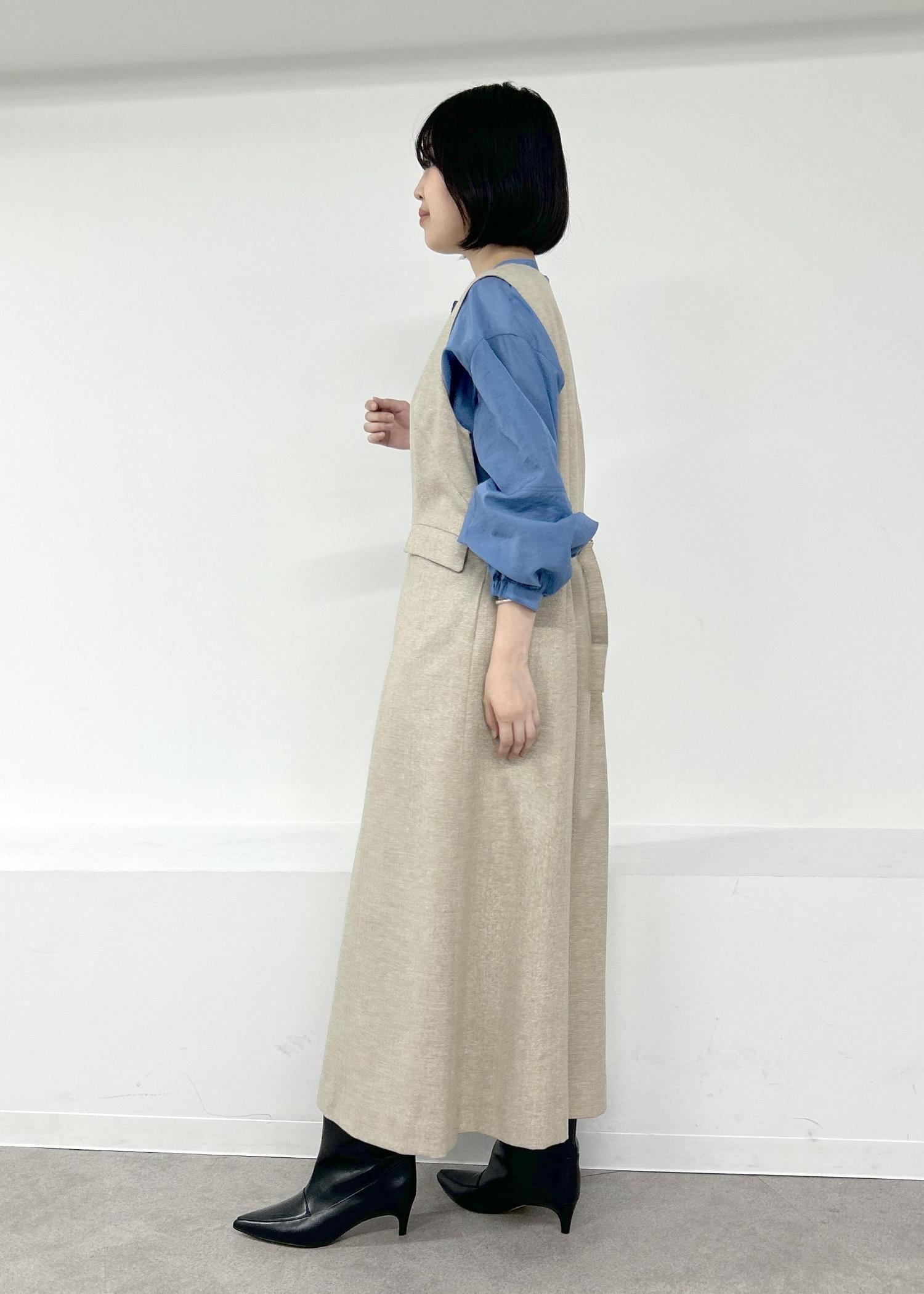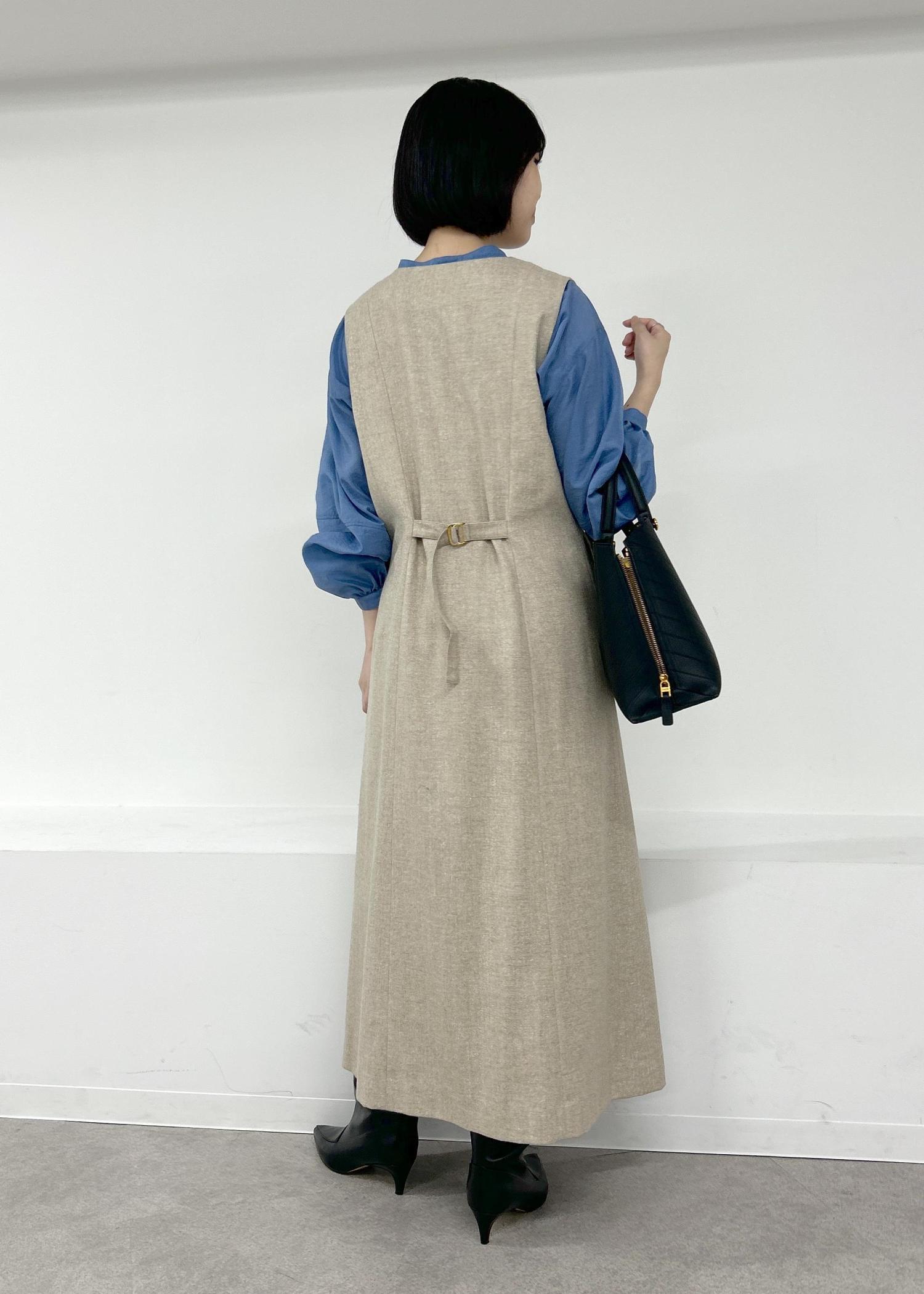 ROPÉスノーツイードジャンパースカート/イージーケアベージュ / F¥30,800レビュー着丈は足首が見えるくらいの長さです。Vネックのデザインが顔まわりをすっきり見せてくれます。ウエスト切り替え位置が高めなのでスタイルアップ効果もあり、後ろのベルトでウエストの調節もしていただけます。