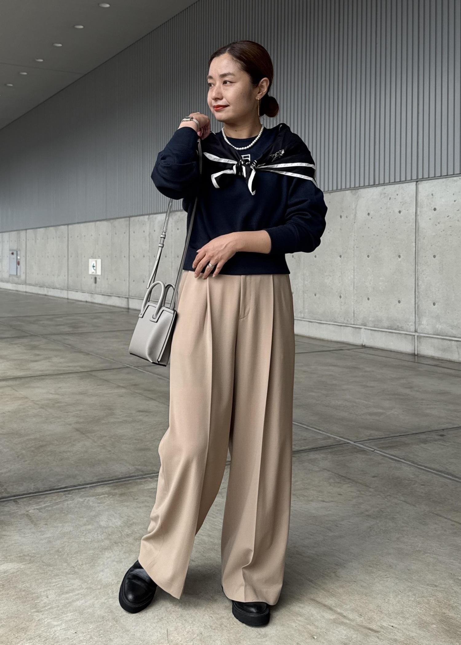落ち感のあるワイドパンツで女性らしさをプラスして