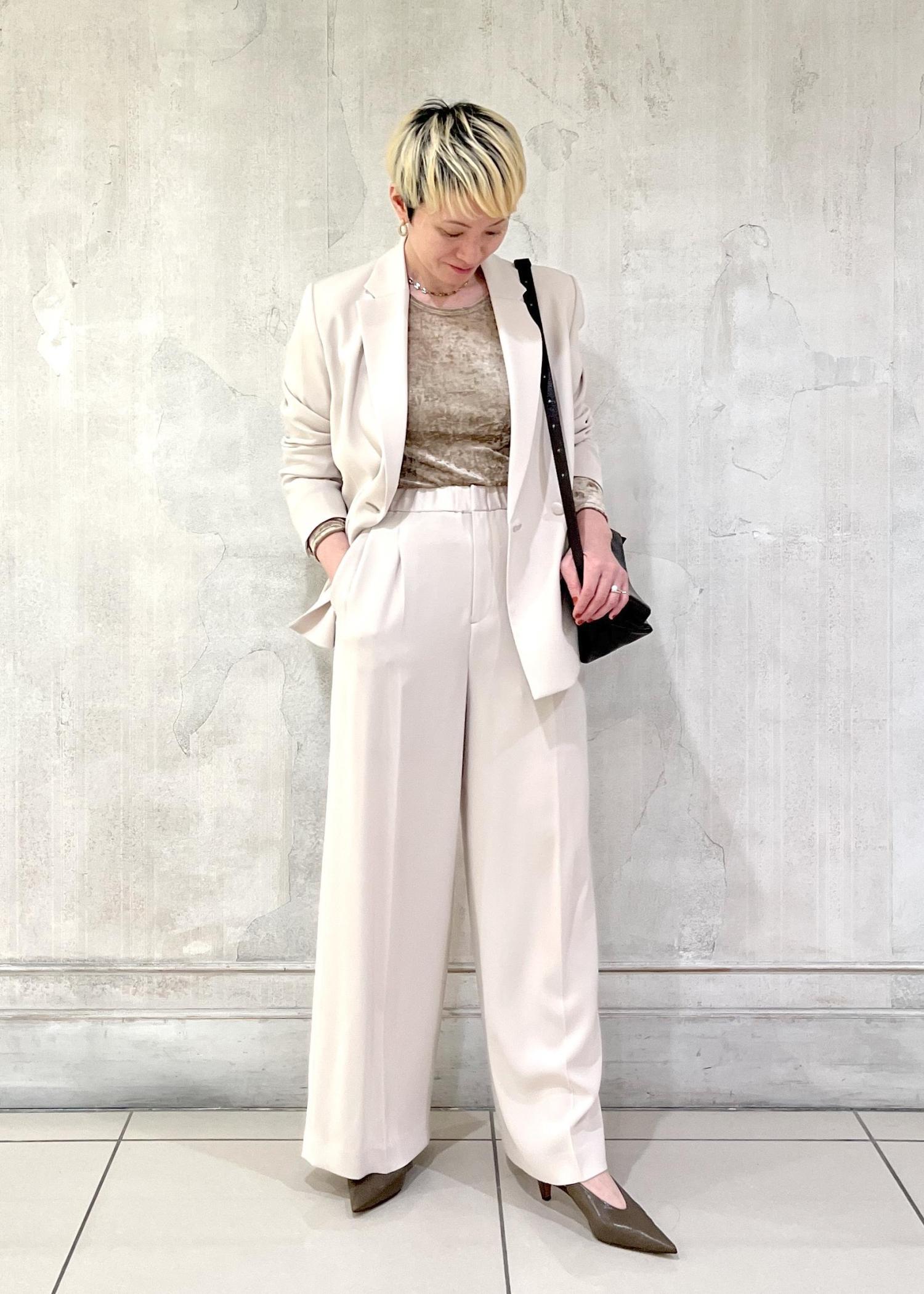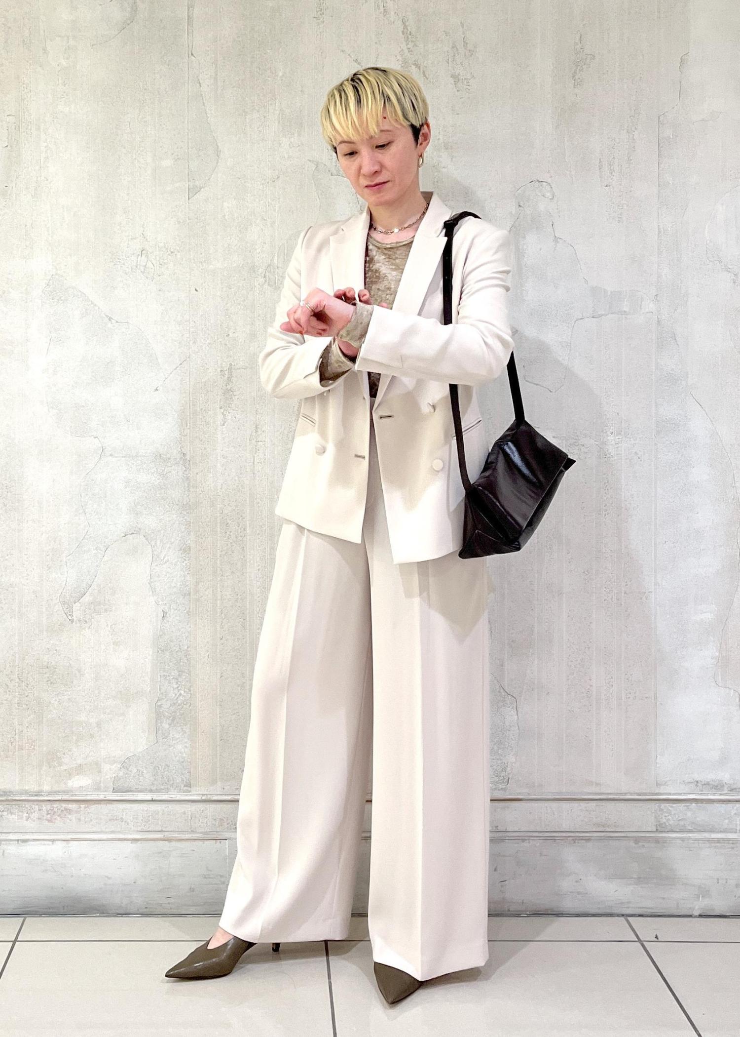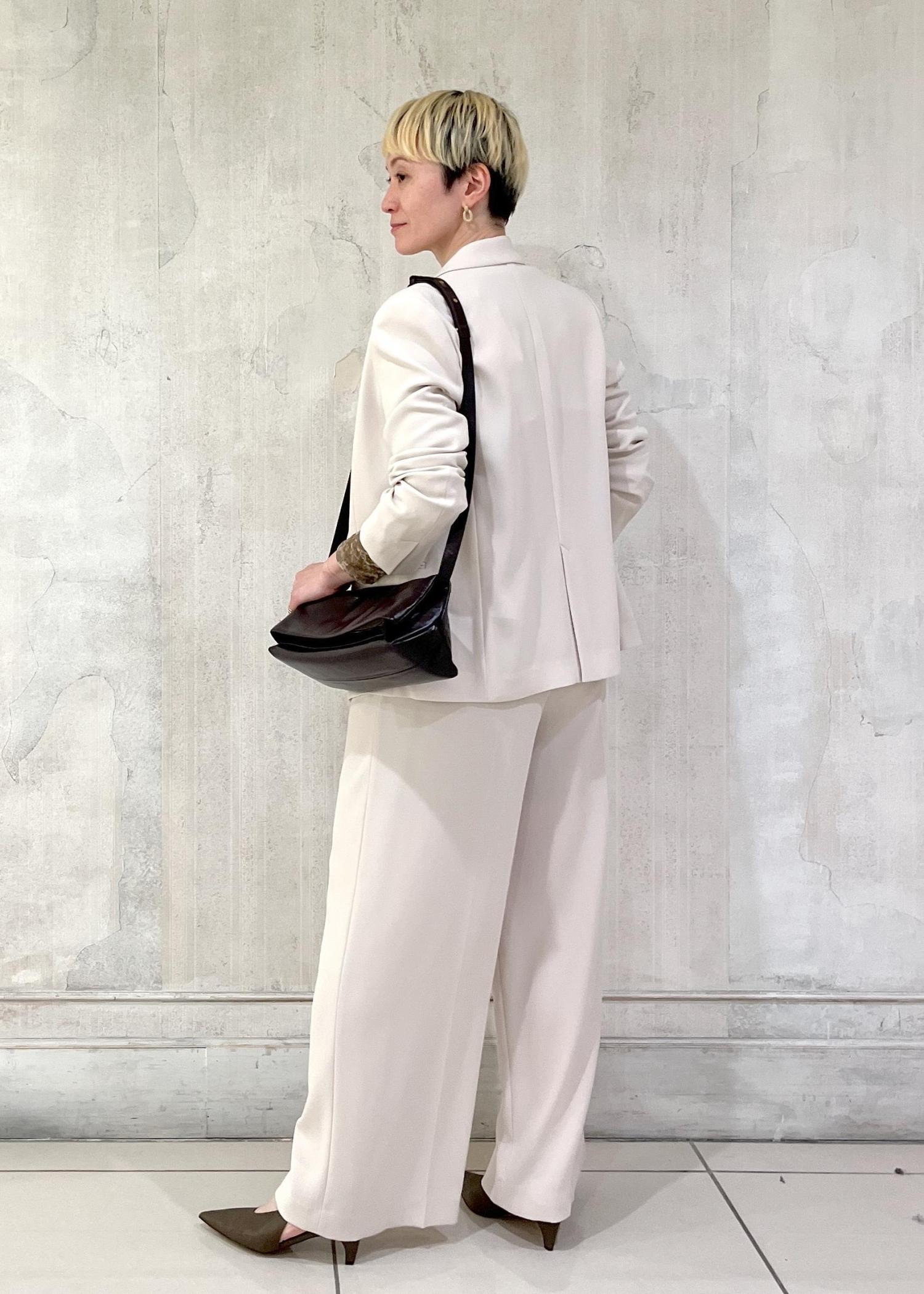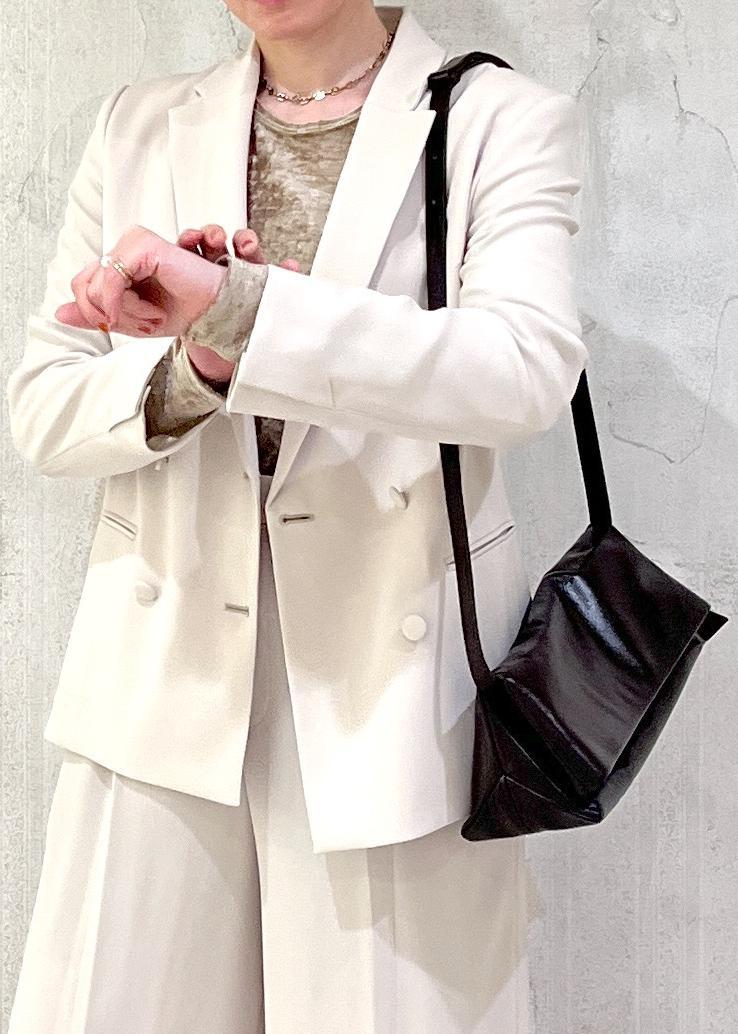 シワにもなりにくいので、長時間の持ち歩きにも安心。同素材のワイドパンツ合わせもオススメです。