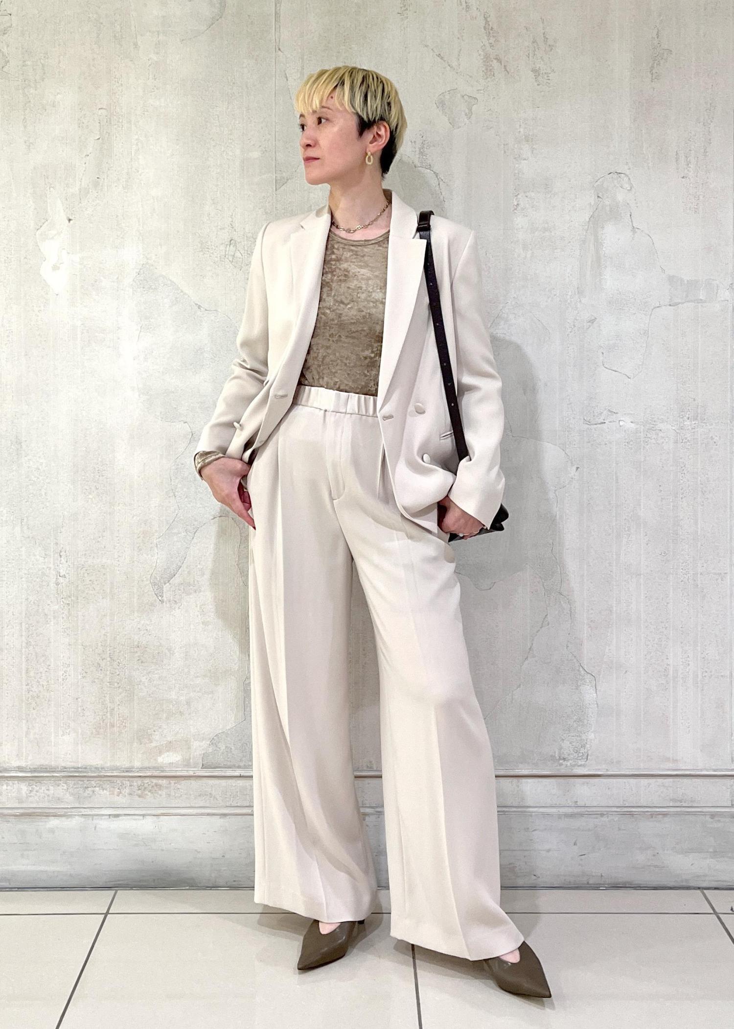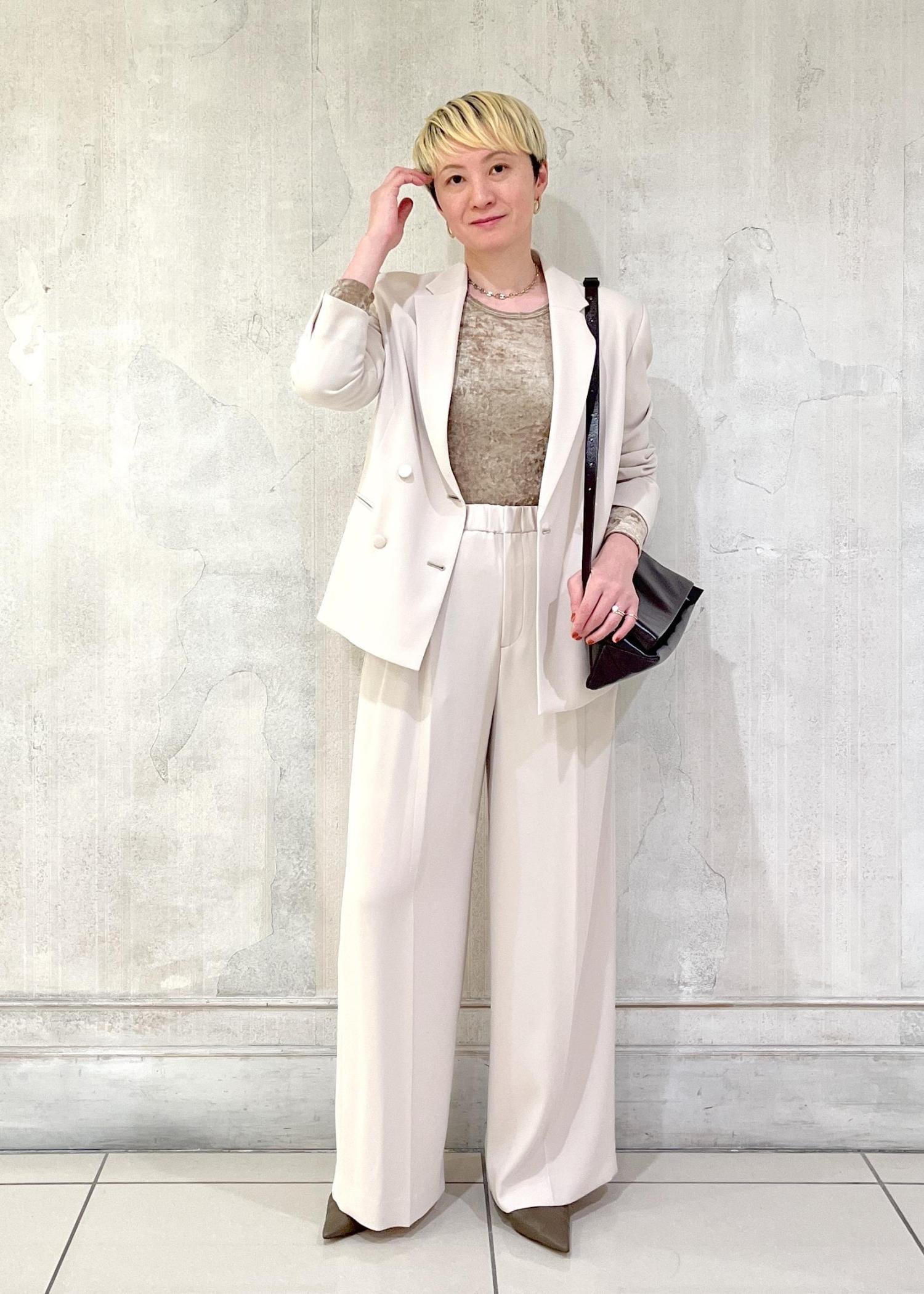 柔らかな落ち感がエレガントなダブルジャケット。くるみボタンが優しげな印象をプラスしてくれます。