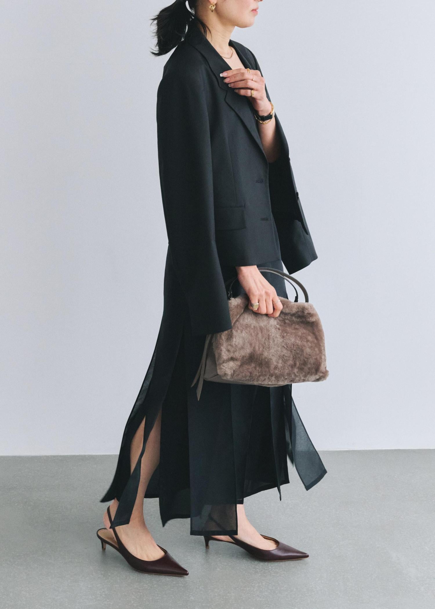 程よいシアー感と上品な光沢感が魅力の軽やかなスカート。ウエストからヒップ部分まではスッキリとしたラインで、動くたびに揺れるラインが美しいです。季節が進んだ時にはロングブーツを合わせても◎
