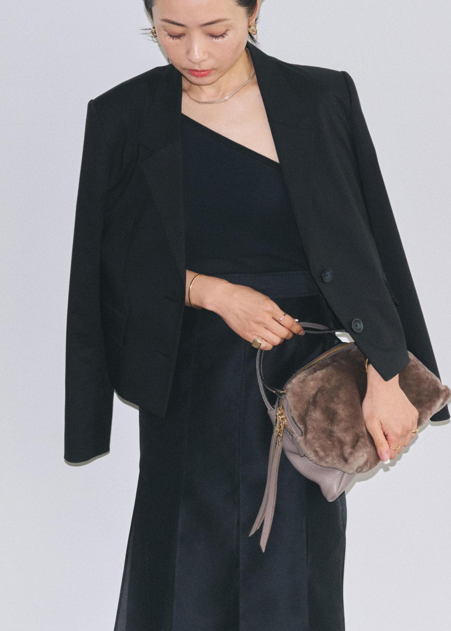 コンパクトなクロップドジャケット。小さめな見た目とは裏腹に、しっかりと肩、バストが入る立体的なフォルムとストレッチ性ある素材。腕周りの可動域が非常にあり、非常に軽やかなジャケット。