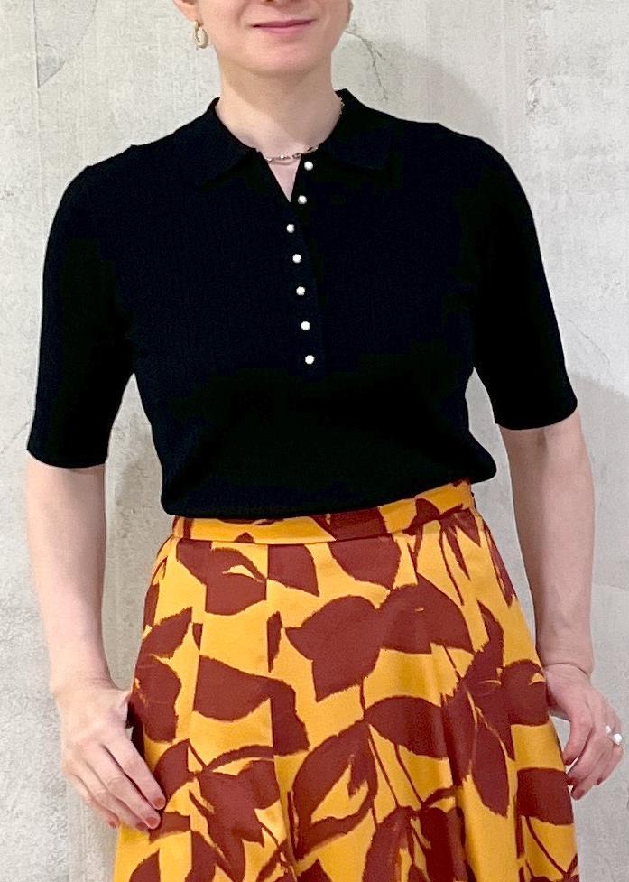 ROPÉパール釦ポロニット/イージーケアブラック / F¥19,800レビューメリノウール100%の柔らかなリブニット。小粒のパールボタンが華奢見えしてエレガントな印象に。