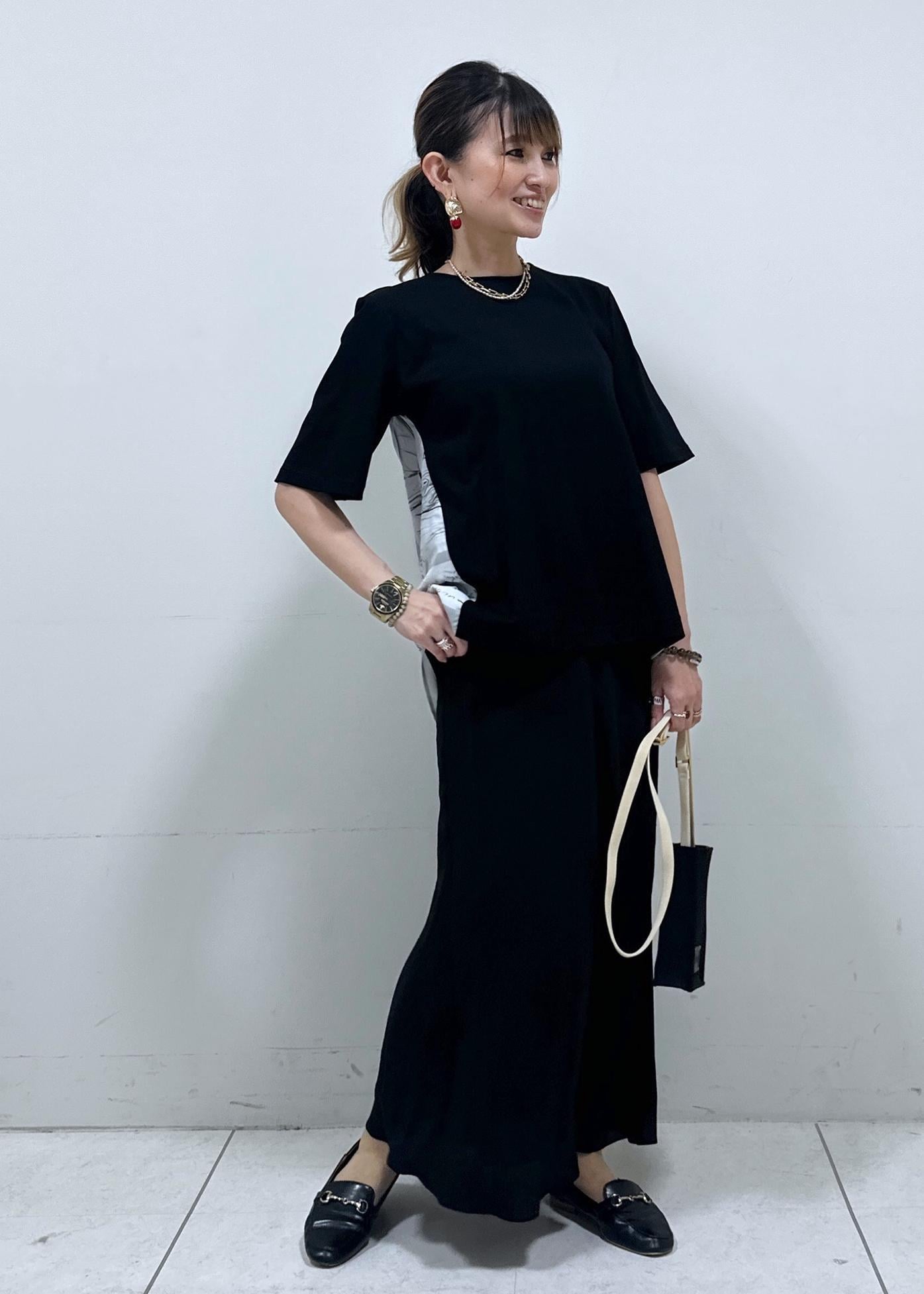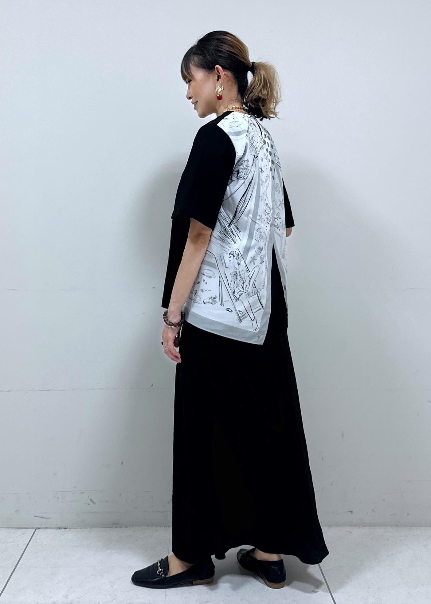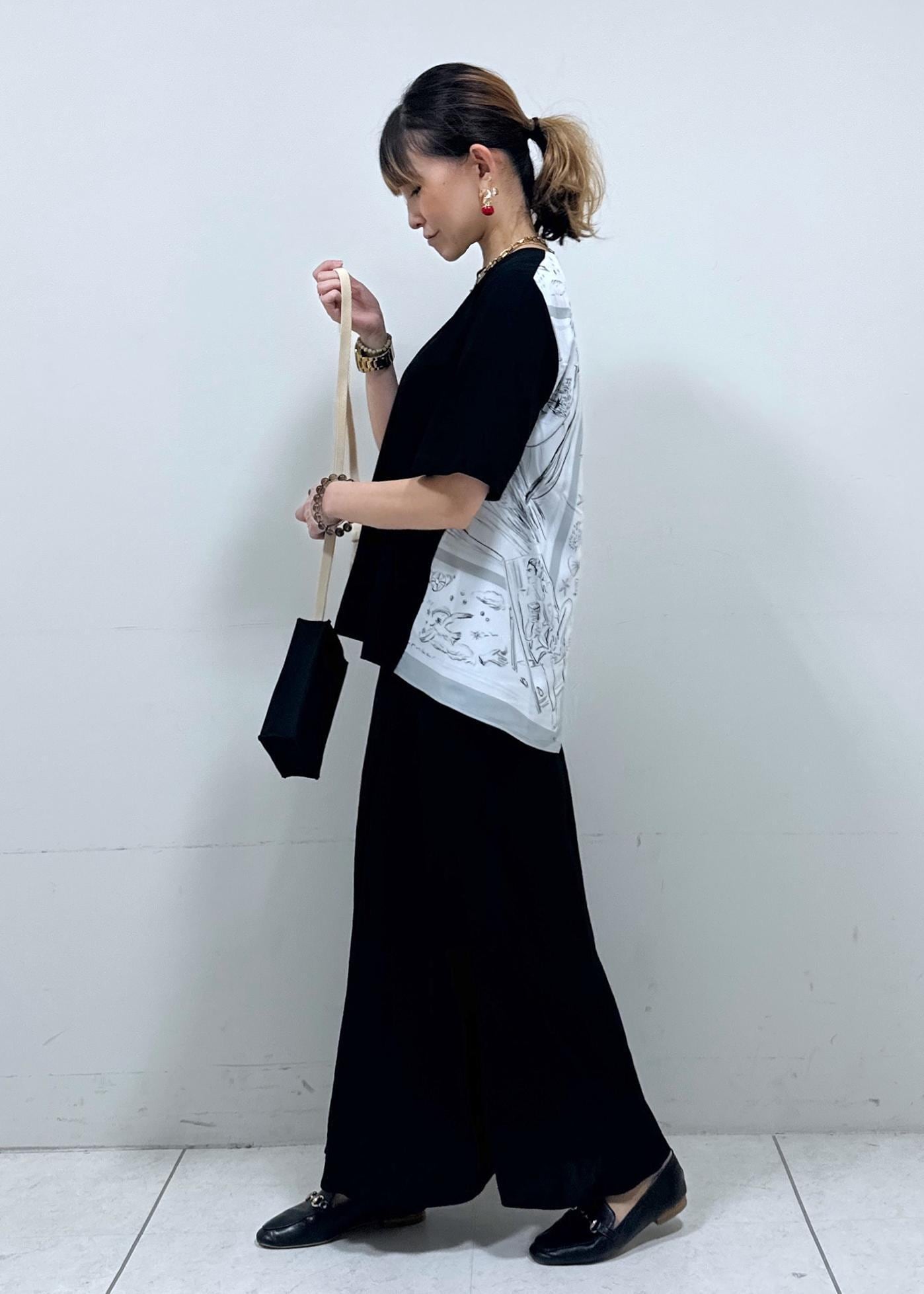 バックスタイルに、スカーフ柄の組合せがインパクトのあるカットソーで、モードなモノトーンコーデにしました!