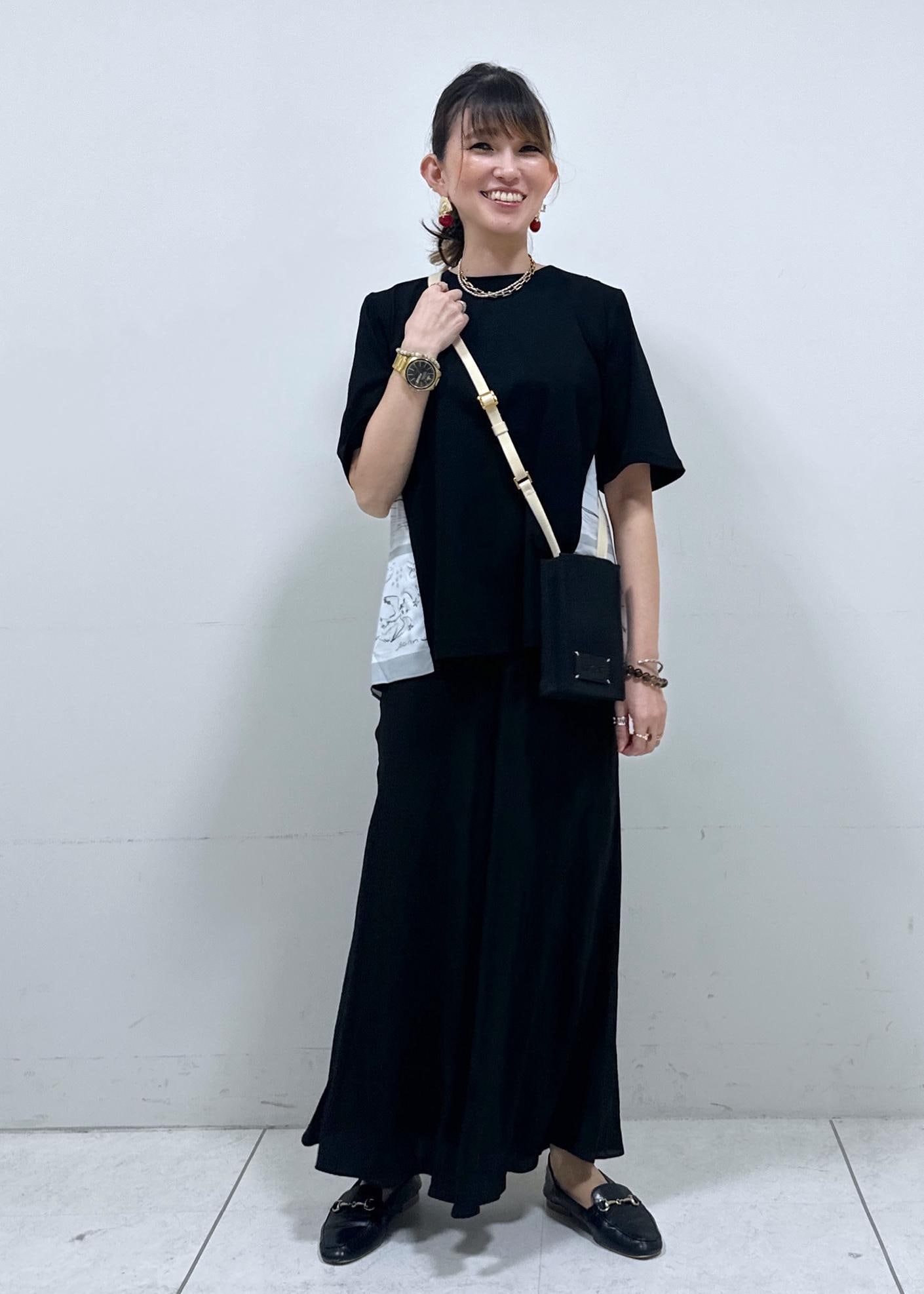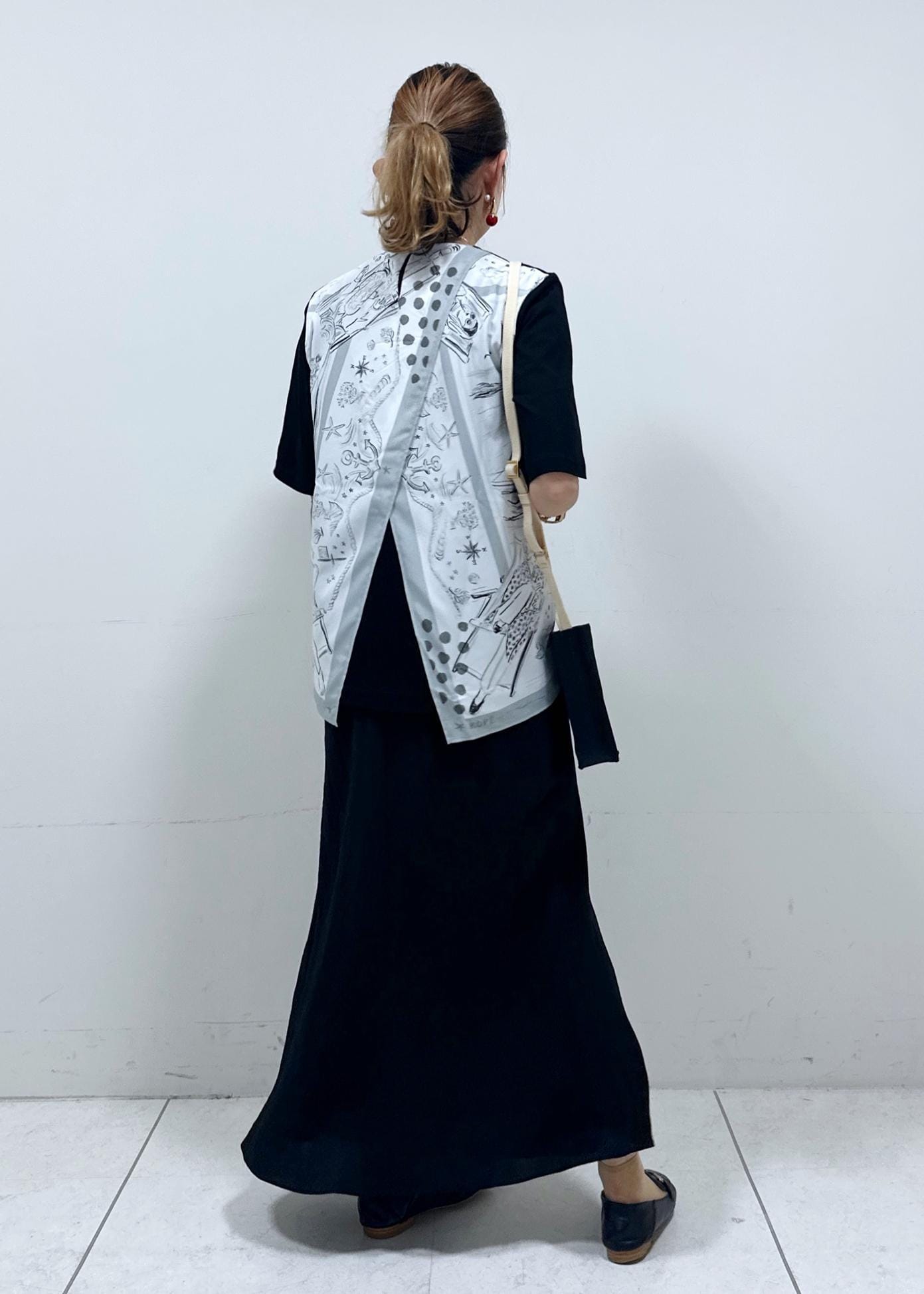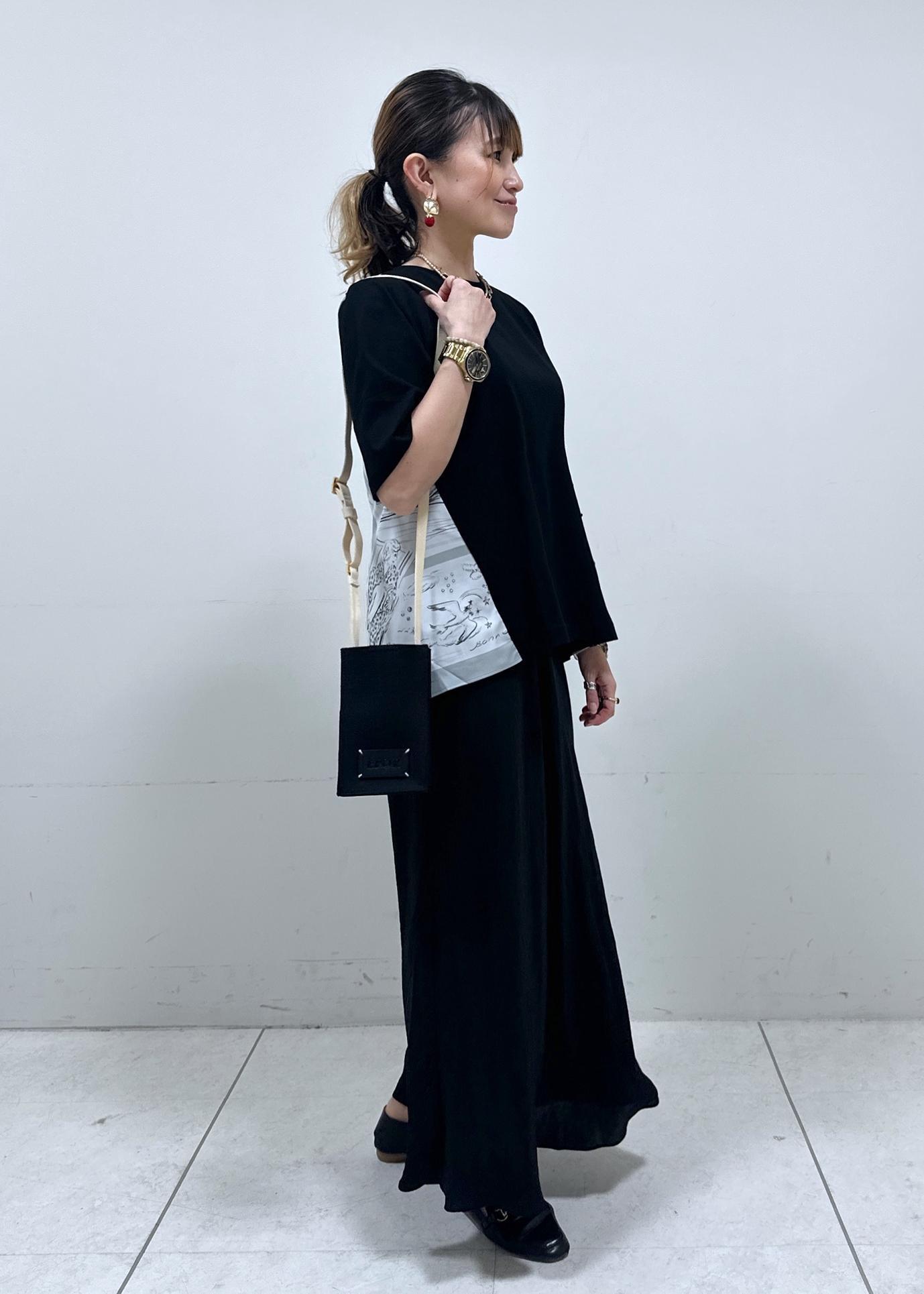 バックスタイルに、スカーフ柄の組合せがインパクトのあるカットソーで、モードなモノトーンコーデにしました!