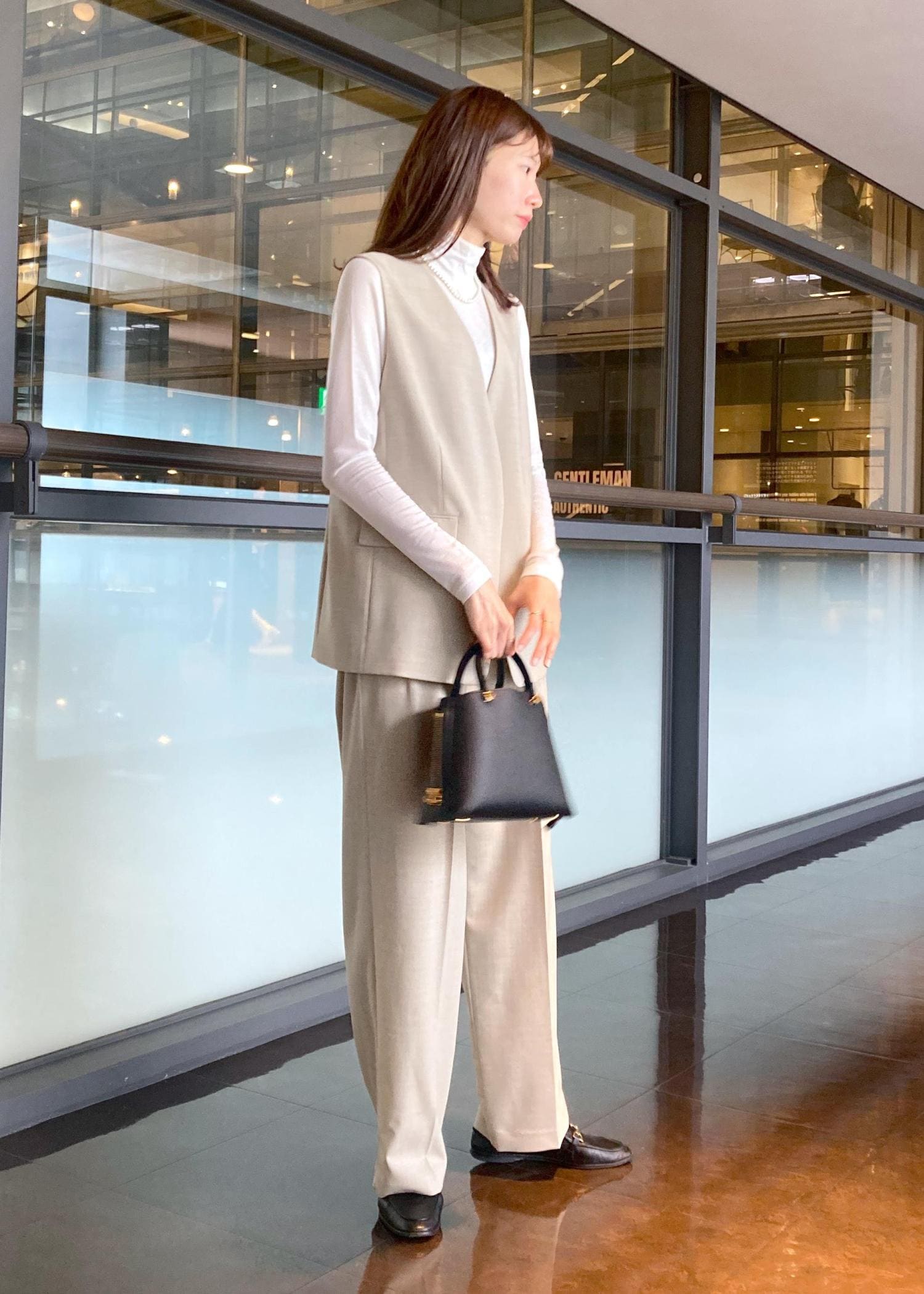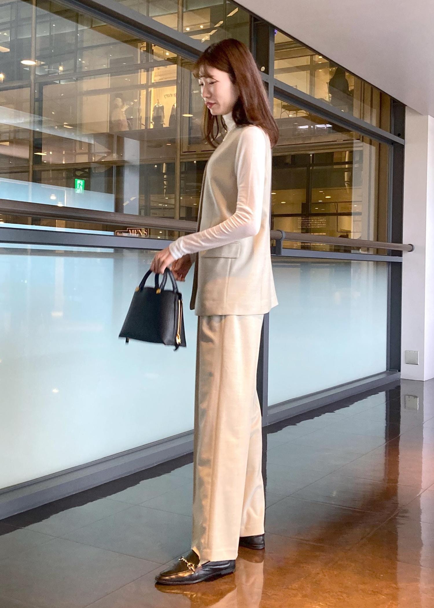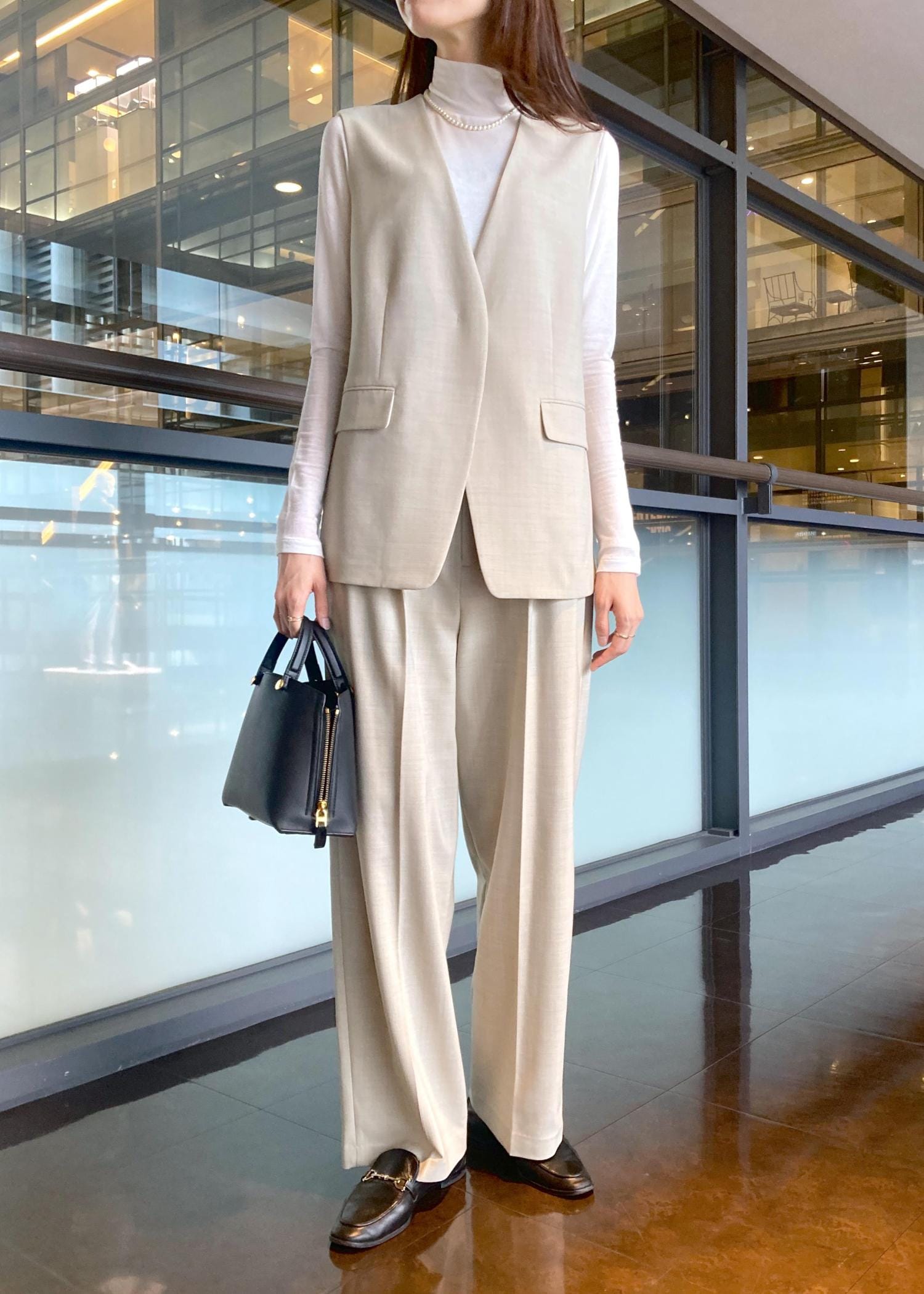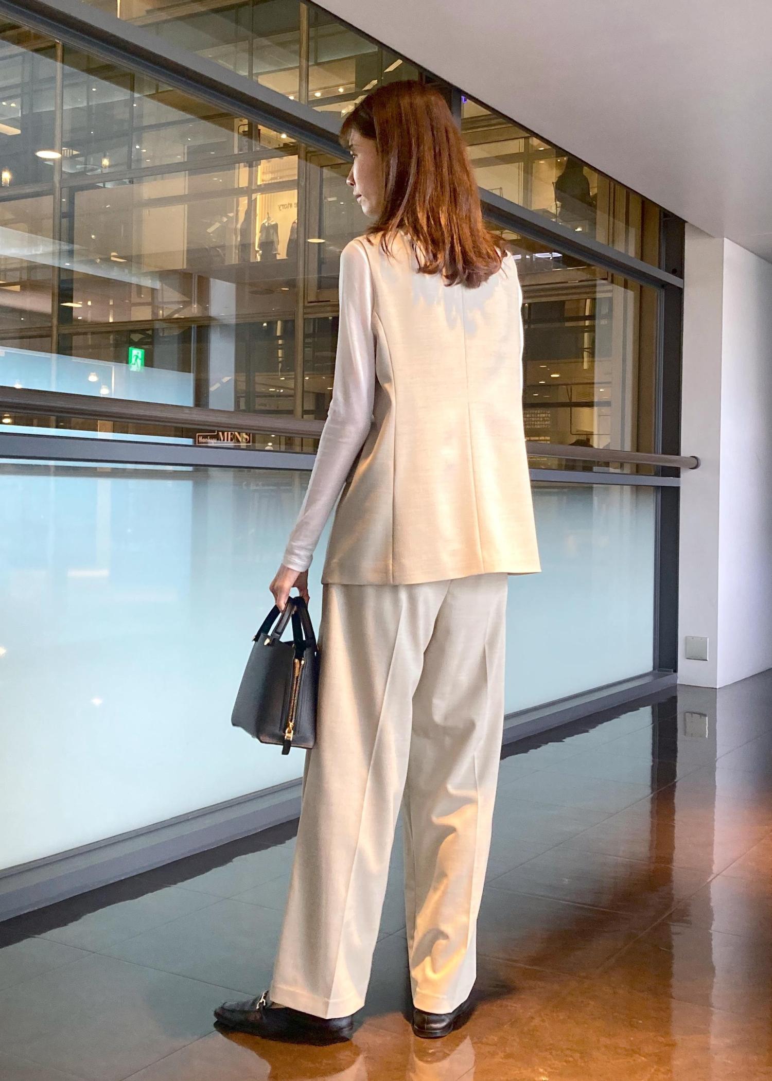 ベージュのセットアップはベーシックなスタイルながらも上品さもありオンオフ兼用で活躍するアイテムです!